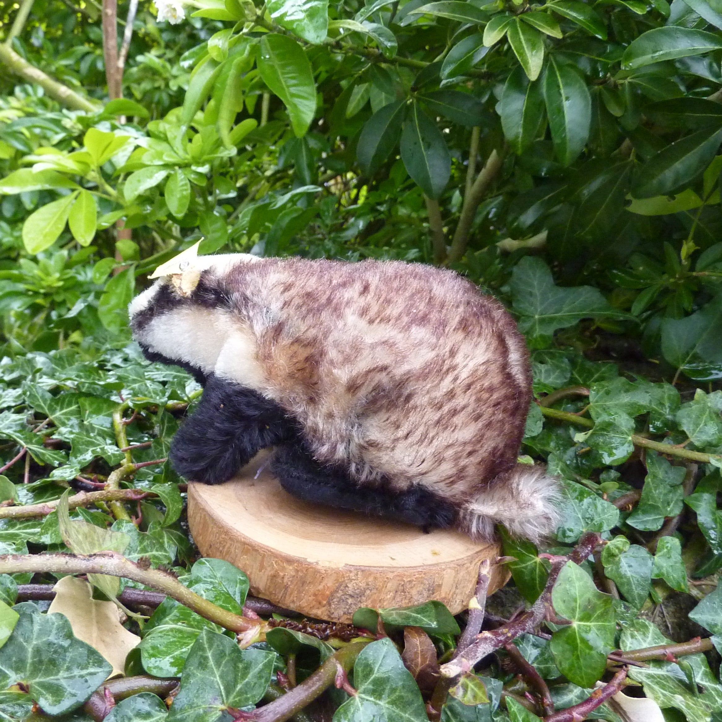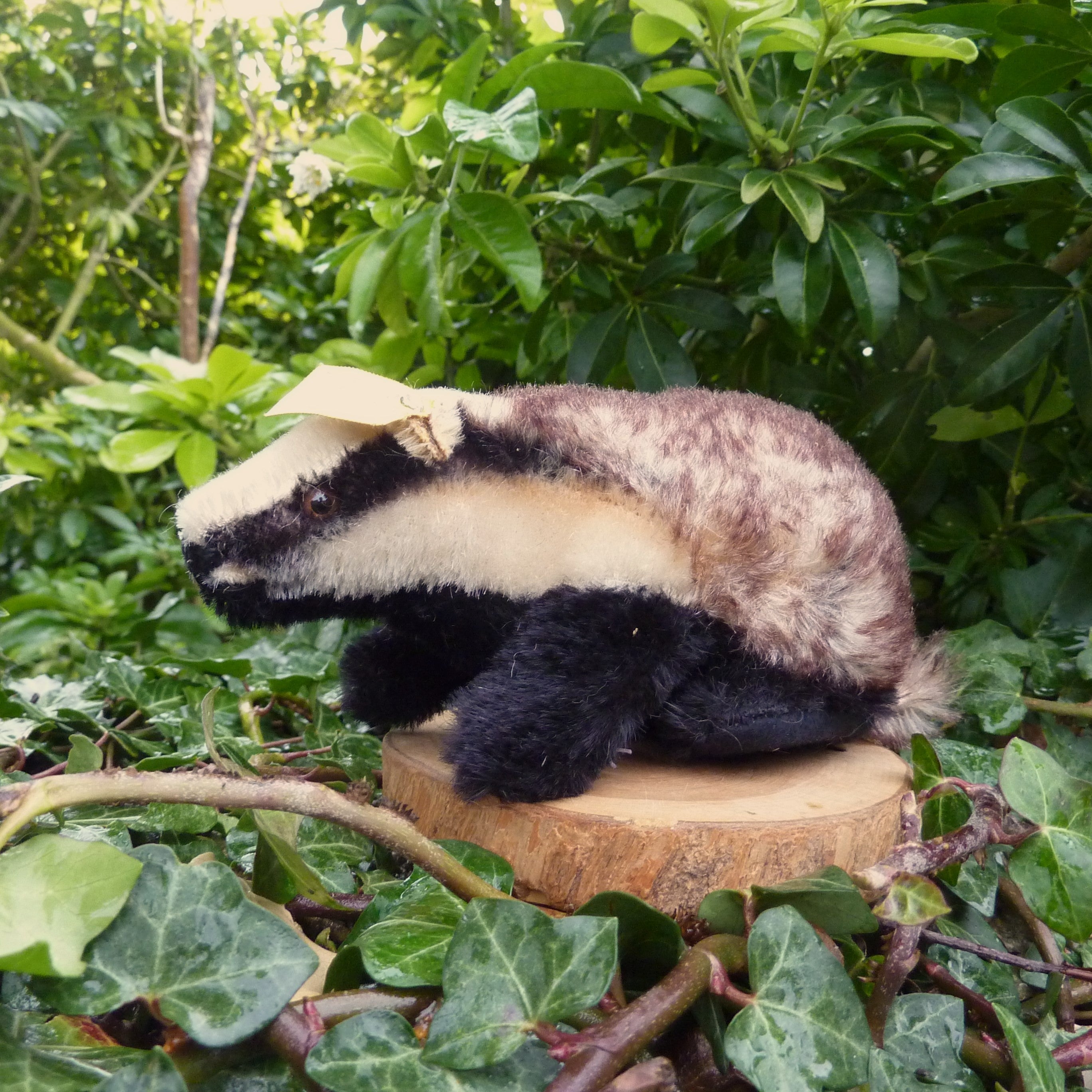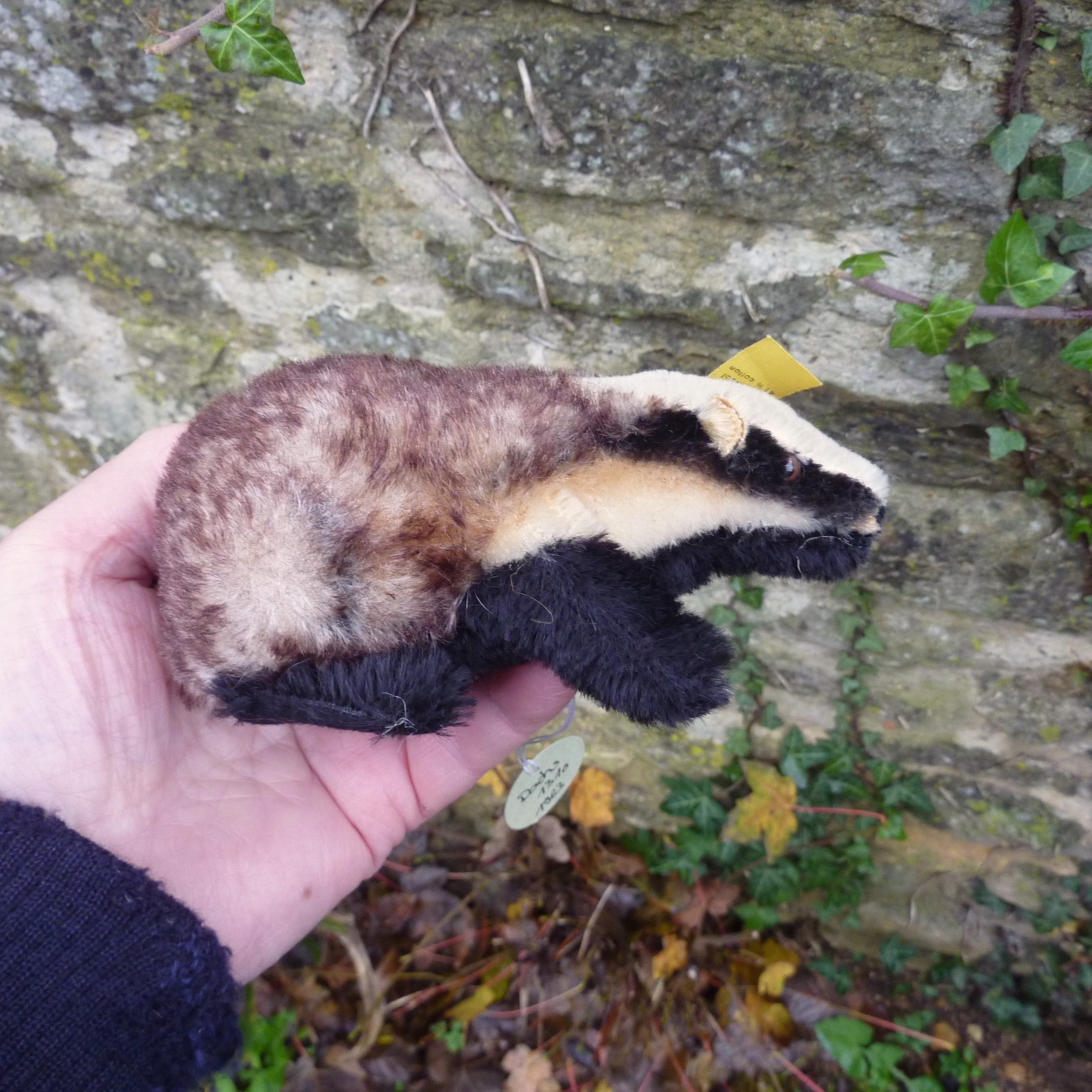 Made of white, black and brown-tipped, beige mohair with subtle airbrushed markings, this small badger has brown and black glass eyes and felt hands and feet. In excellent condition with button and full ear tag, as well as a hand-written Steiff archive label dated 1963 (see photo).