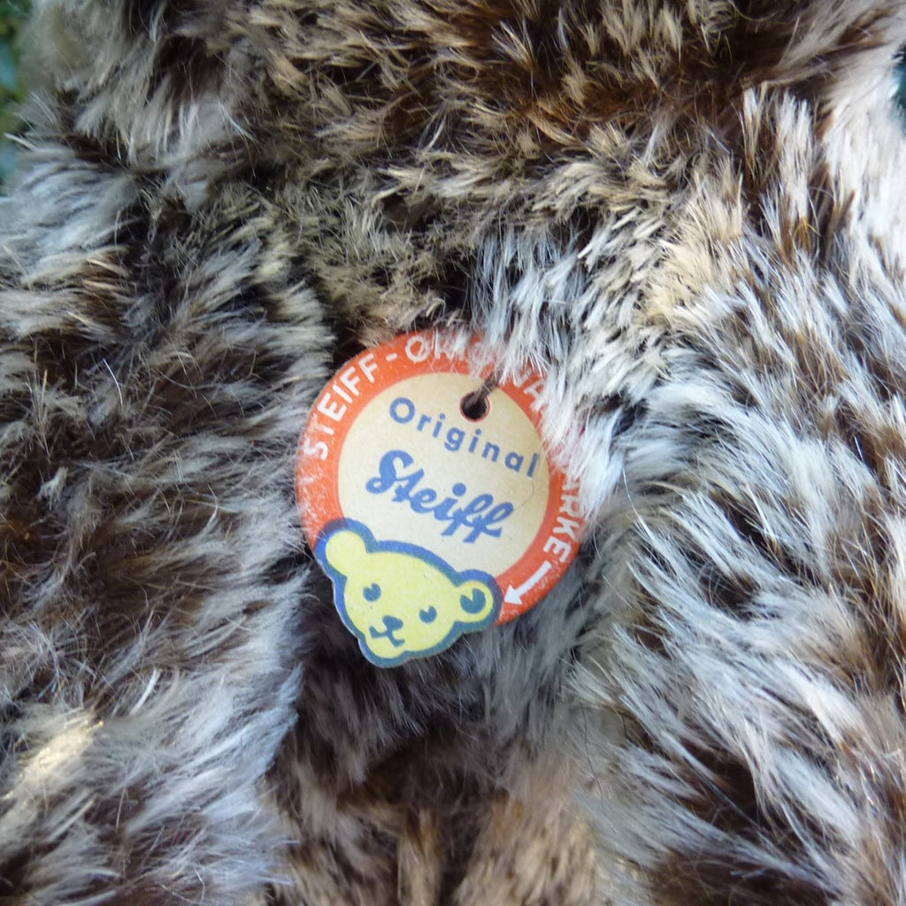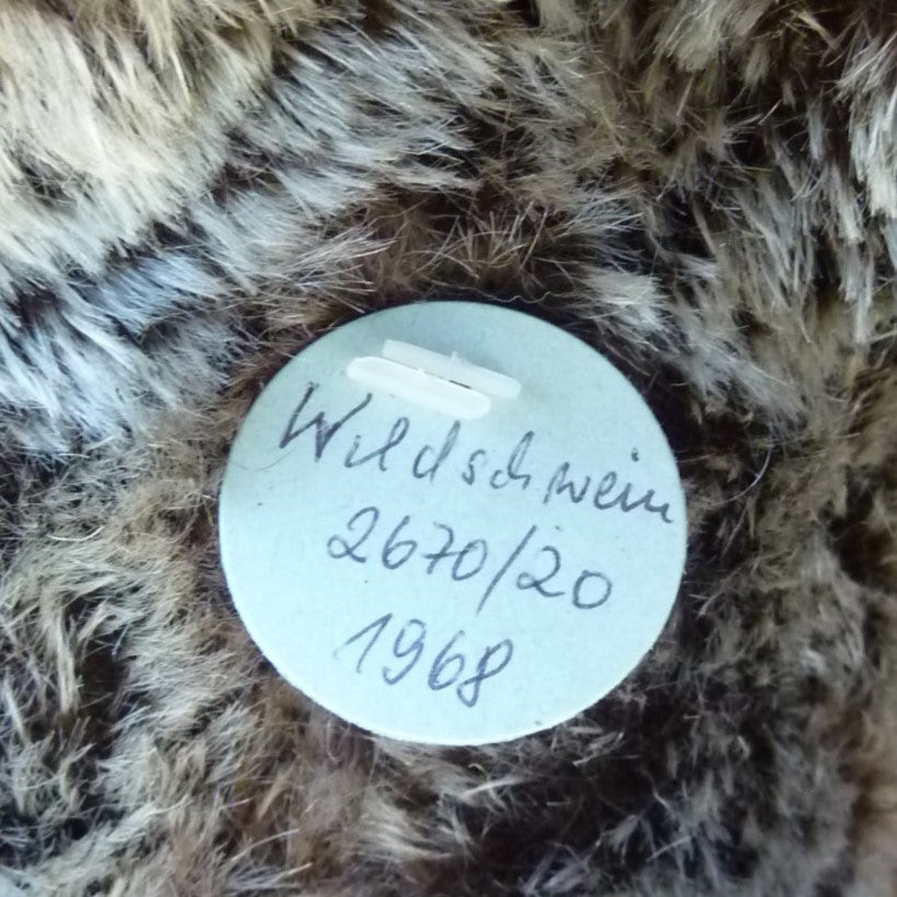 This non-jointed wild boar is made of soft and tipped, dark brown mohair with blue and black plastic eyes and plastic tusks. Never with button. In mint condition with chest tag and Steiff archive label dated 1968 (see photo).
