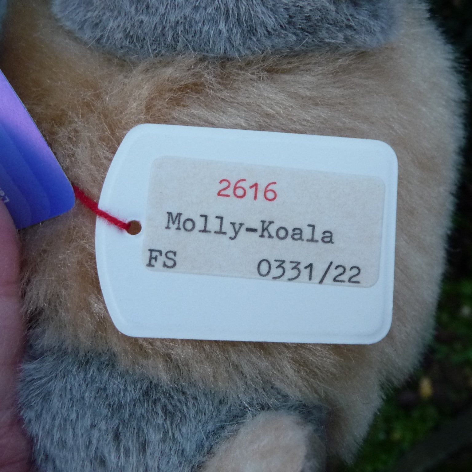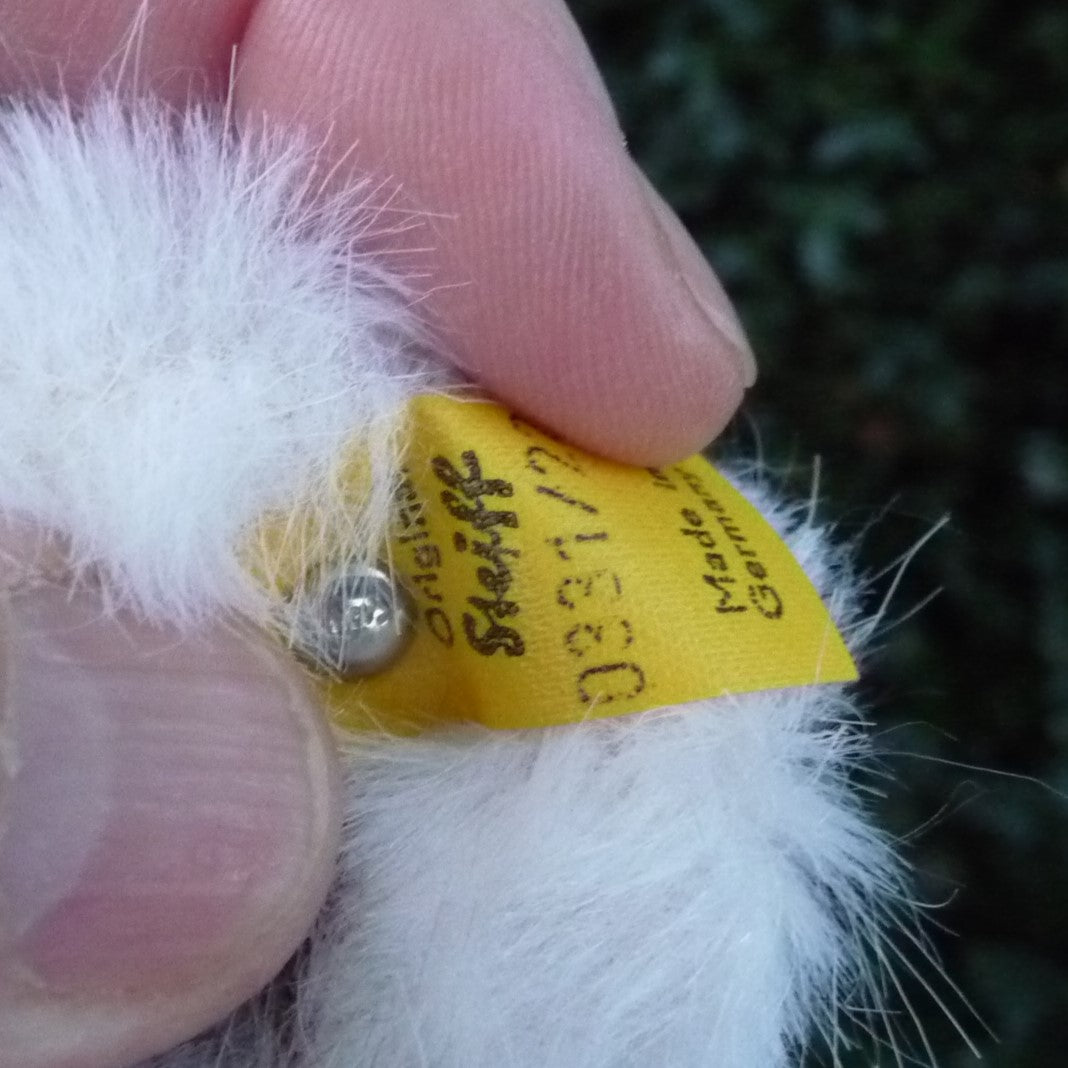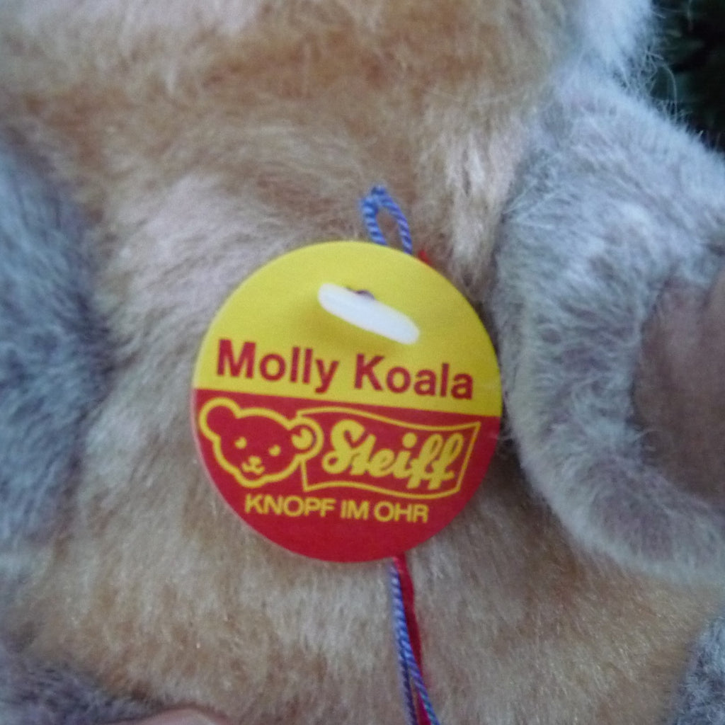 This small to medium-sized, non-jointed koala is made of soft and dense, grey, beige and white manmade plush with brown and black safety eyes and a faux suede nose. In mint condition with silver button, ear tag and chest tag, all ID as well as a label, numbered 2616, which relates to Steiff’s registered design application at the local court at Heidenheim (see photo).