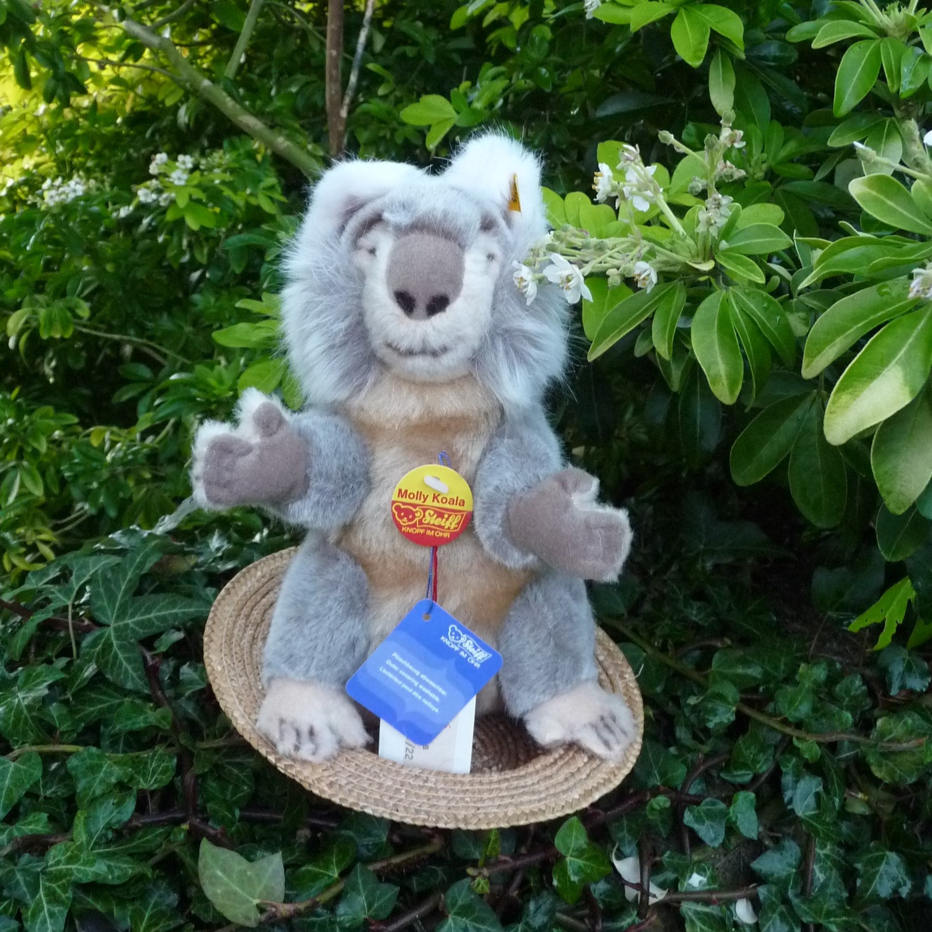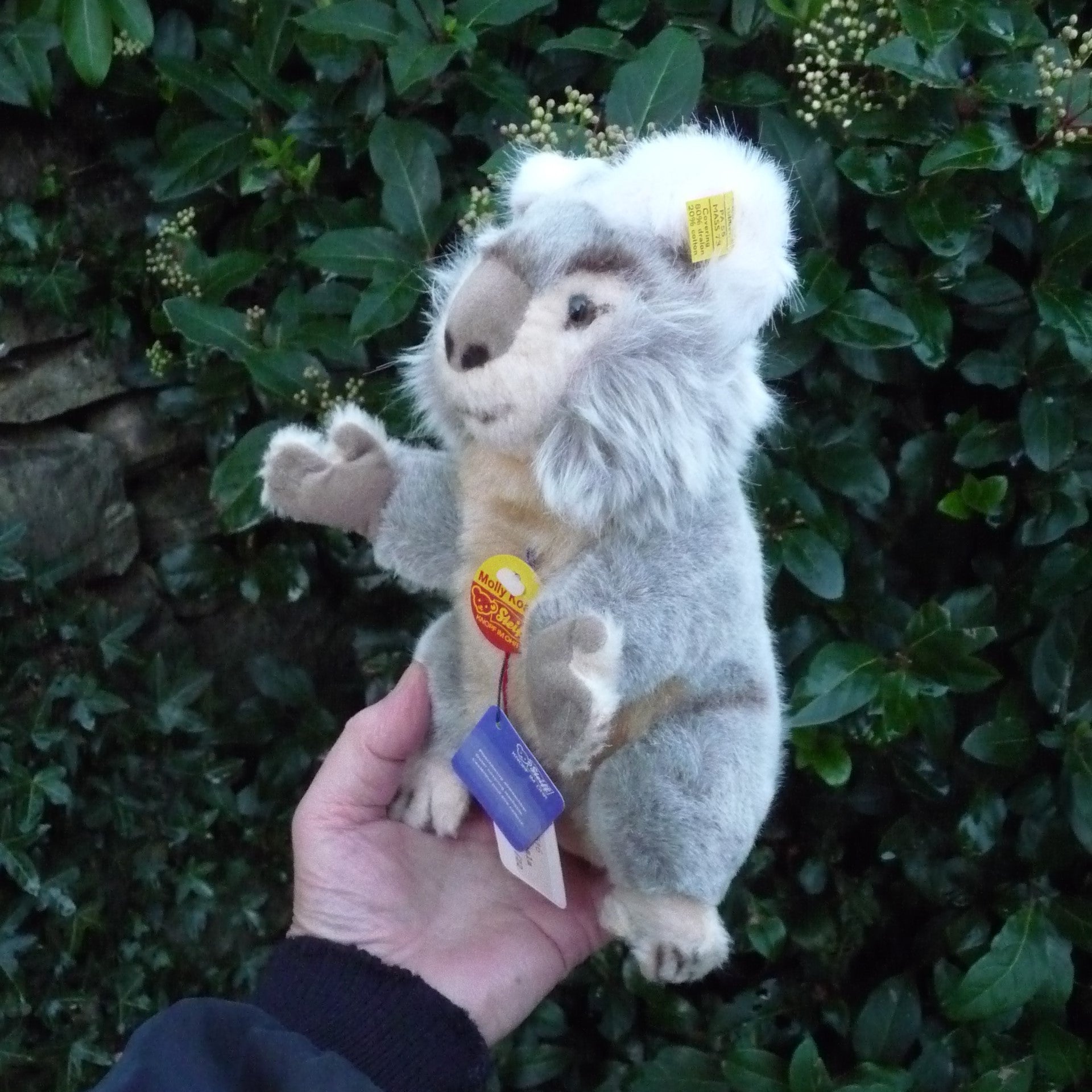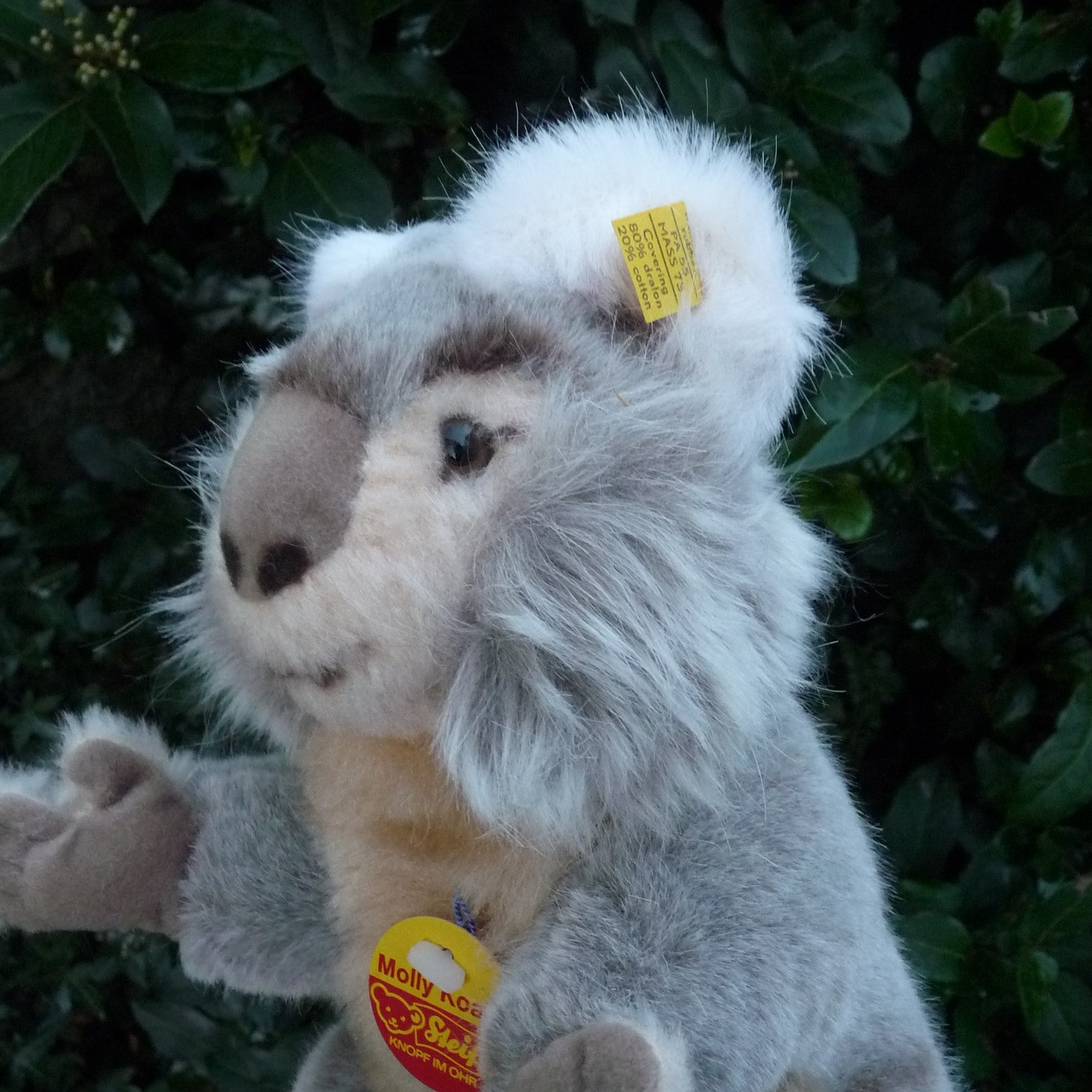 This small to medium-sized, non-jointed koala is made of soft and dense, grey, beige and white manmade plush with brown and black safety eyes and a faux suede nose. In mint condition with silver button, ear tag and chest tag, all ID as well as a label, numbered 2616, which relates to Steiff’s registered design application at the local court at Heidenheim (see photo).