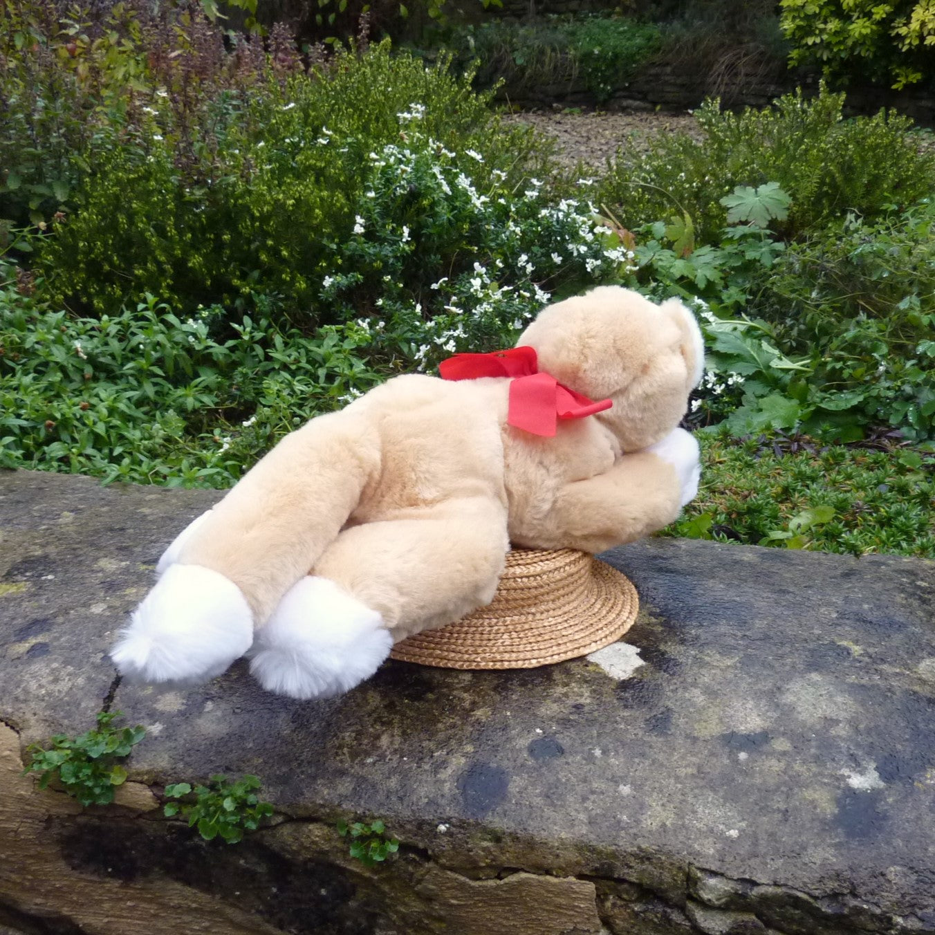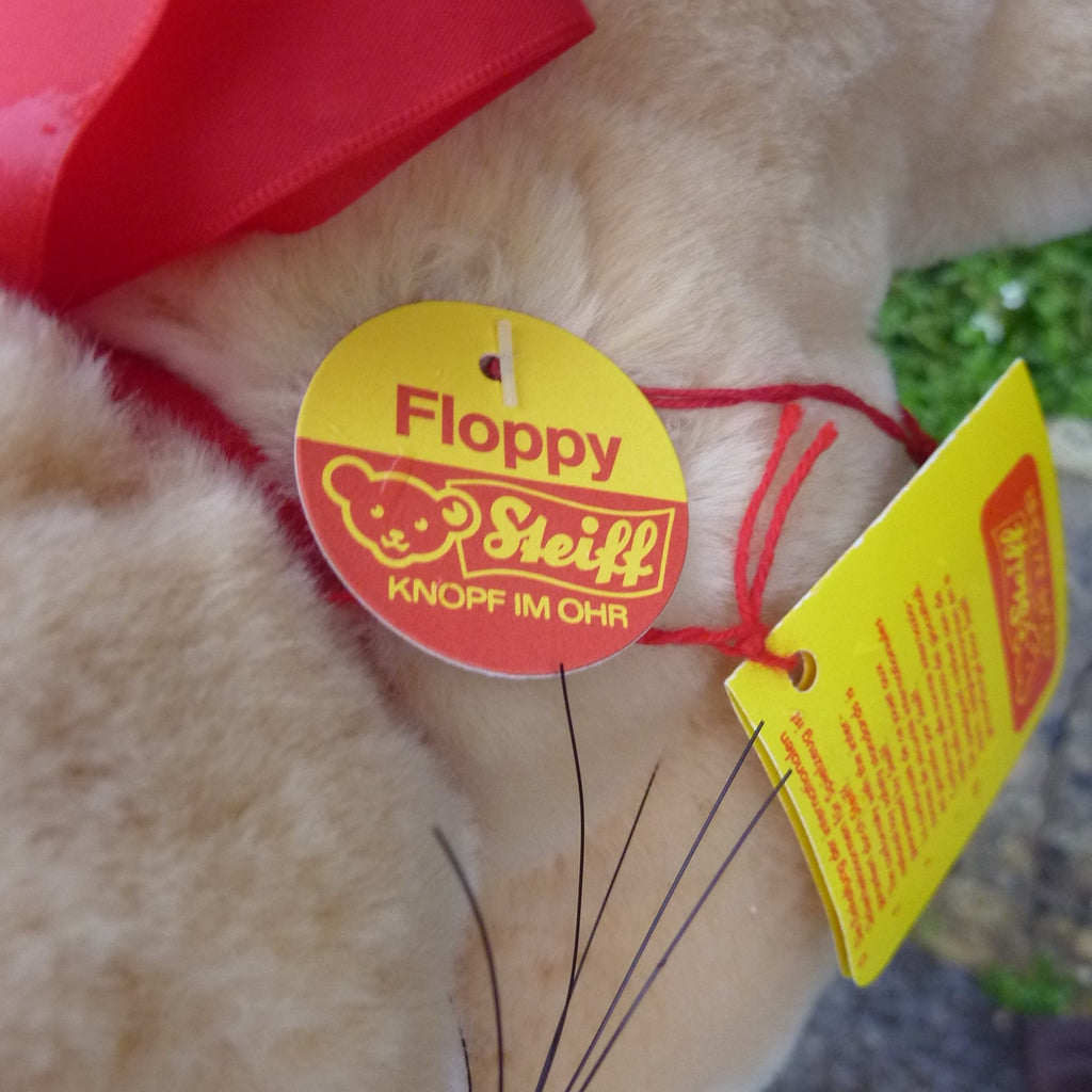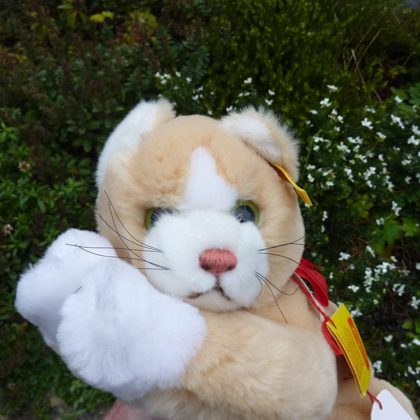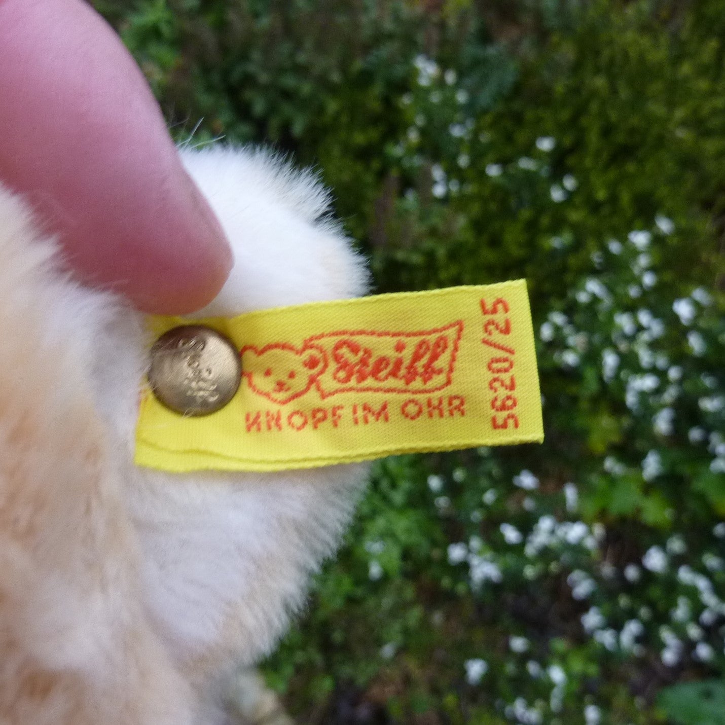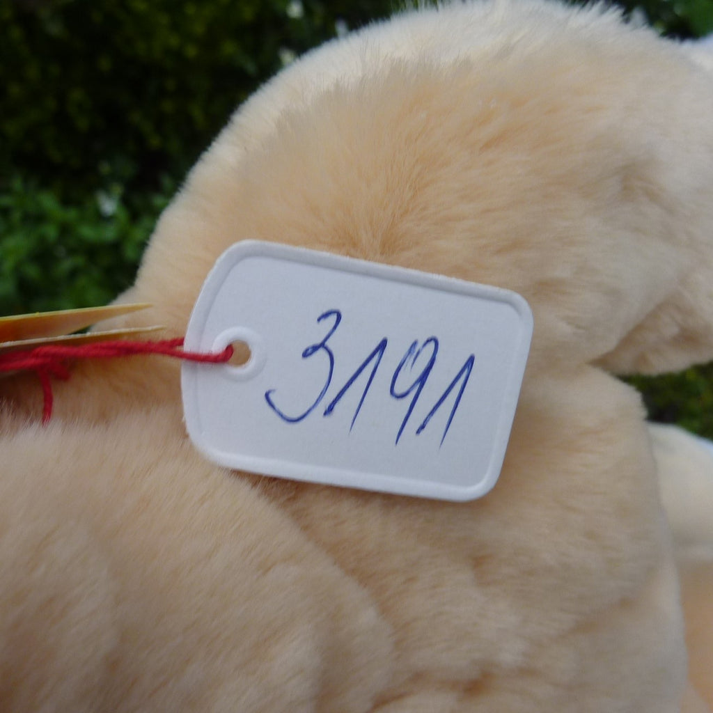 This super-soft, lying cat is made of soft and dense, warm cream manmade fur with green and black safety eyes and black whiskers. In mint, as new condition with full ID. No archive label but with label, numbered 3191, which relates to the registered design application at the local court at Heidenheim (see photo).