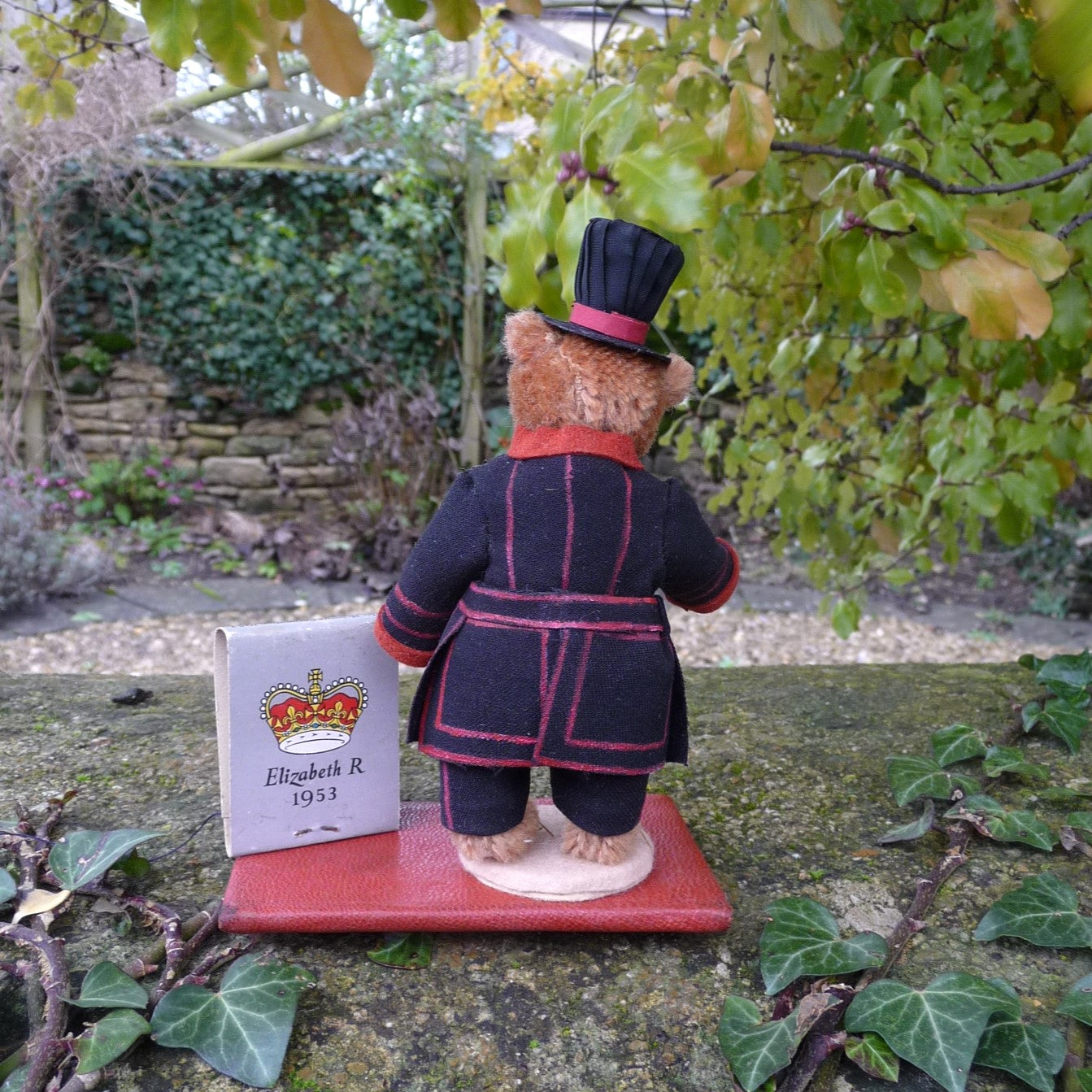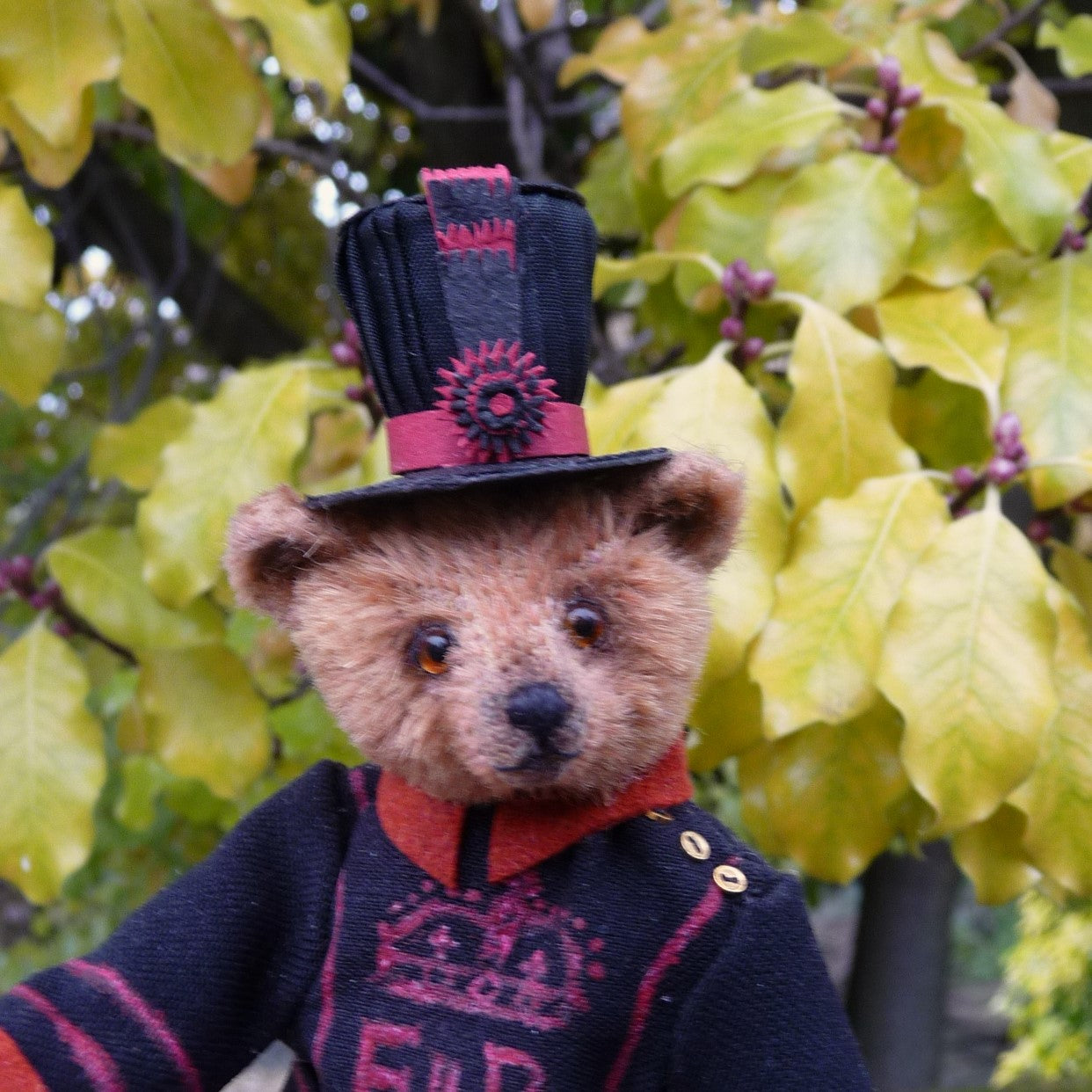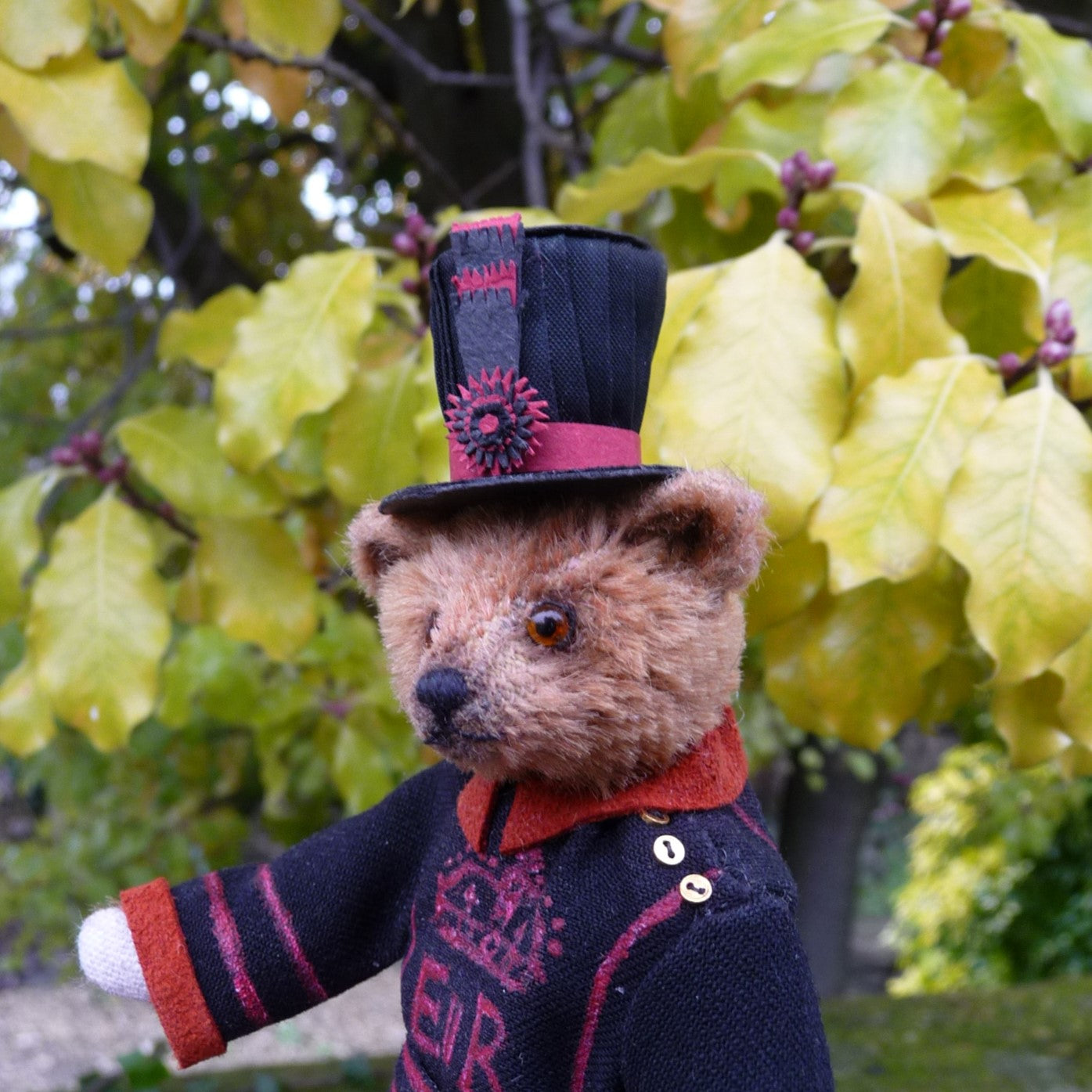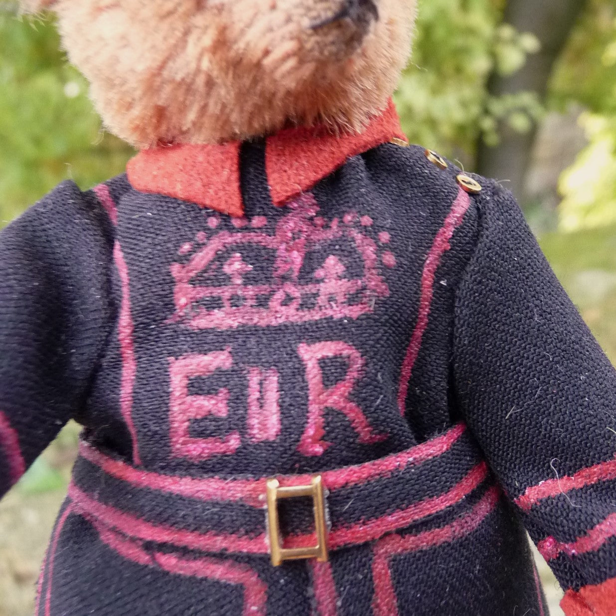 This small and finely sculpted bear is made of vintage brown mohair with amber and black glass eyes, wired arms and faux suede pads. It took Britta several days painstakingly to re-create this museum-quality bear’s traditional Yeoman Warder uniform and paint the decorative detail. Thread loops help John to stand securely on the round plinth. He is filled with sheep’s wool and weighted with steel shot.