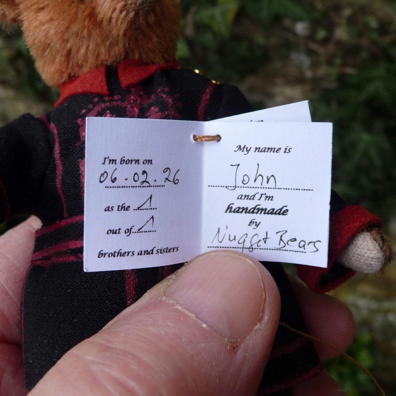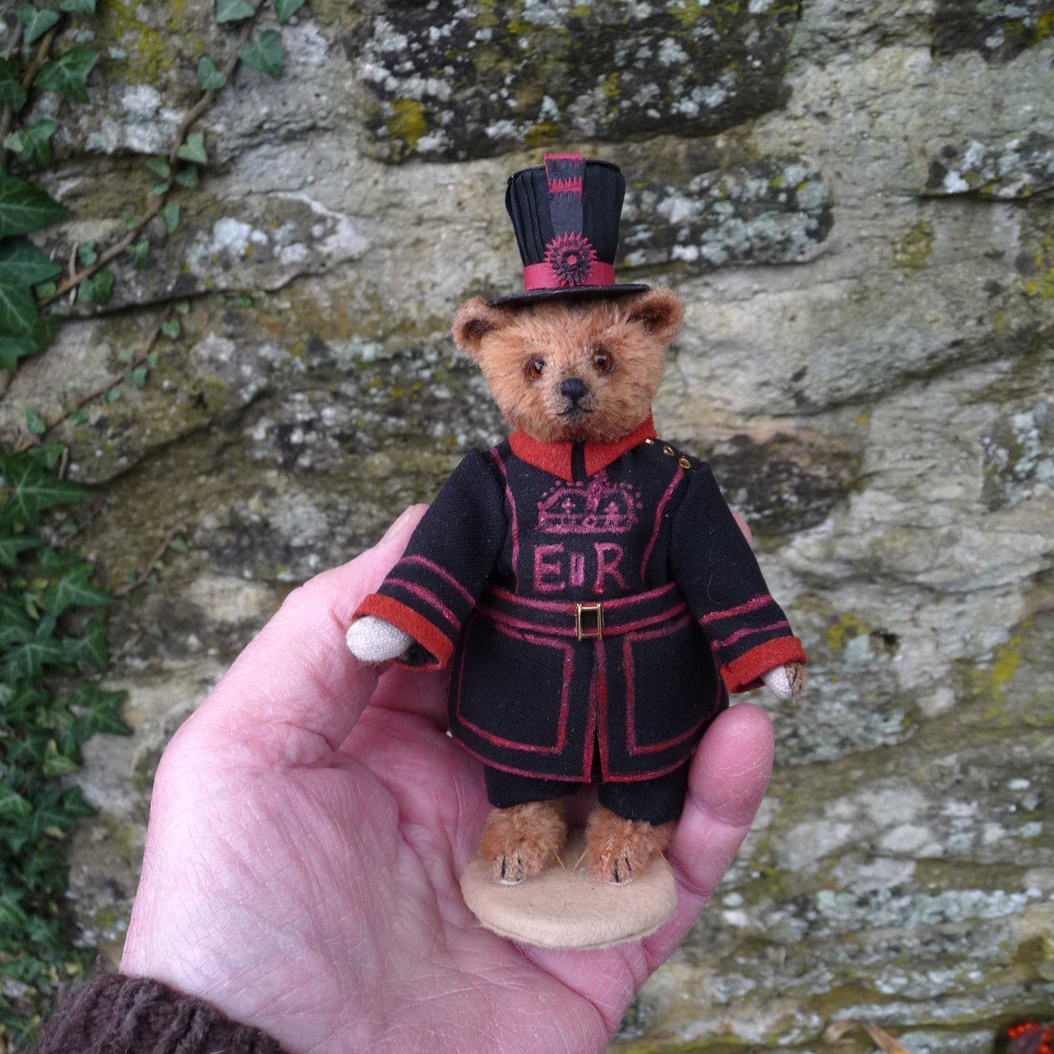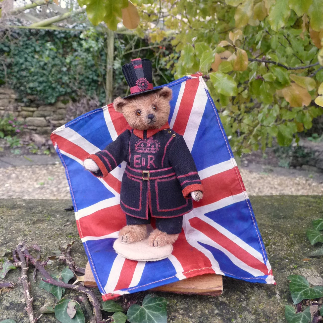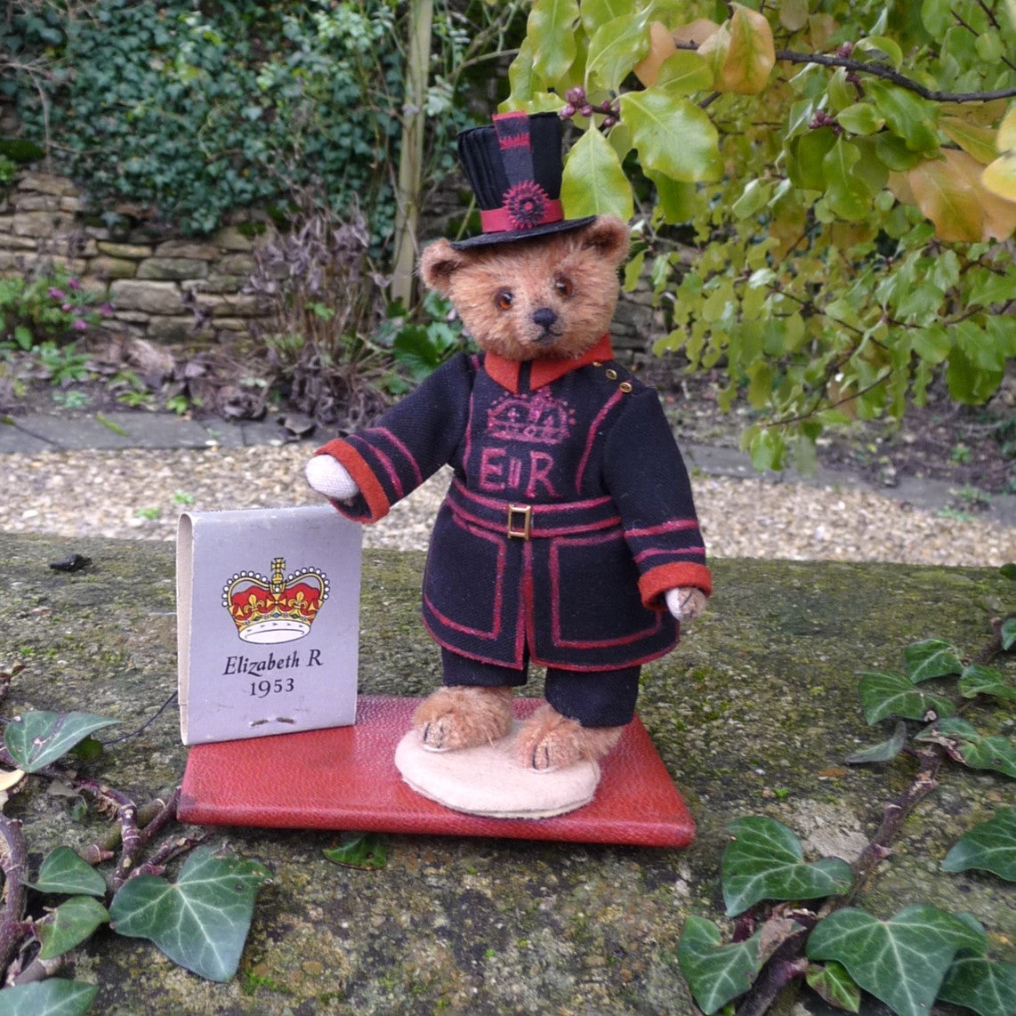 This small and finely sculpted bear is made of vintage brown mohair with amber and black glass eyes, wired arms and faux suede pads. It took Britta several days painstakingly to re-create this museum-quality bear’s traditional Yeoman Warder uniform and paint the decorative detail. Thread loops help John to stand securely on the round plinth. He is filled with sheep’s wool and weighted with steel shot.
