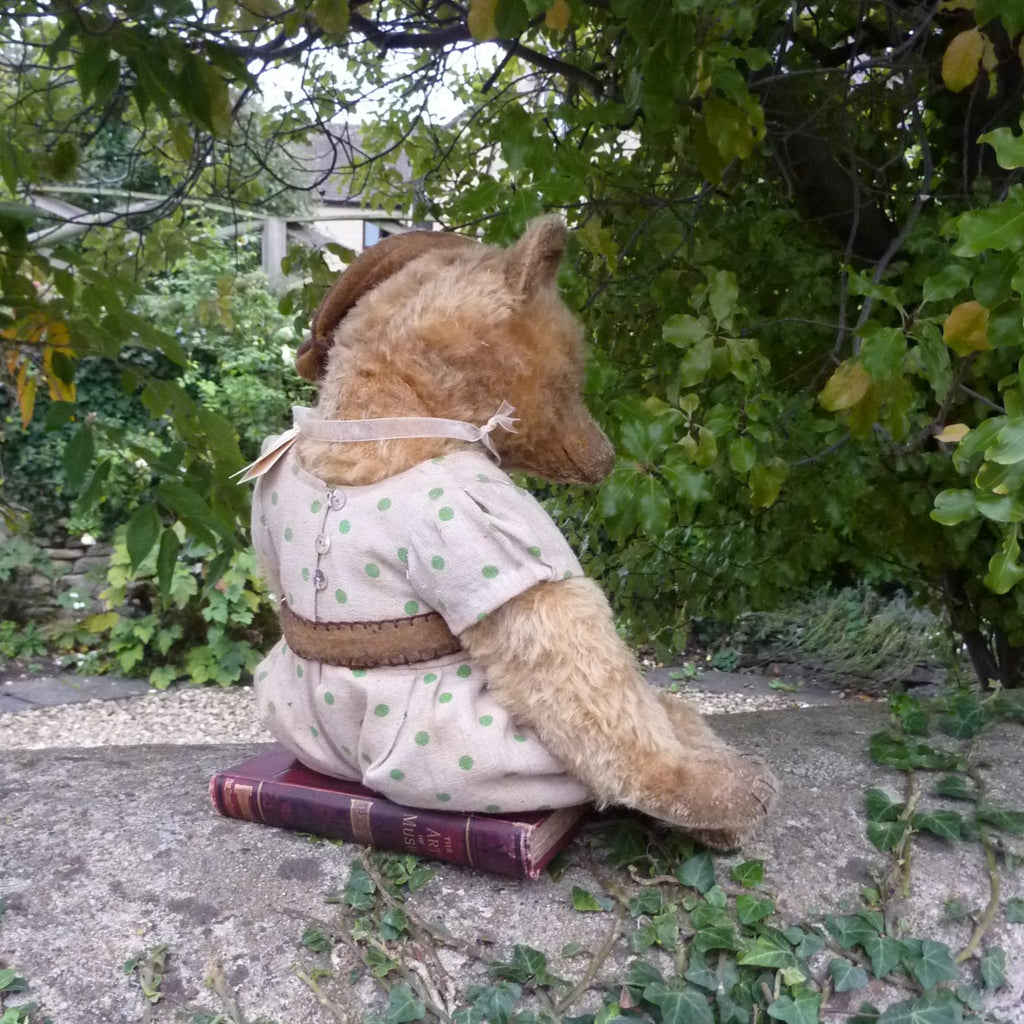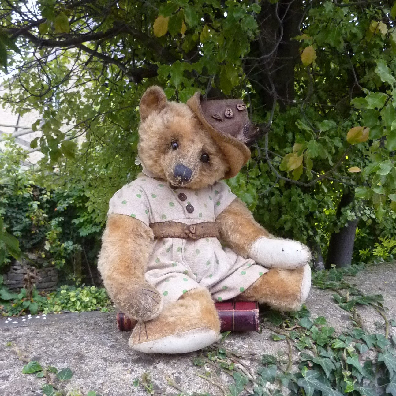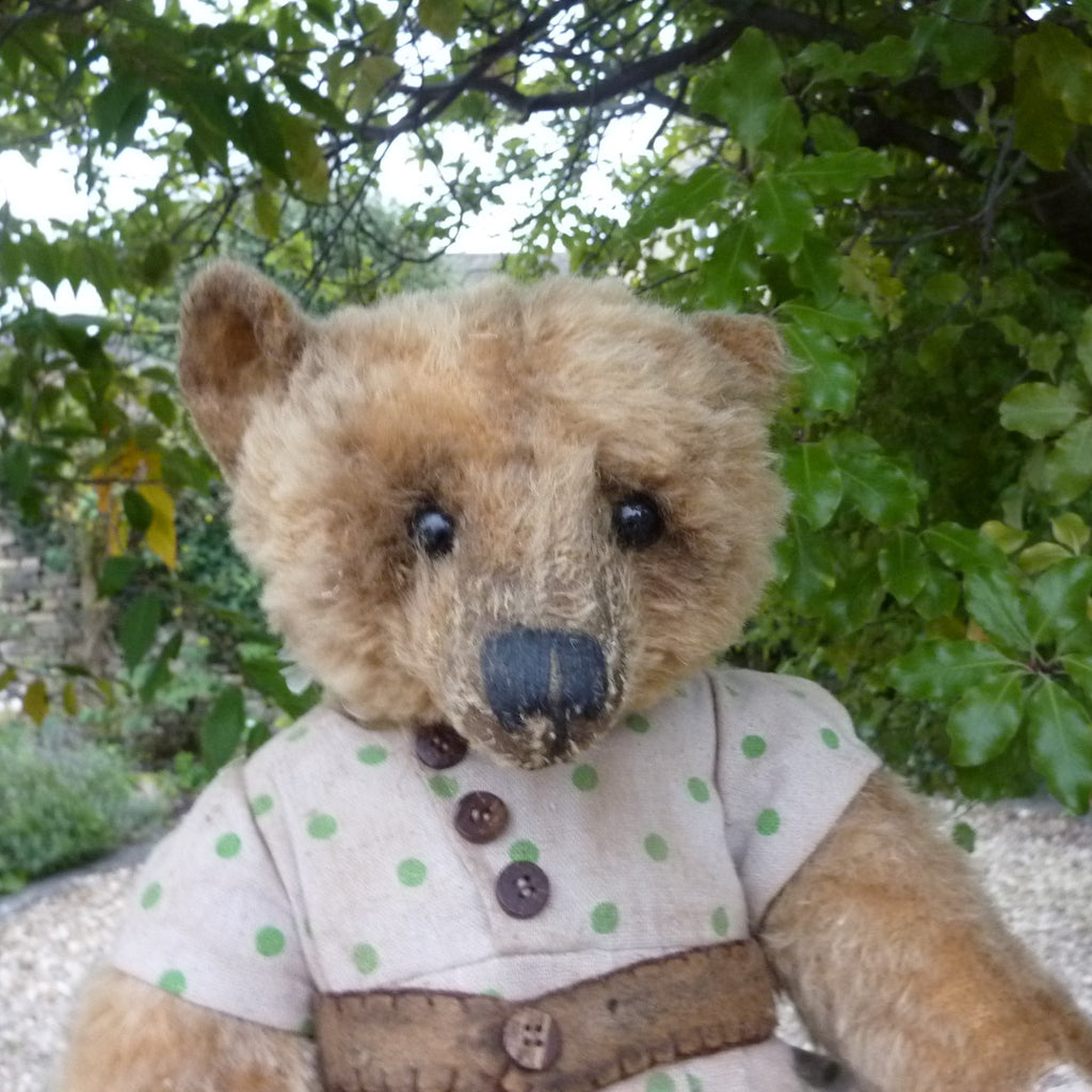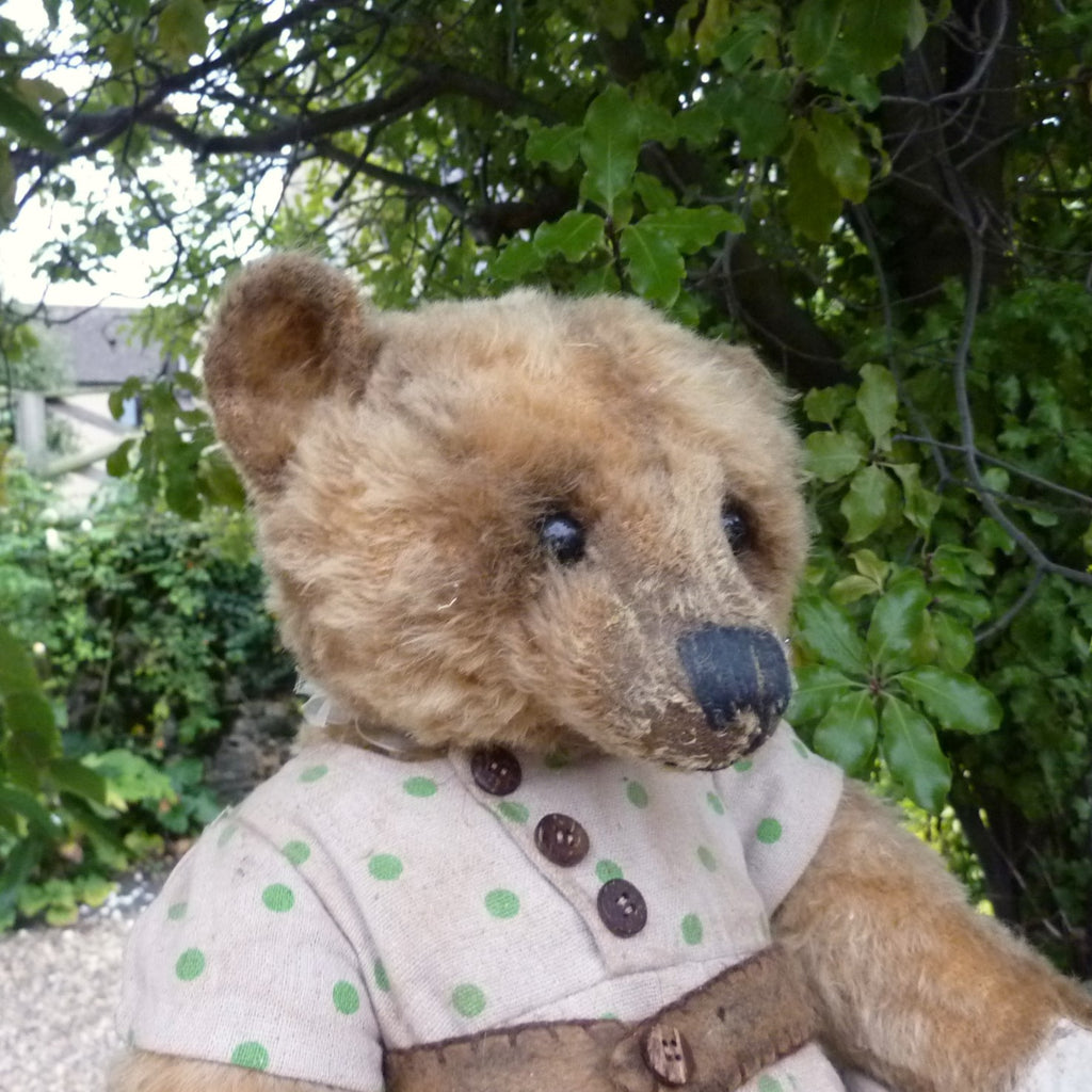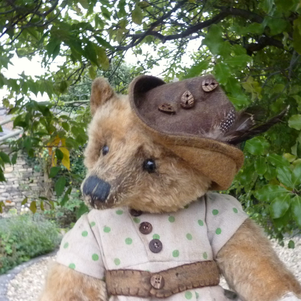 It would be easy to believe that this large and eye-catching bear was made in the very early 1900s. Heavily filled with a mixture of wood shavings and mineral granules, Blodwyn is made of gold-beige mohair, which AliJayne has aged extensively but with subtlety. He has a centre seam head, black glass eyes, a skip-stitched nose, hand-painted facial detail and aged linen paw pads. He wears a romper suit made of vintage, polka dot linen and a felt Bavarian-style hat. He has a gold-plated heart in his left ear. (If bought by someone outside the UK, there will be a GBP65 surcharge towards the airmail cost.)