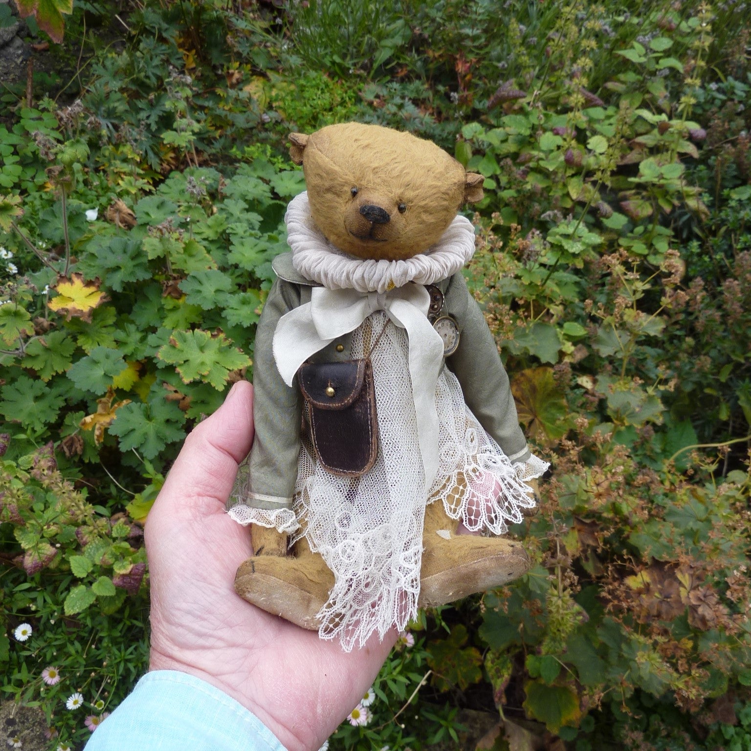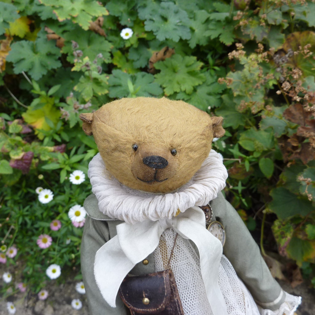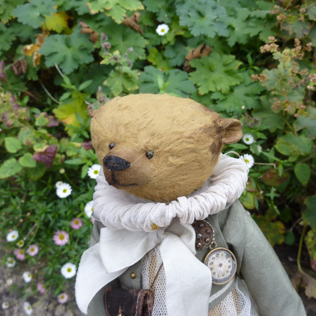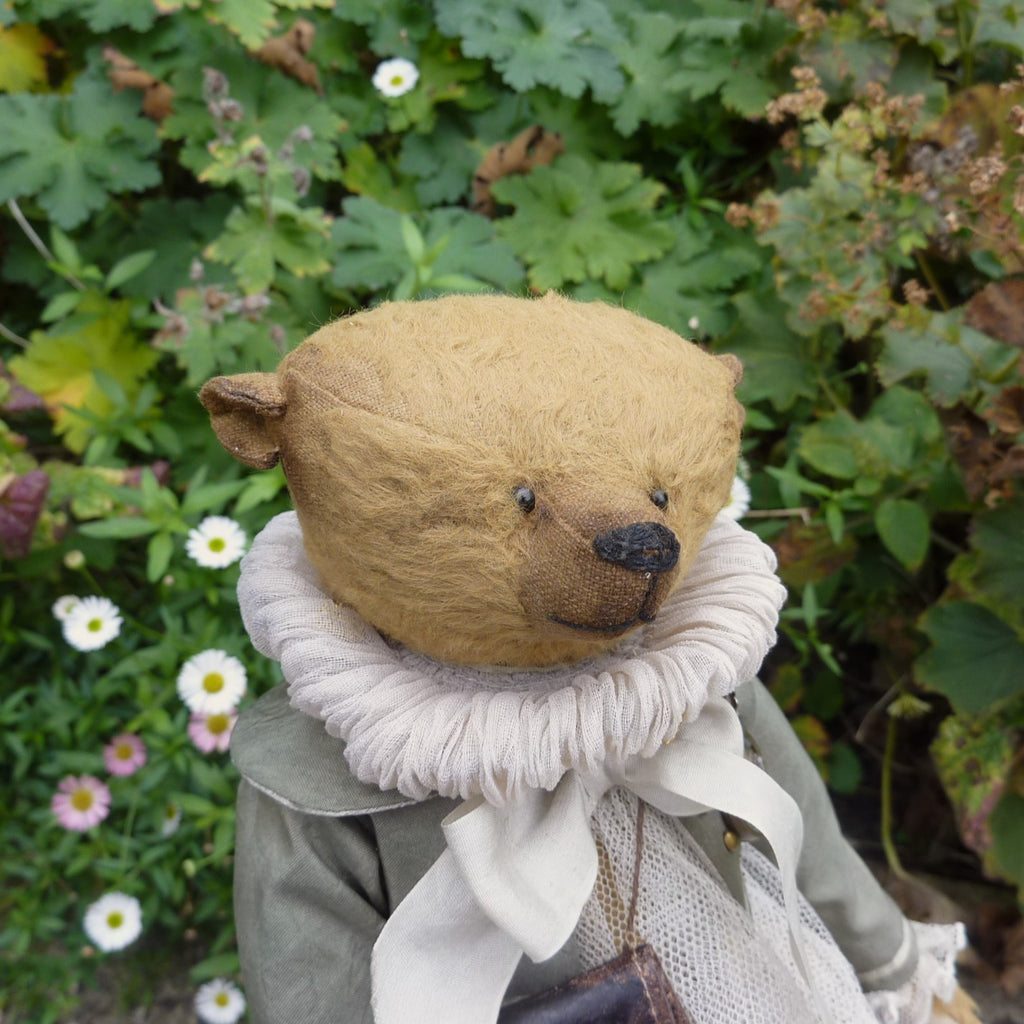 Oozing quality, this finely detailed and old-looking bear is made of aged and hand-dyed, golden tan viscose with black glass eyes and aged cotton paw pads. She wears a short-waisted, green sailor jacket, decorated with a vintage-style watch face and an antique button, and an embroidered tulle pinafore dress. Over her neck she carries a shoulder bag, made of aged, vintage leather. Beatrix is filled with wood shavings, with steel shot added for weight.