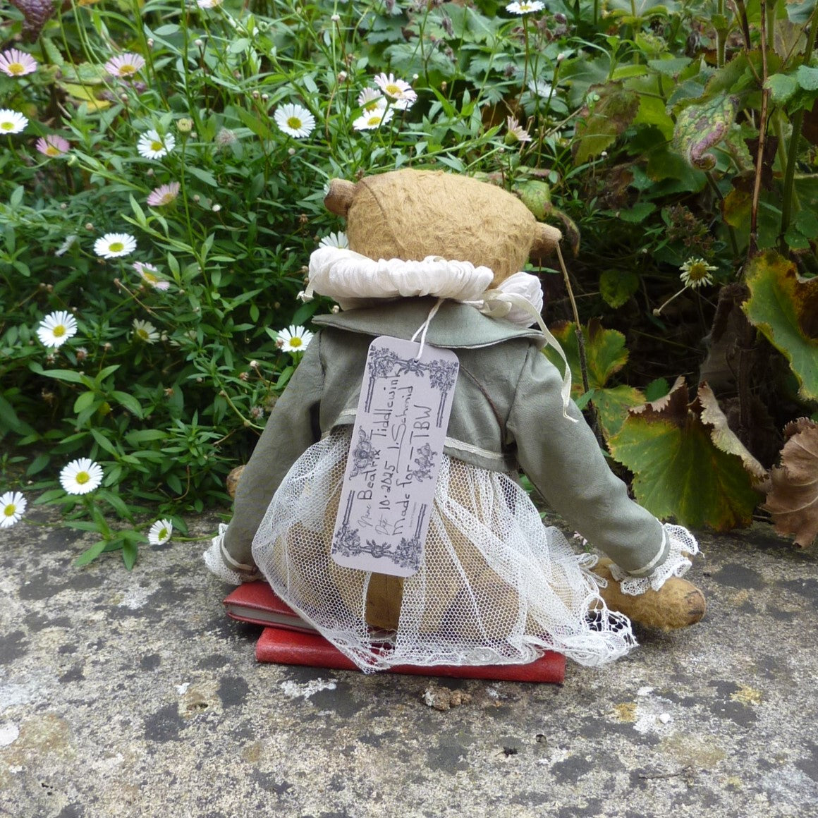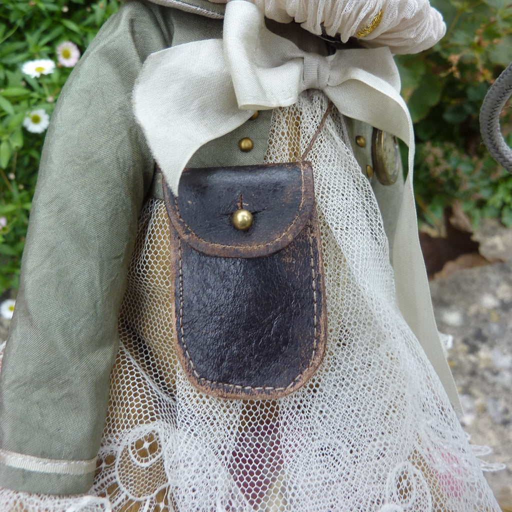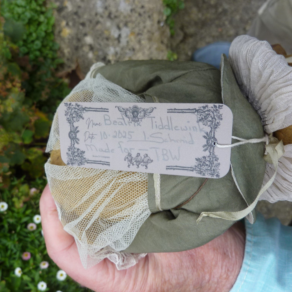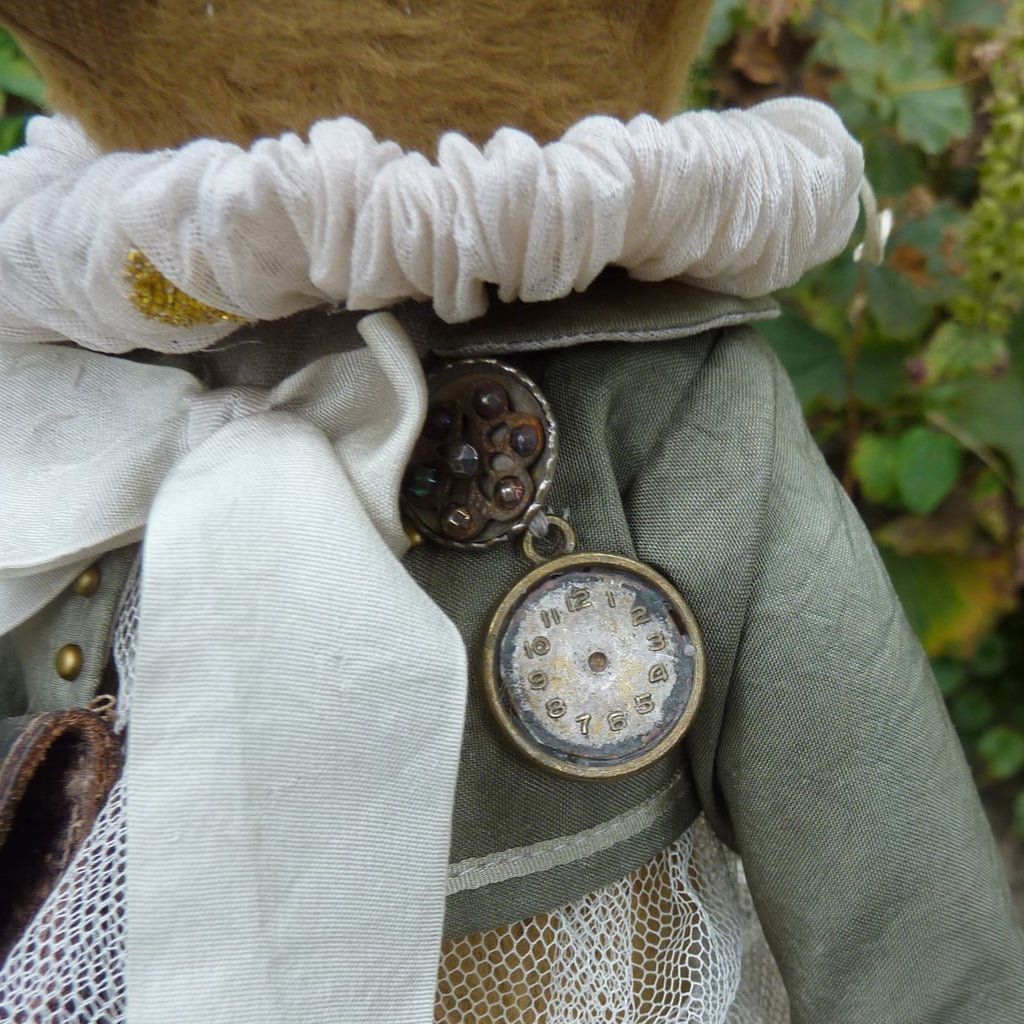 Oozing quality, this finely detailed and old-looking bear is made of aged and hand-dyed, golden tan viscose with black glass eyes and aged cotton paw pads. She wears a short-waisted, green sailor jacket, decorated with a vintage-style watch face and an antique button, and an embroidered tulle pinafore dress. Over her neck she carries a shoulder bag, made of aged, vintage leather. Beatrix is filled with wood shavings, with steel shot added for weight.