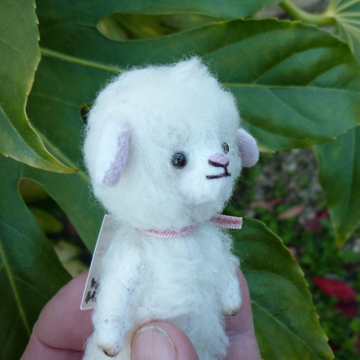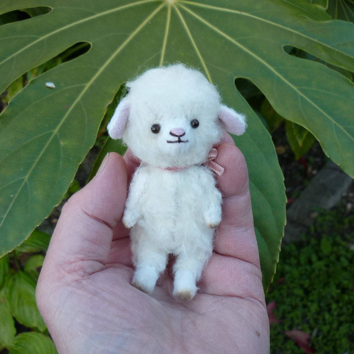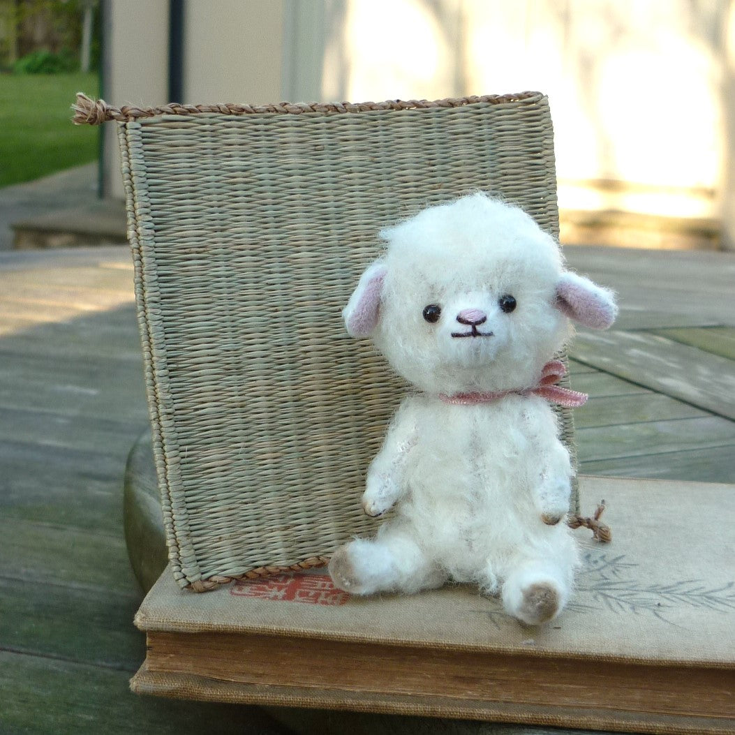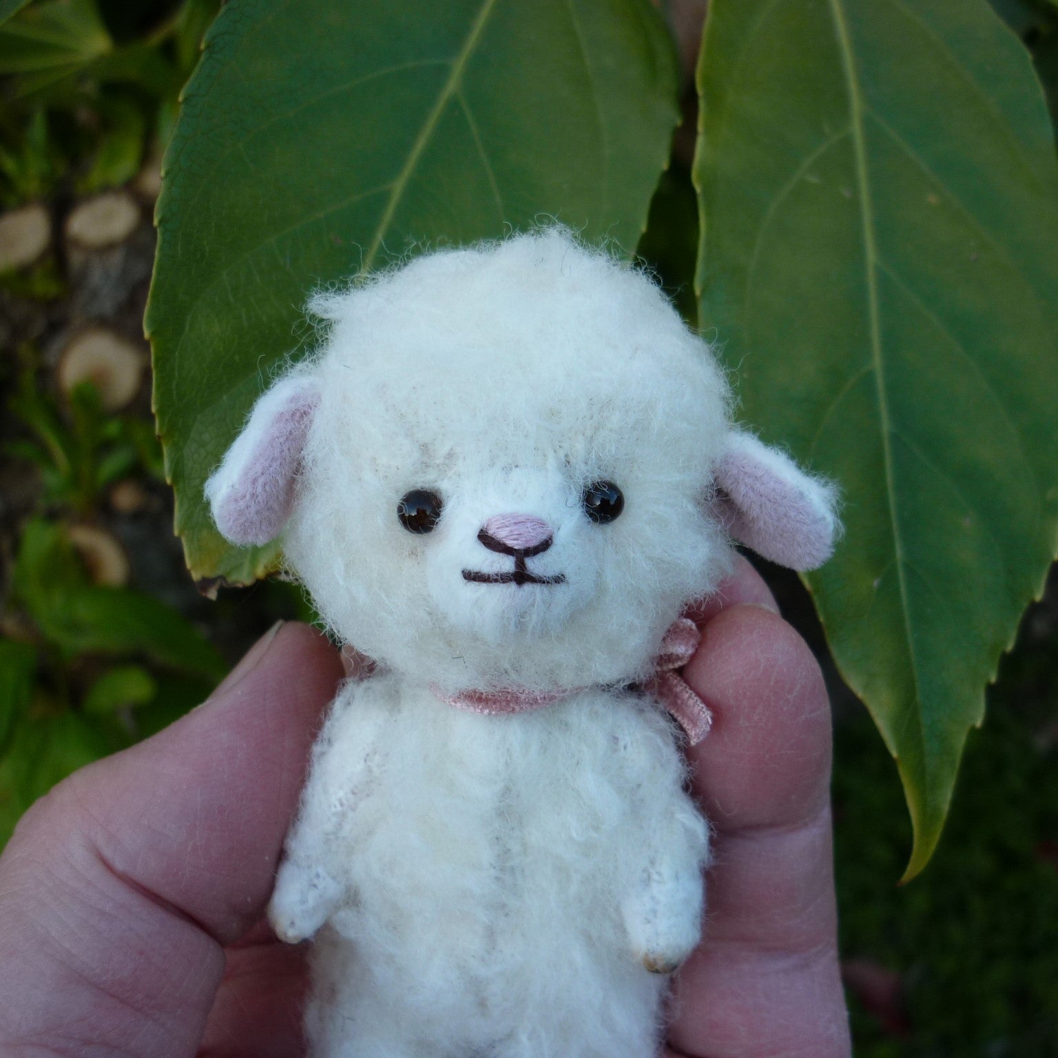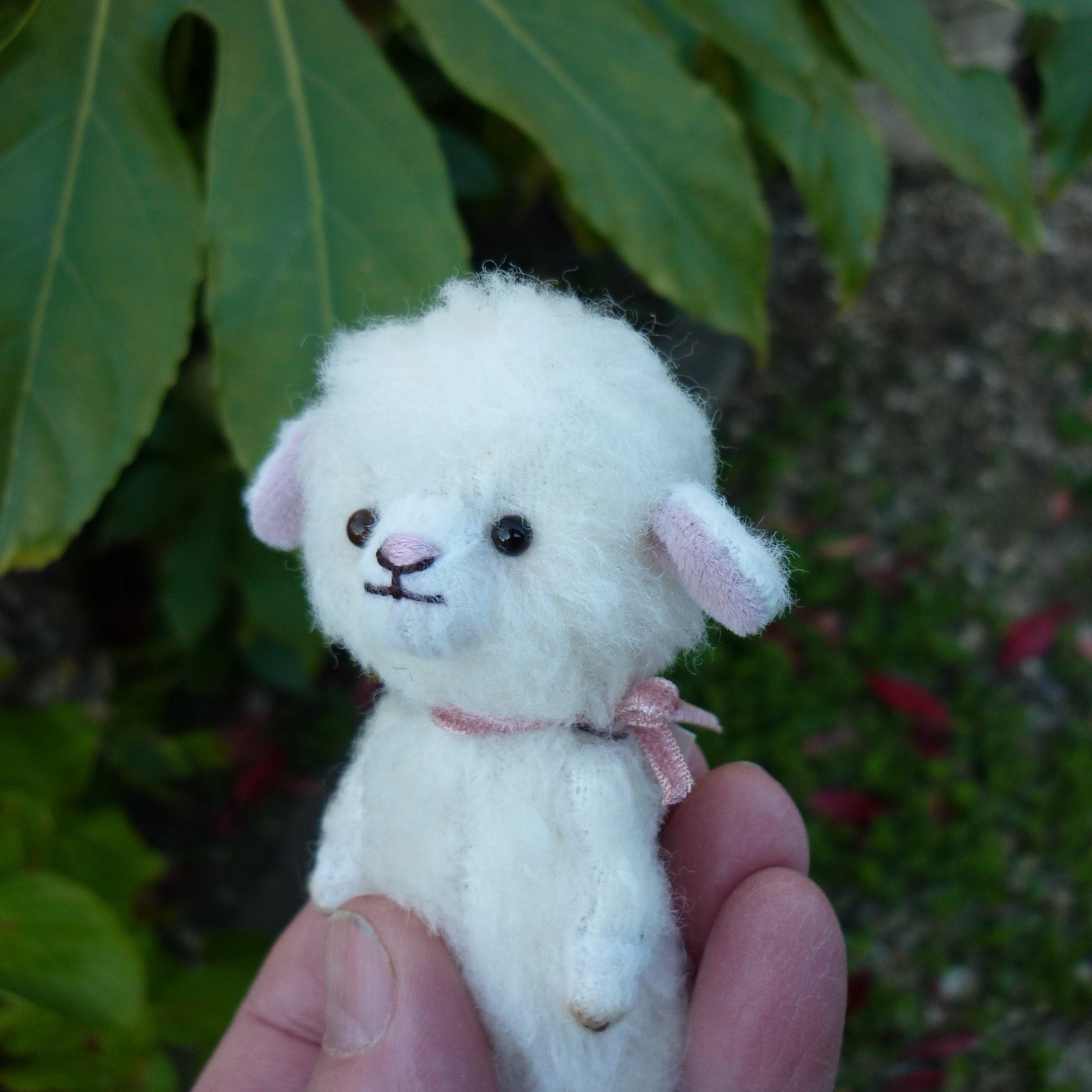 This lovely and very little, sheep is made of sparse and fluffy, white mohair with pink inner ears and hand-painted hooves. Mimi is filled with polyfibre and weighted with steel beads.