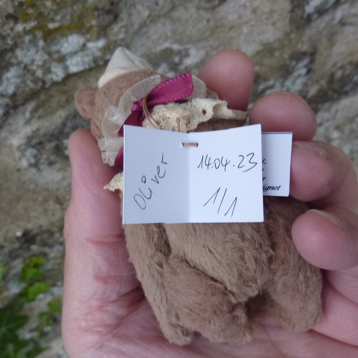 This finely sculpted little bear is made of aged, caramel viscose with black glass eyes, wired arms and vintage flax paw pads. He wears a felt clown hat, a layered vintage lace and organza collar and a brass bell pendant. Oliver is filled with sheep’s wool and weighted with steel shot.