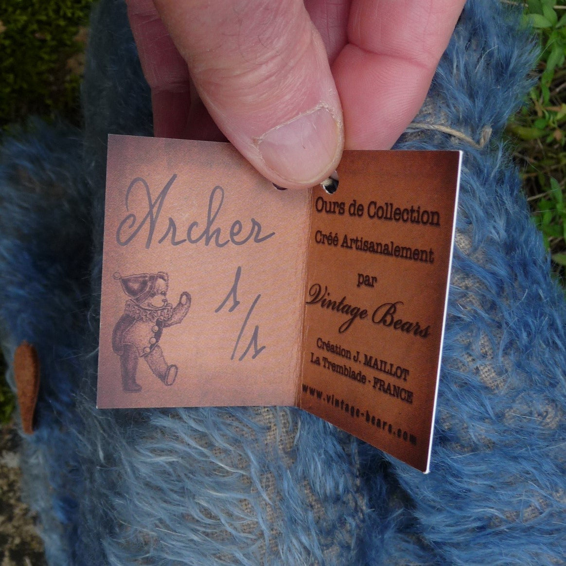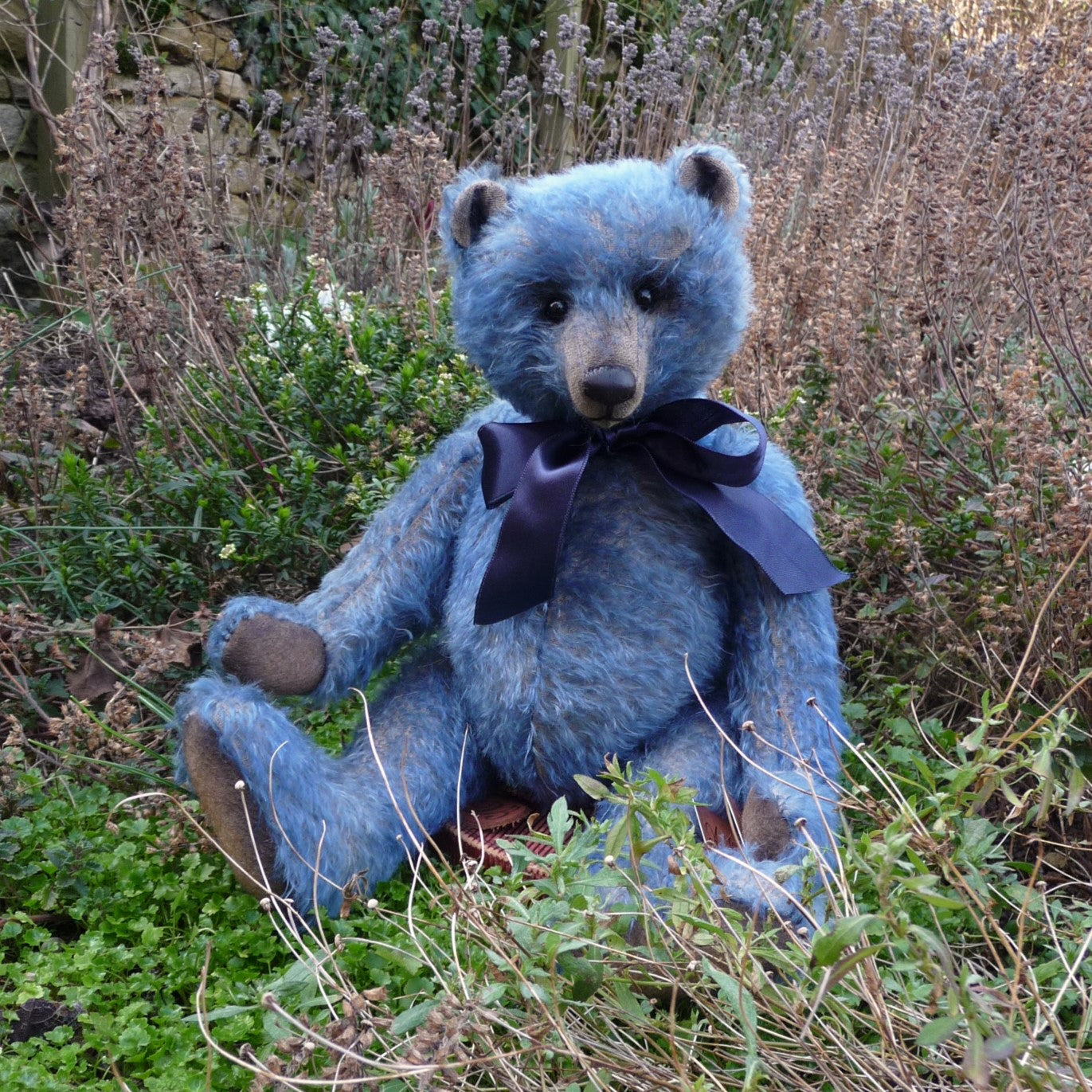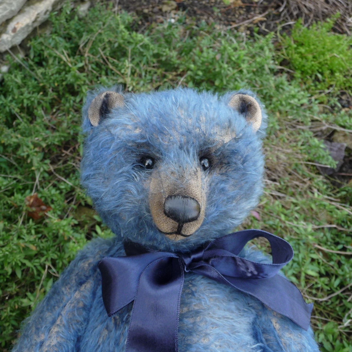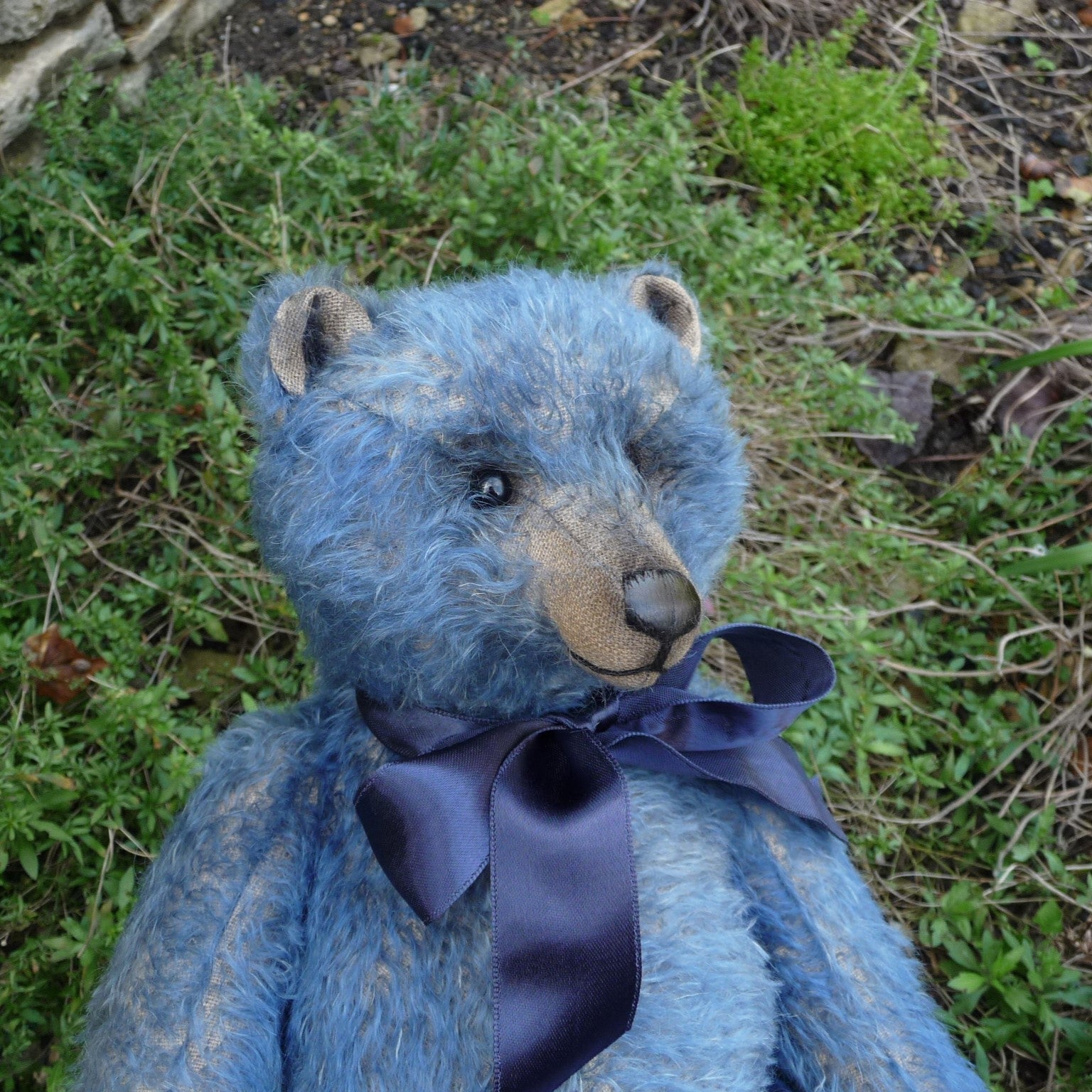This striking, medium to large-sized classic bear is made of unusual, sparse, hand-dyed and distressed, blue mohair set on pale backing cloth. He has black glass eyes, a waxed thread nose, age-painted facial detail and felt paw pads. Densely and heavily filled with a mixture of wood shavings and mineral granules, Archer wears a satin ribbon neck bow..