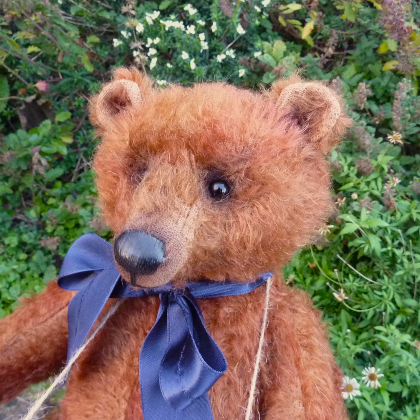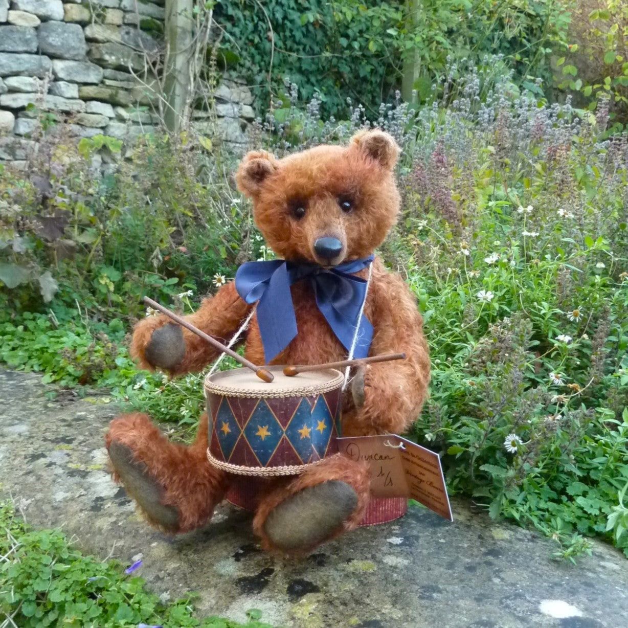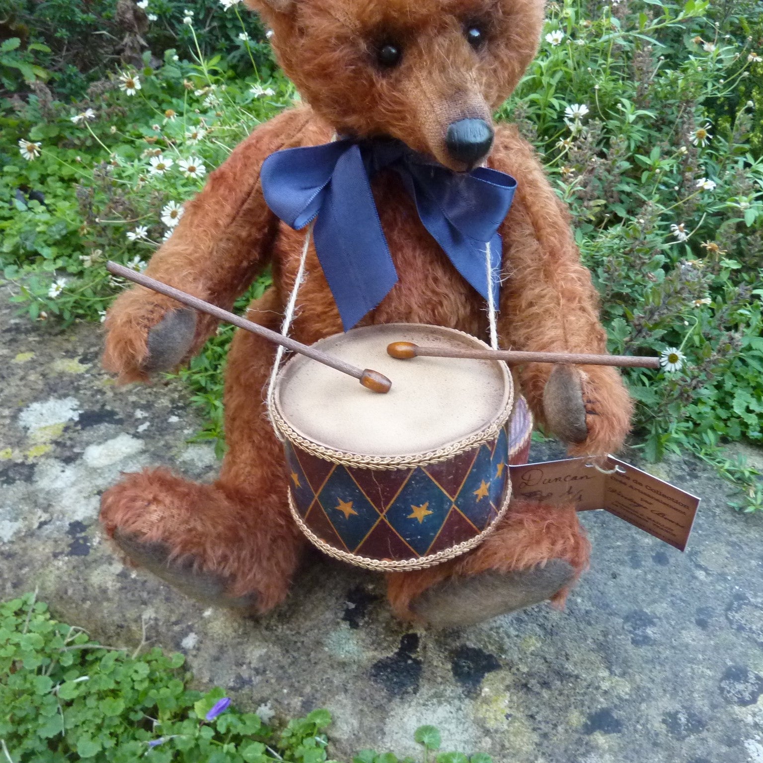 This outstanding, medium-sized, classic bear is finely made of hand-dyed, sparse and distressed, reddish brown mohair with deeply set black glass eyes, a waxed thread nose and painted age detail on his muzzle and felt paw pads. Densely and heavily filled with a mixture of wood shavings and mineral granules, Duncan wears a blue neck ribbon and comes with a cardboard drum and wooden drum sticks as shown.