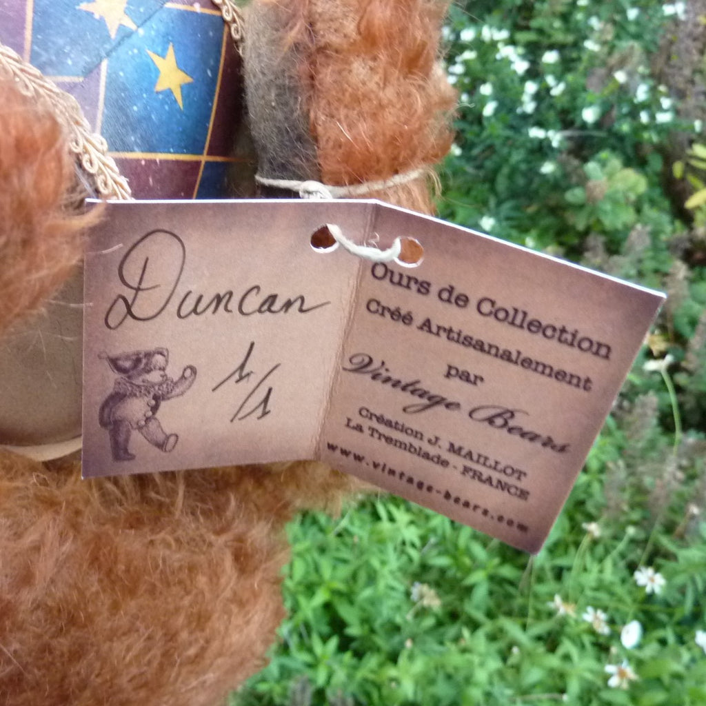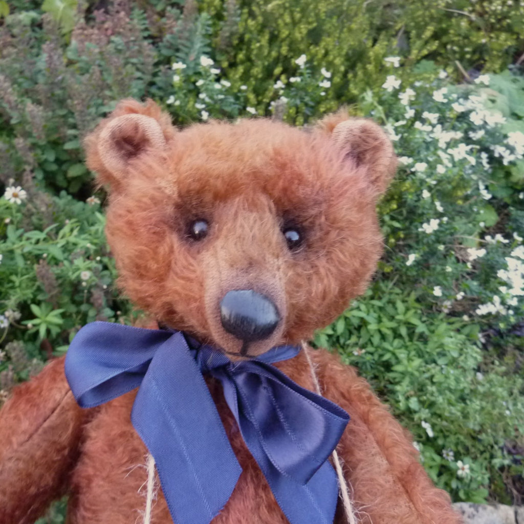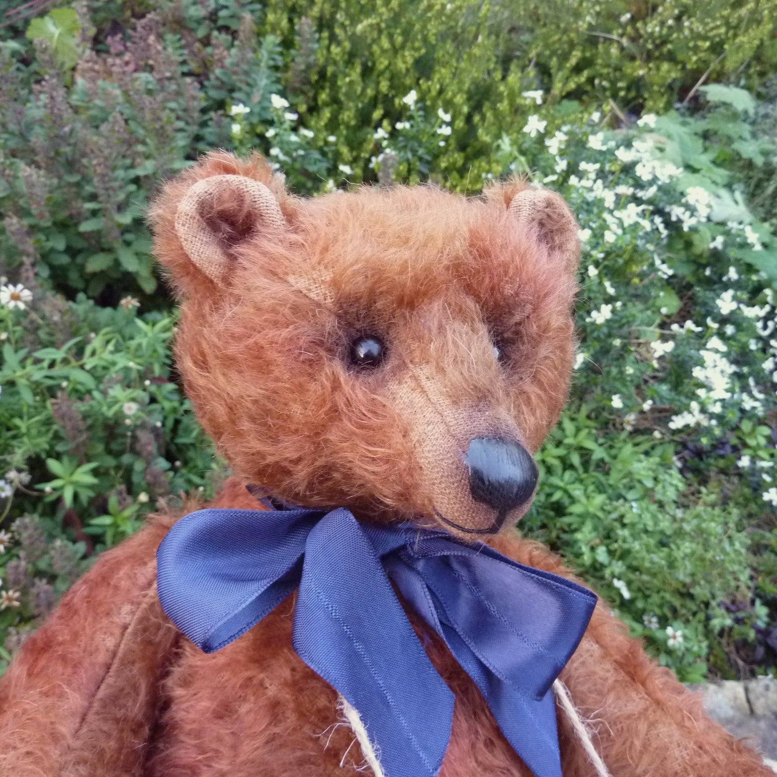 This outstanding, medium-sized, classic bear is finely made of hand-dyed, sparse and distressed, reddish brown mohair with deeply set black glass eyes, a waxed thread nose and painted age detail on his muzzle and felt paw pads. Densely and heavily filled with a mixture of wood shavings and mineral granules, Duncan wears a blue neck ribbon and comes with a cardboard drum and wooden drum sticks as shown.