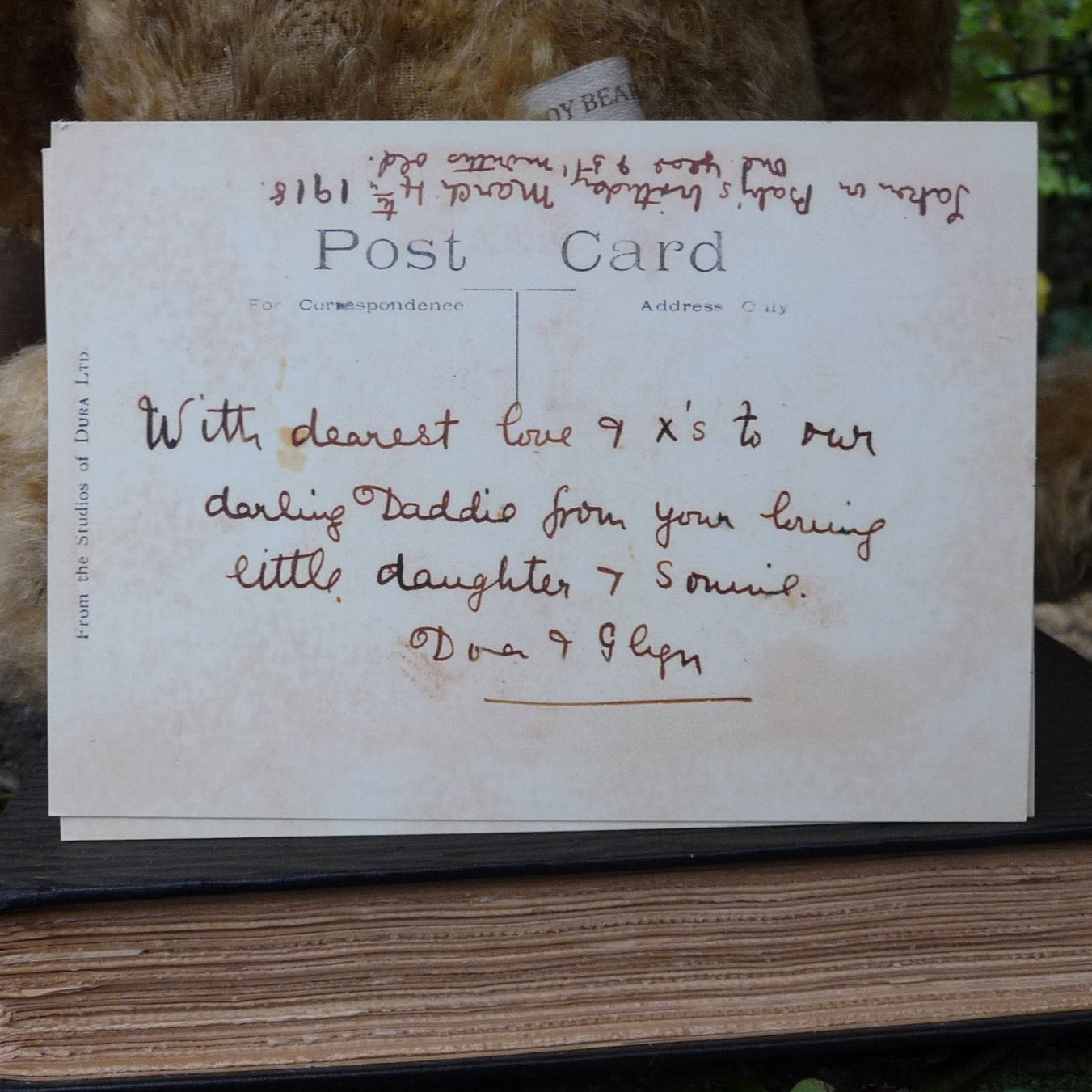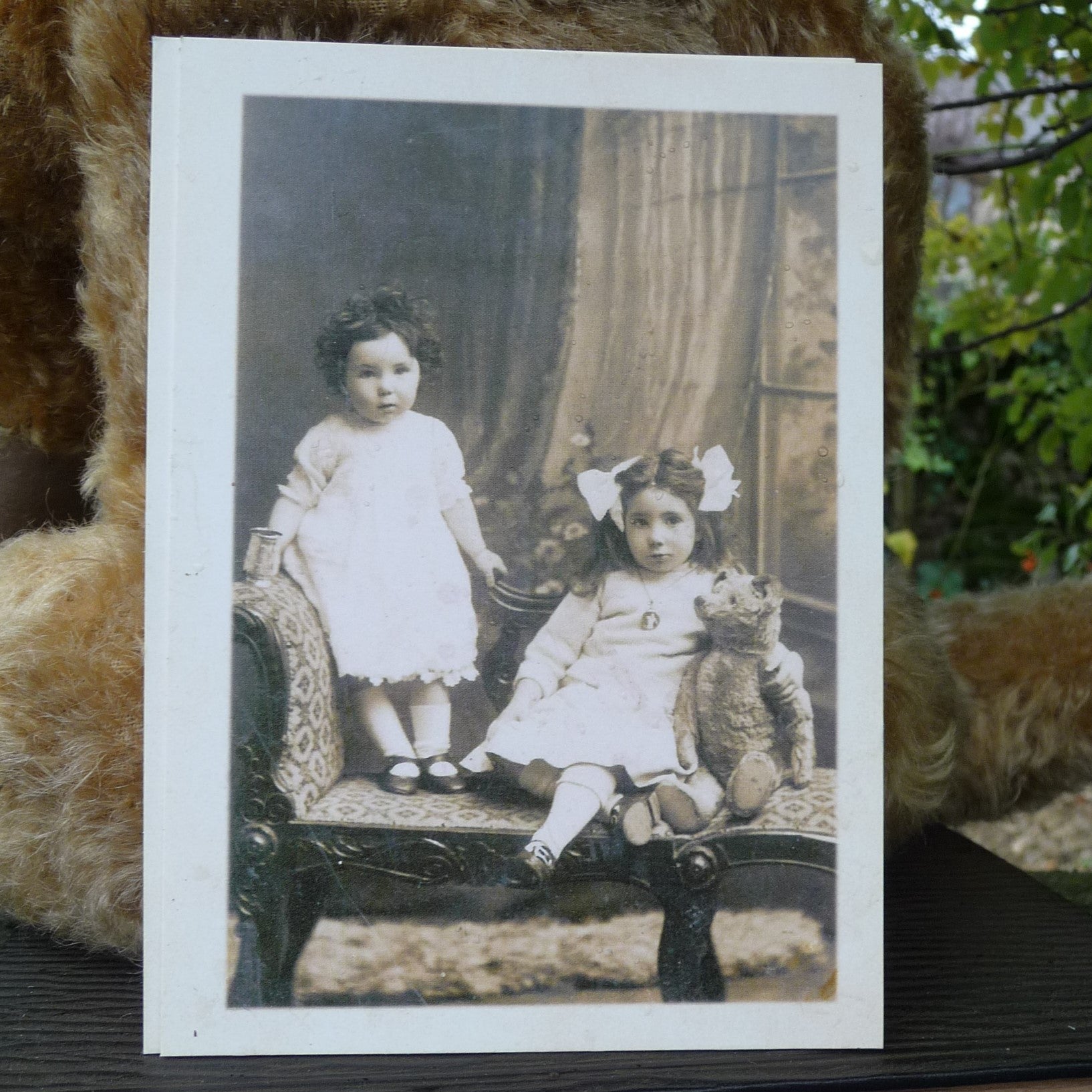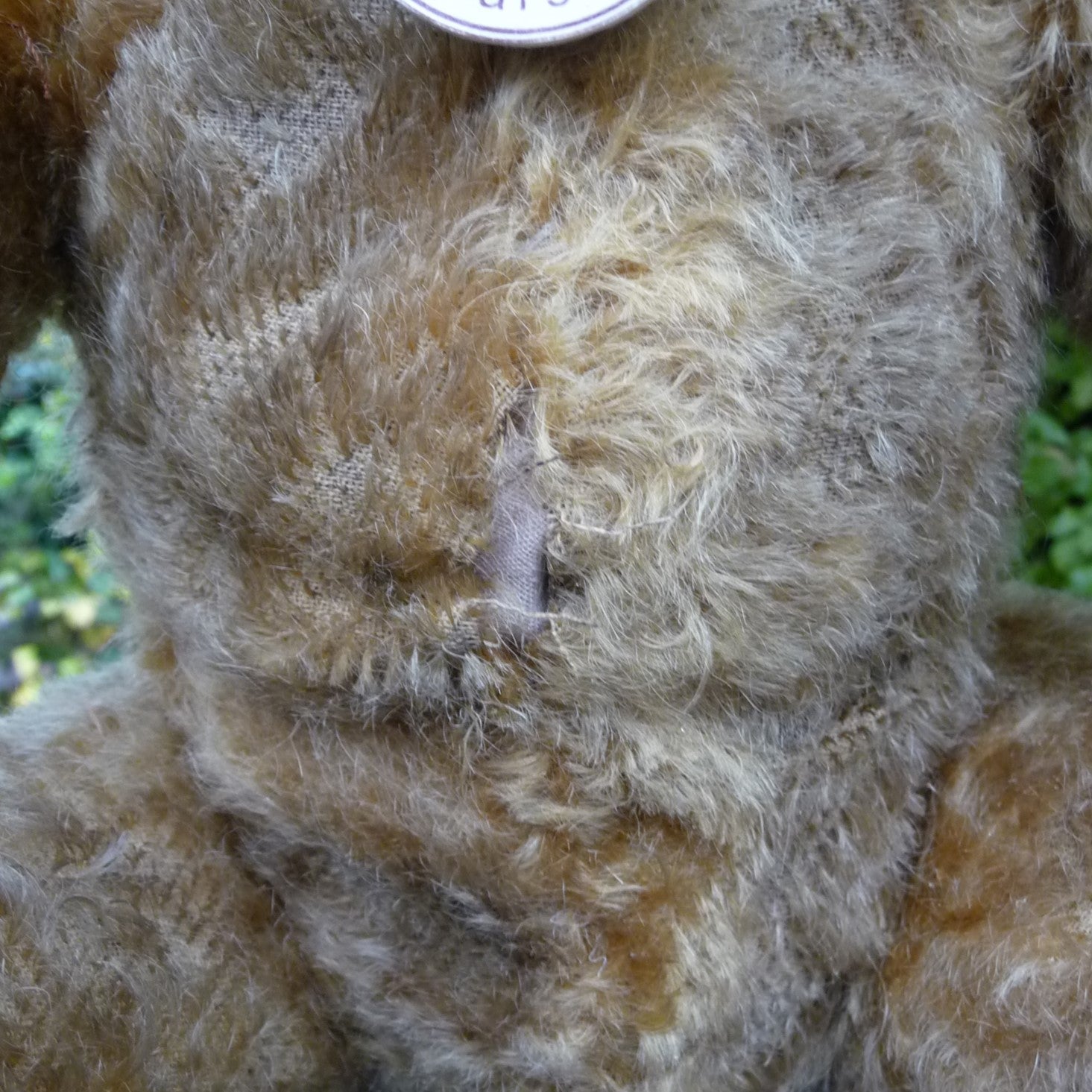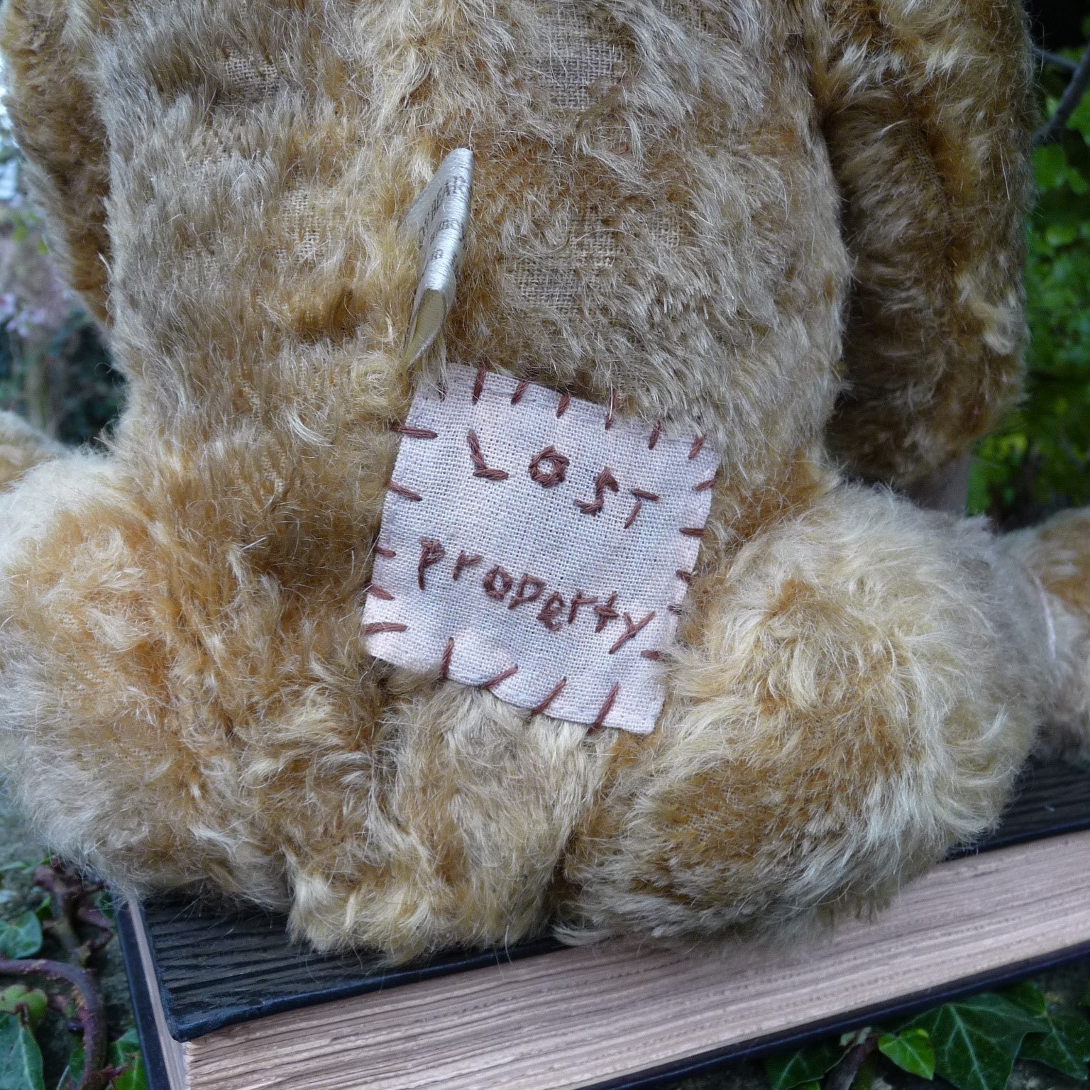 The replica is so extensively aged that he could easily be mistaken for the original! Made of aged and hand-plucked, old gold mohair, he (like the original) has just one button eye, a ‘worn’ nose with red felt visible below the thread, one partly unstitched ear, a hole in his tummy and re-covered, hand-painted foot pads. He comes with a Lost Property label, a copy of a 1918 postcard )featuring the original bear with the owner's 2 daughters) and a certificate. Our last few bears of the edition come with an additional hand-embroidered label sewn at the bottom of his back (see photo).