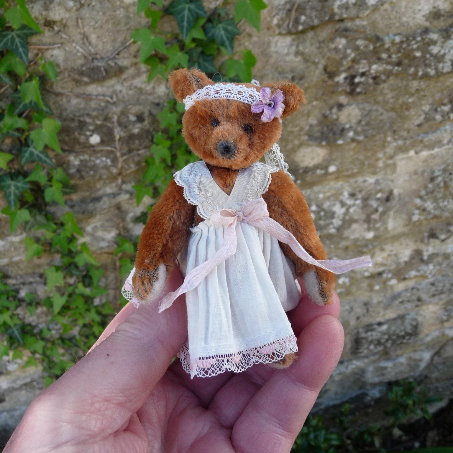 This finely detailed miniature bear is made of hand-dyed cinnamon mohair with black glass eyes, a waxed thread nose and felt paw pads. Weighted with steel pellets, Florrie wears a vintage cotton and lace dress and a ribbon headband, decorated with a vintage violet flower.