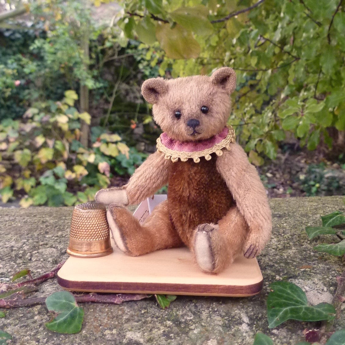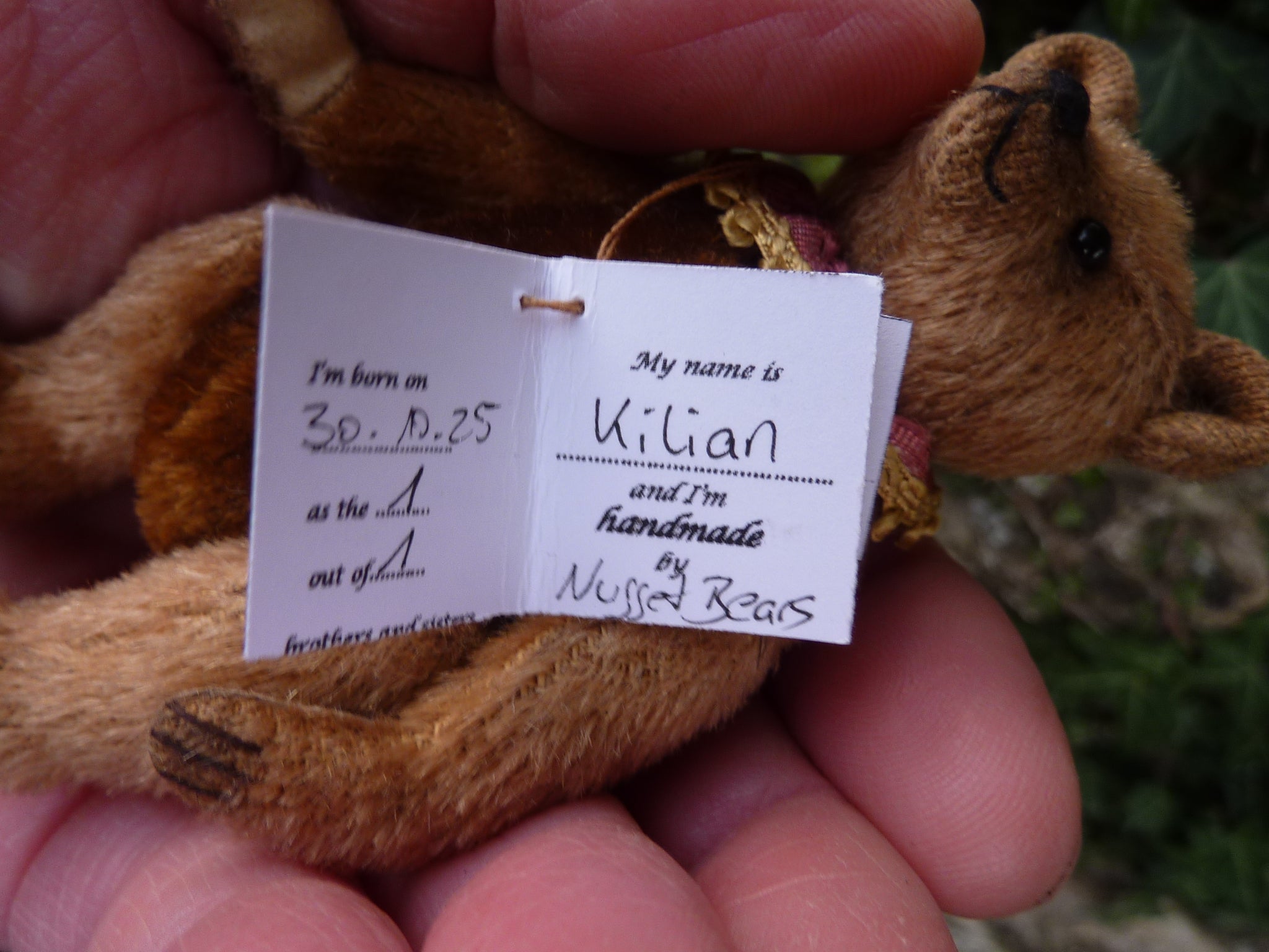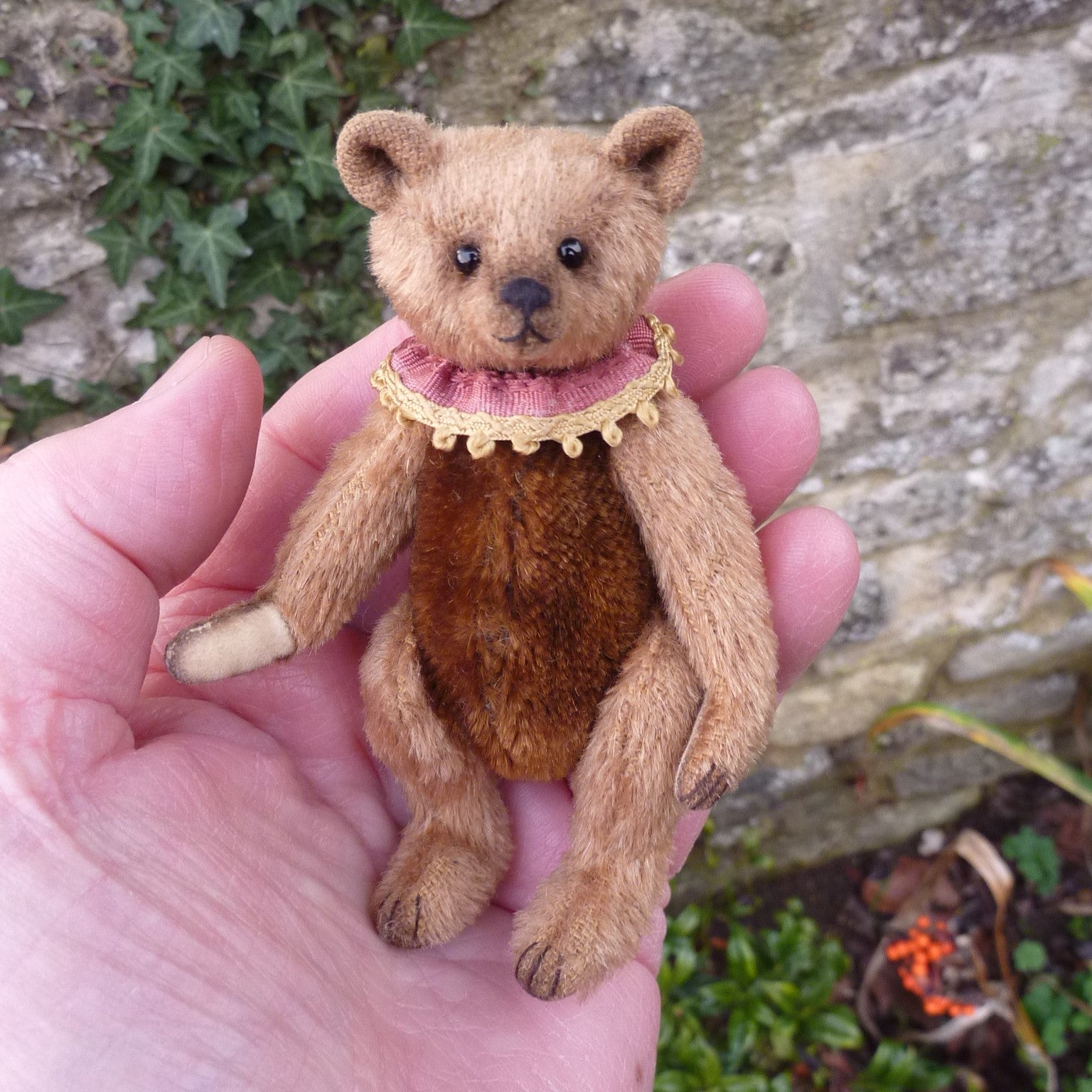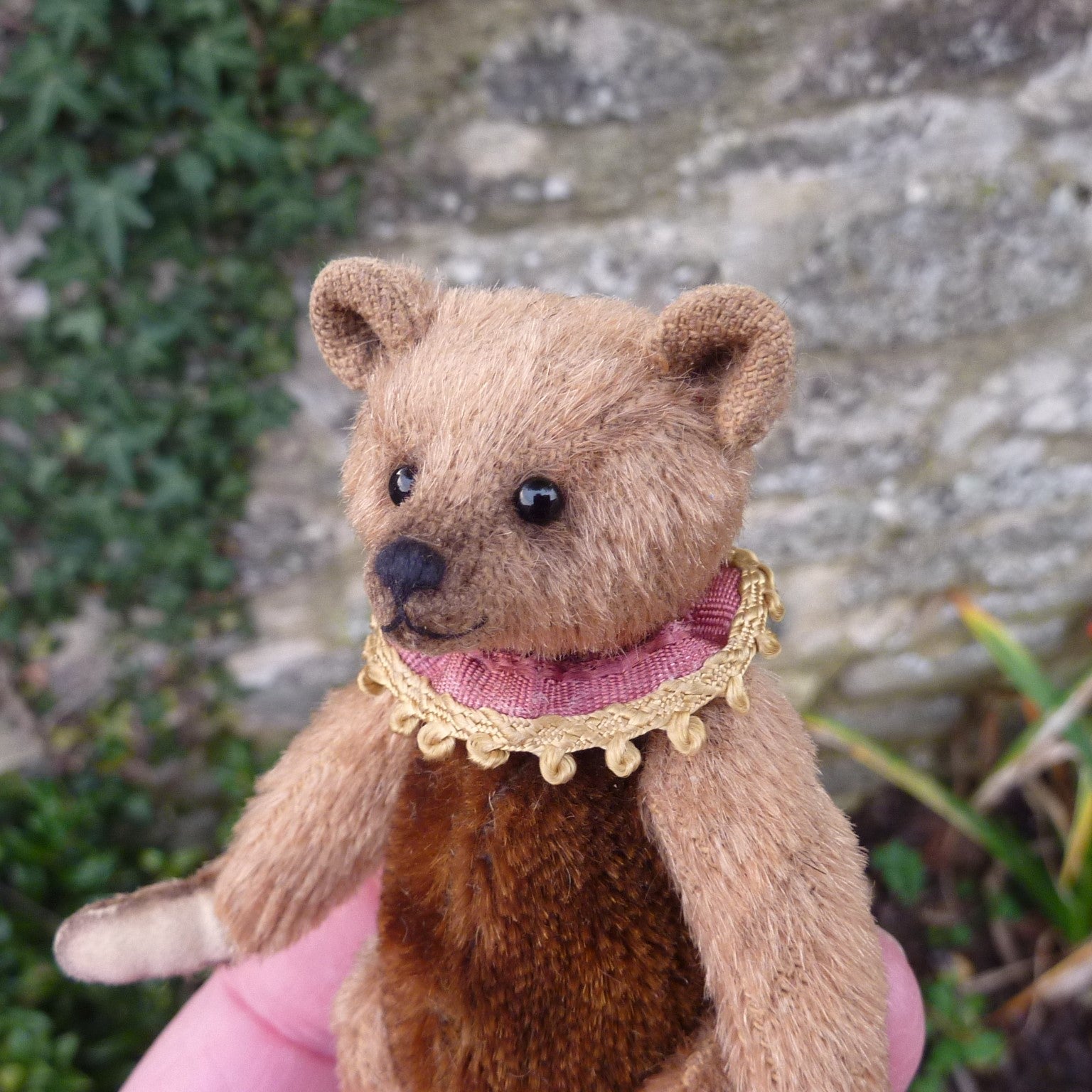 Small and, different, Kilian is made of light brown mohair with a dark brown mohair body. (The mohair in both colours is antique.), He has black glass eyes and faux suede paw pads, Filled with sheep’s wool and weighted with steel shot, he wears a ribbon collar.