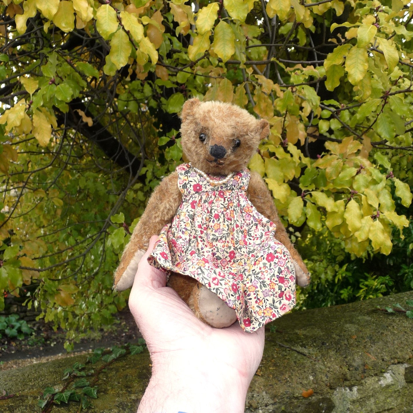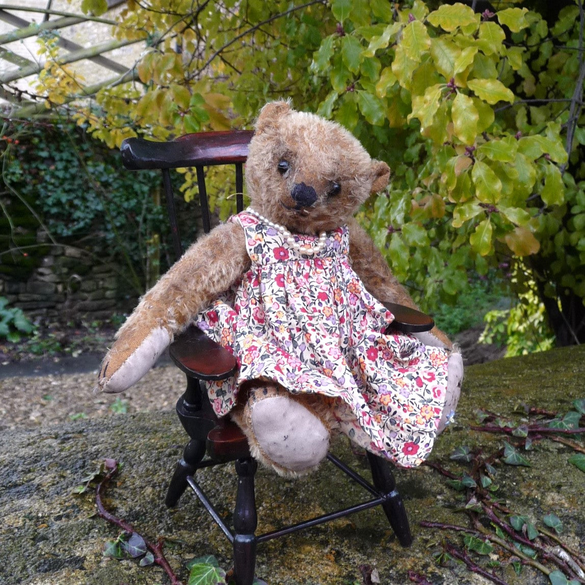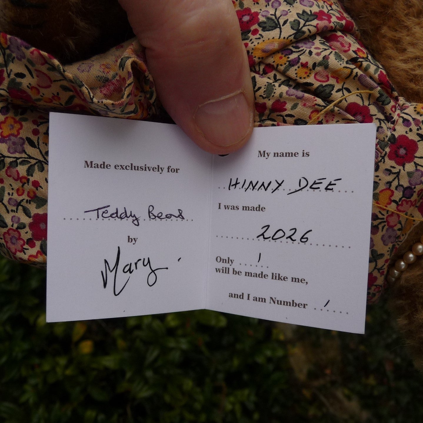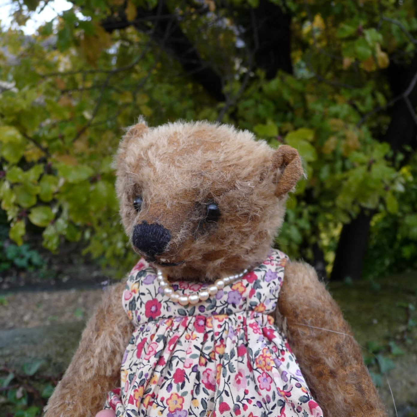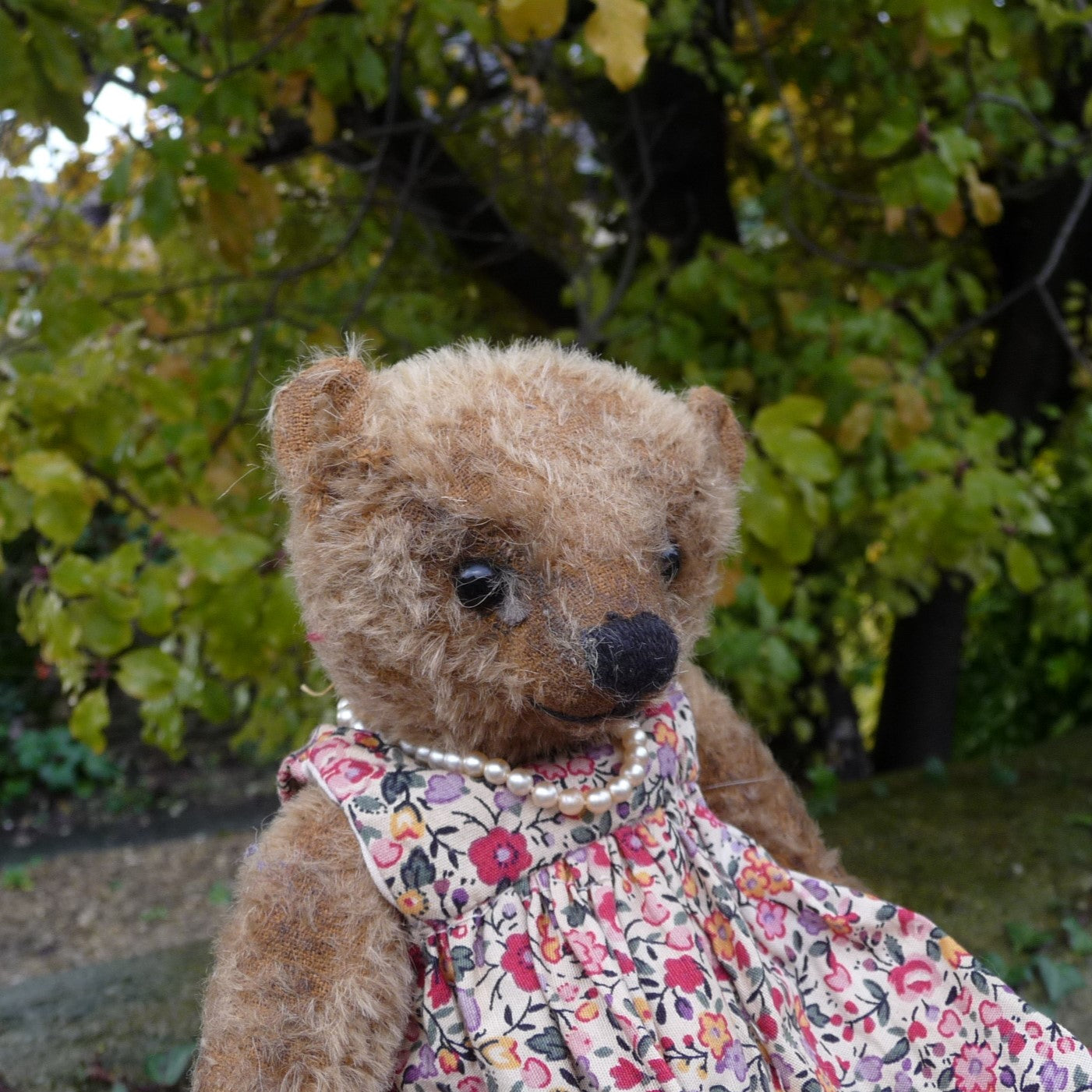 Made of aged and extensively hand-plucked, gold-brown mohair, Hinny Dee has black glass eyes and aged linen paw pads. Softly and heavily filled with a mixture of wood shavings and mineral granules, she wears a pretty, floral-print pinafore dress and a pearl necklace.