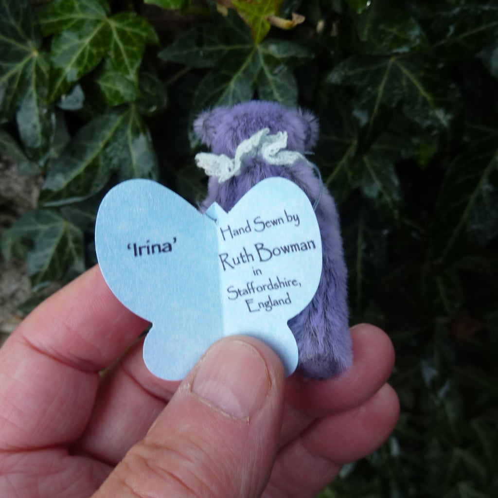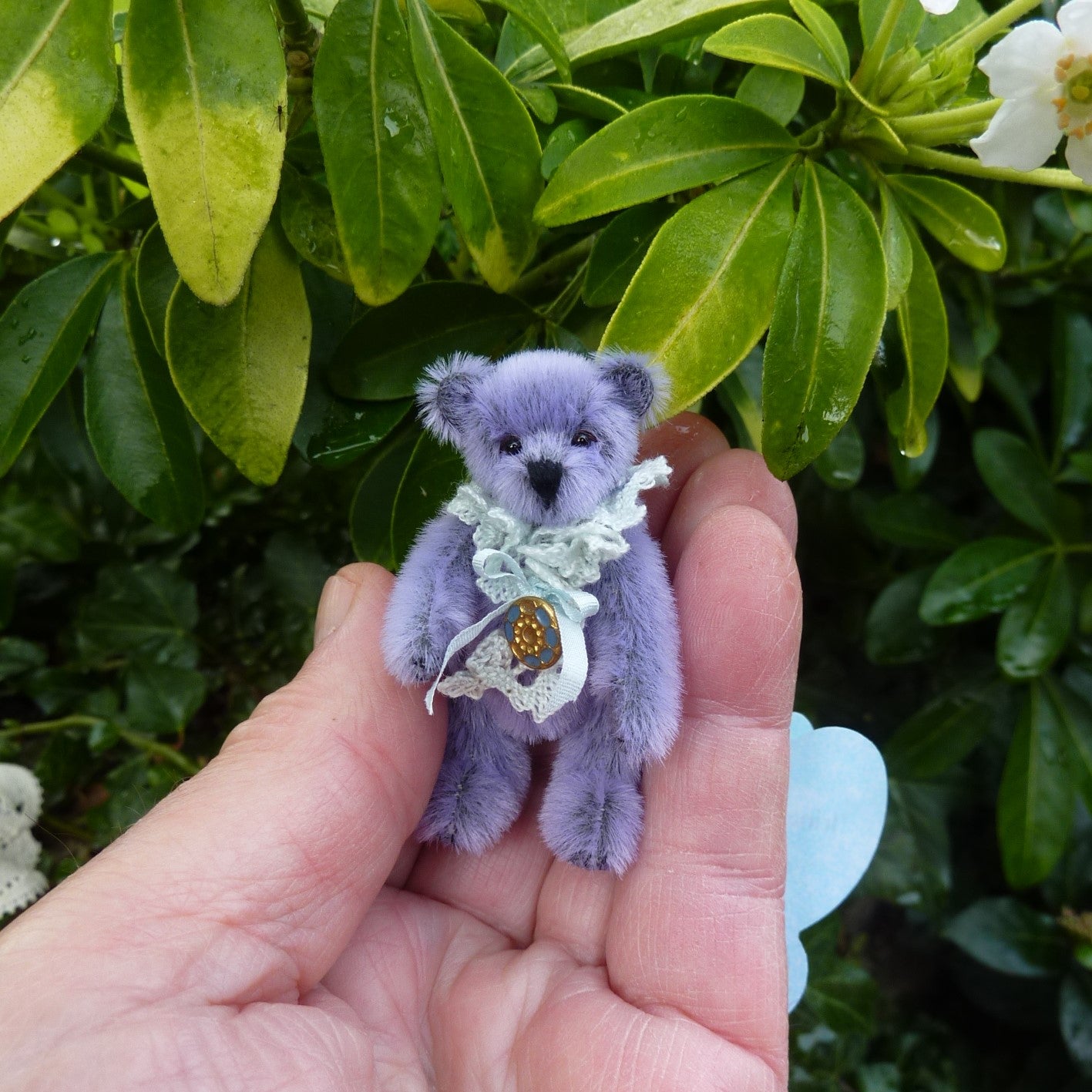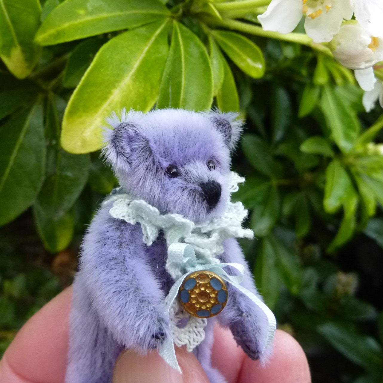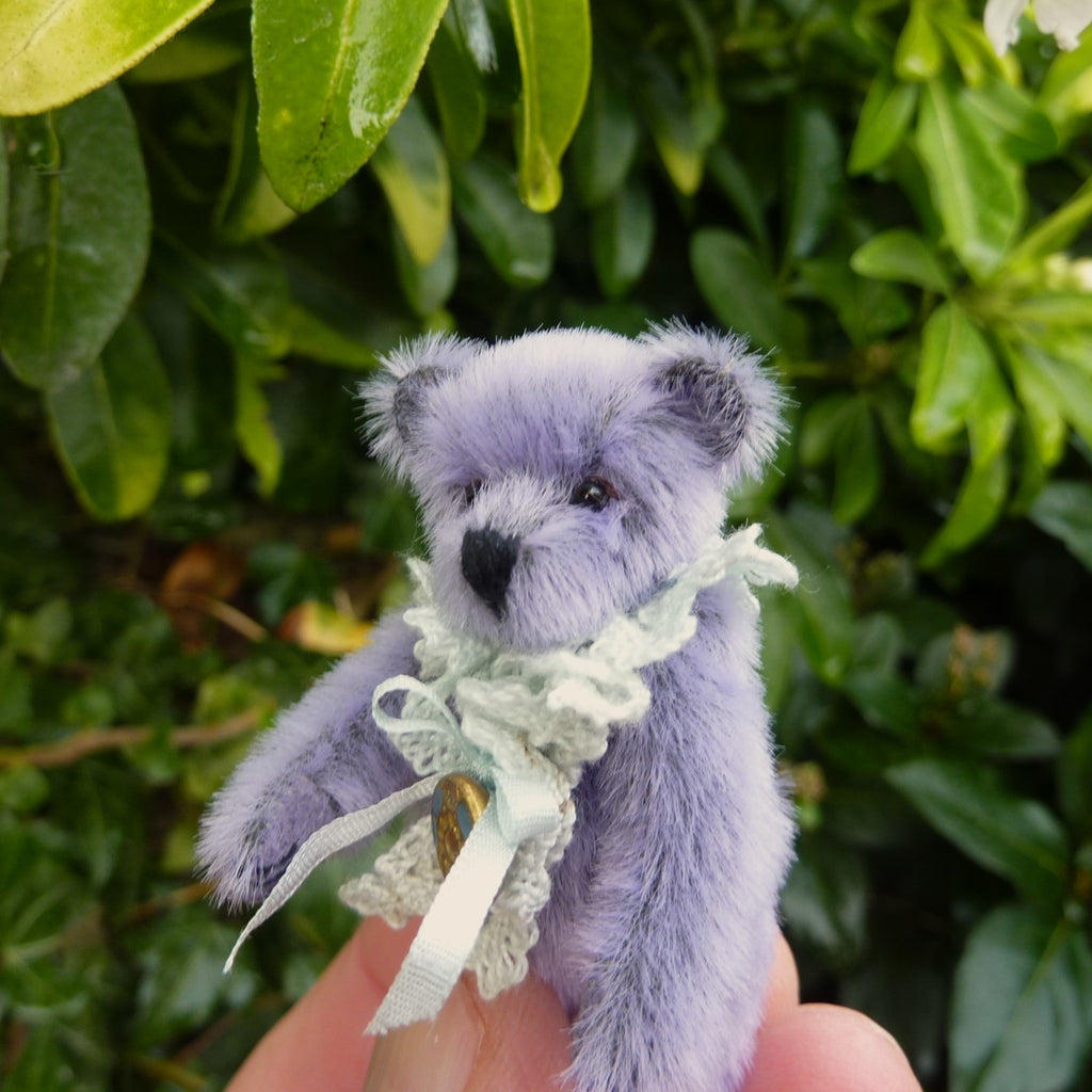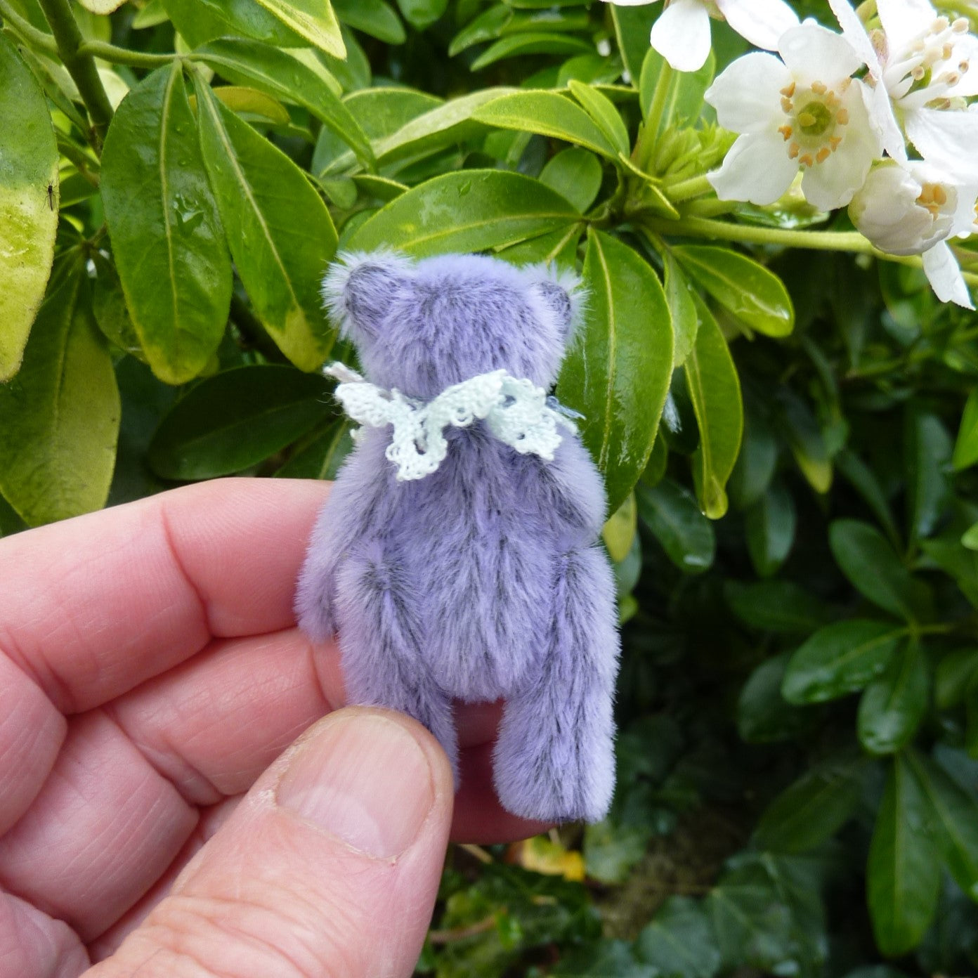 This finely detailed, little bear is made of dark-backed, dark lilac, manmade velvet with onyx bead eyes and Ultrasuede paw pads. She wears a ruffled, vintage lace collar with a vintage button applique.