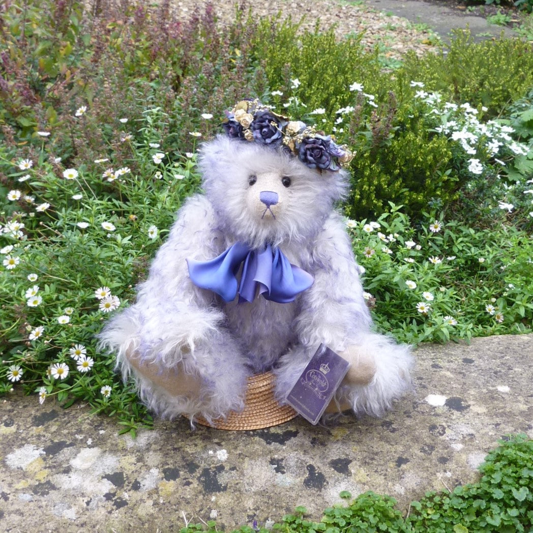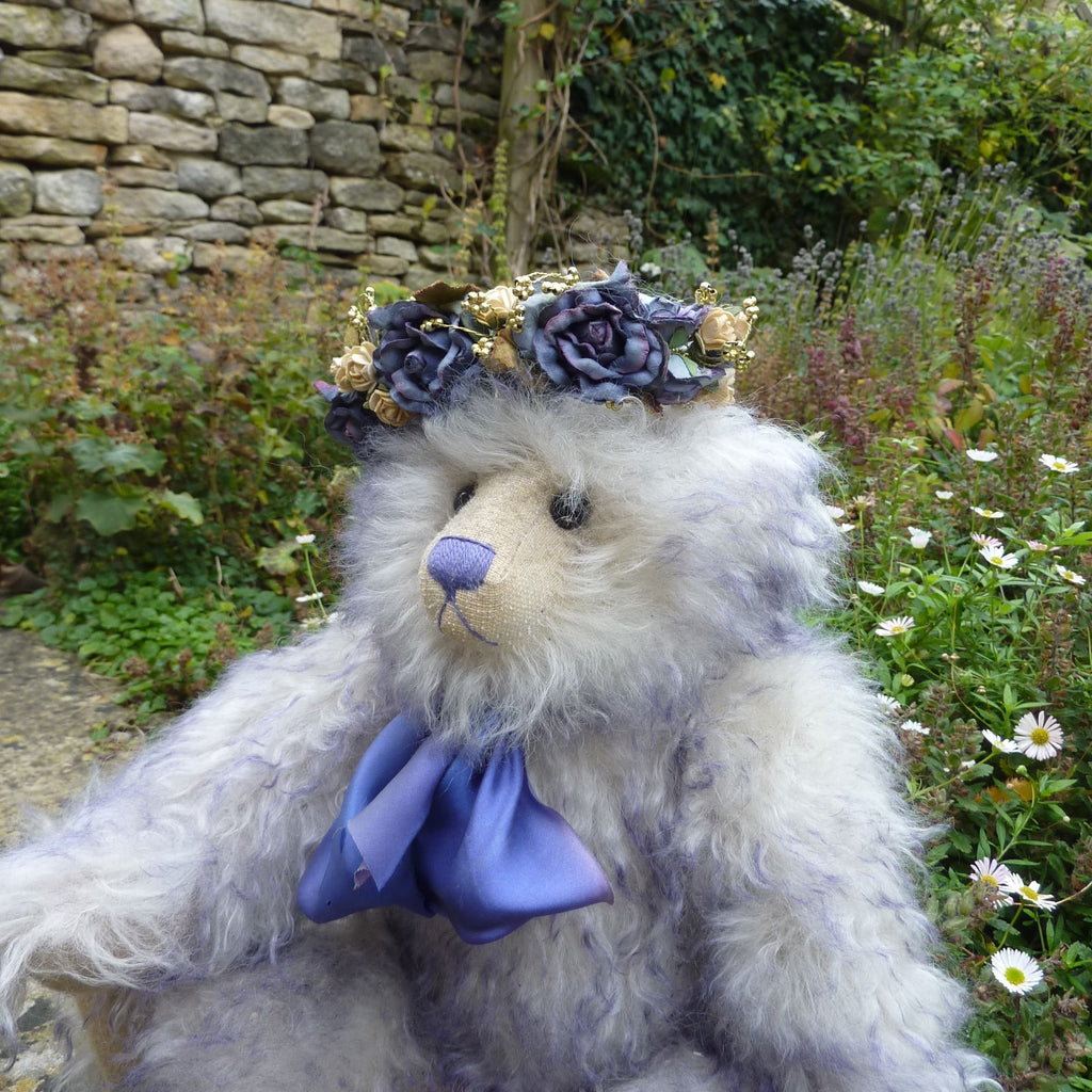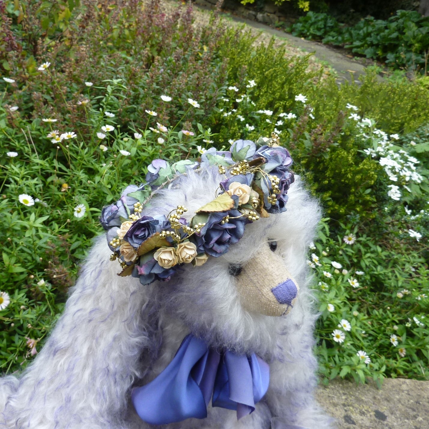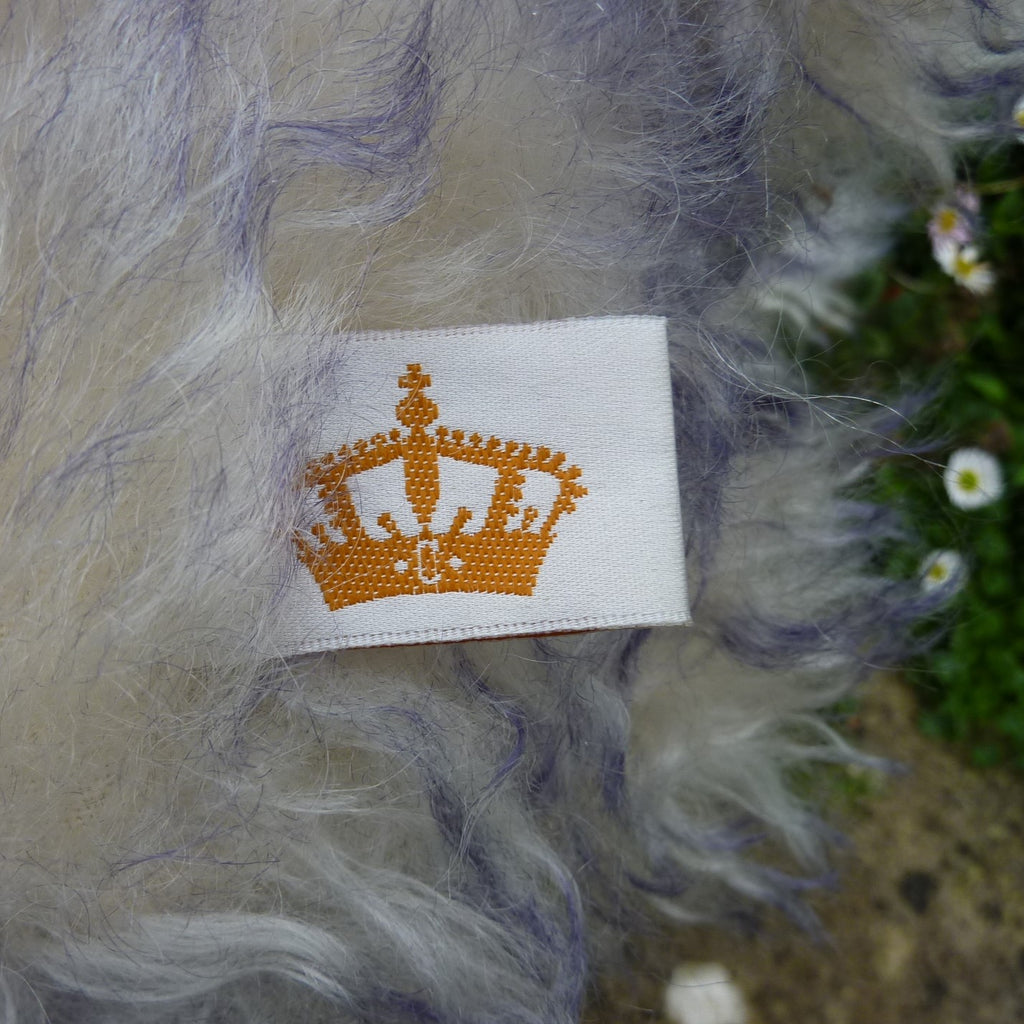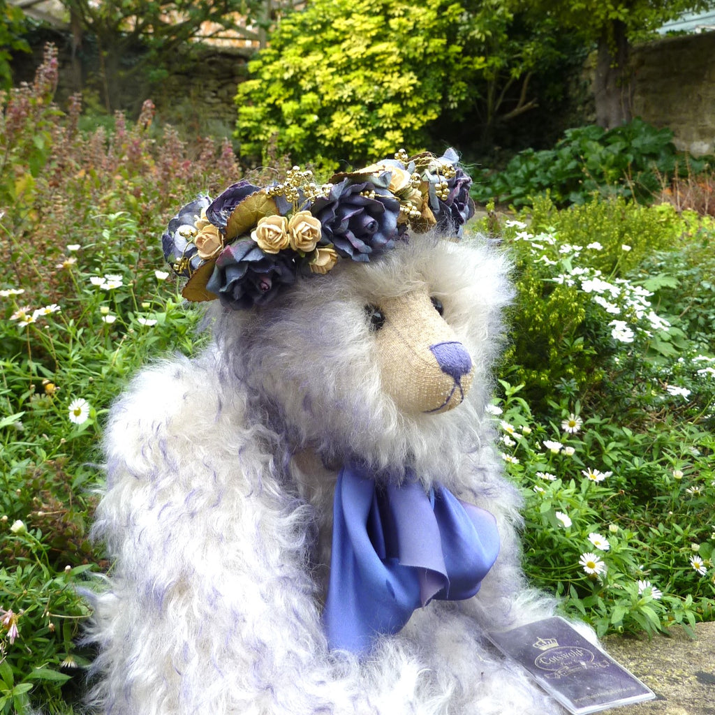 Heavily and firmly filled, this large and striking bear is made of luxurious, extra-long and wavy, lilac-tipped white mohair with shiny black glass eyes, a shaved muzzle, a lilac-stitched nose and felt paw pads. She wears a floral crown with gilt berries. Number 11 of the edition, she is in excellent condition with certificate. (If sent to an overseas customer, there with be a £65 surcharge towards the airmail cost.)