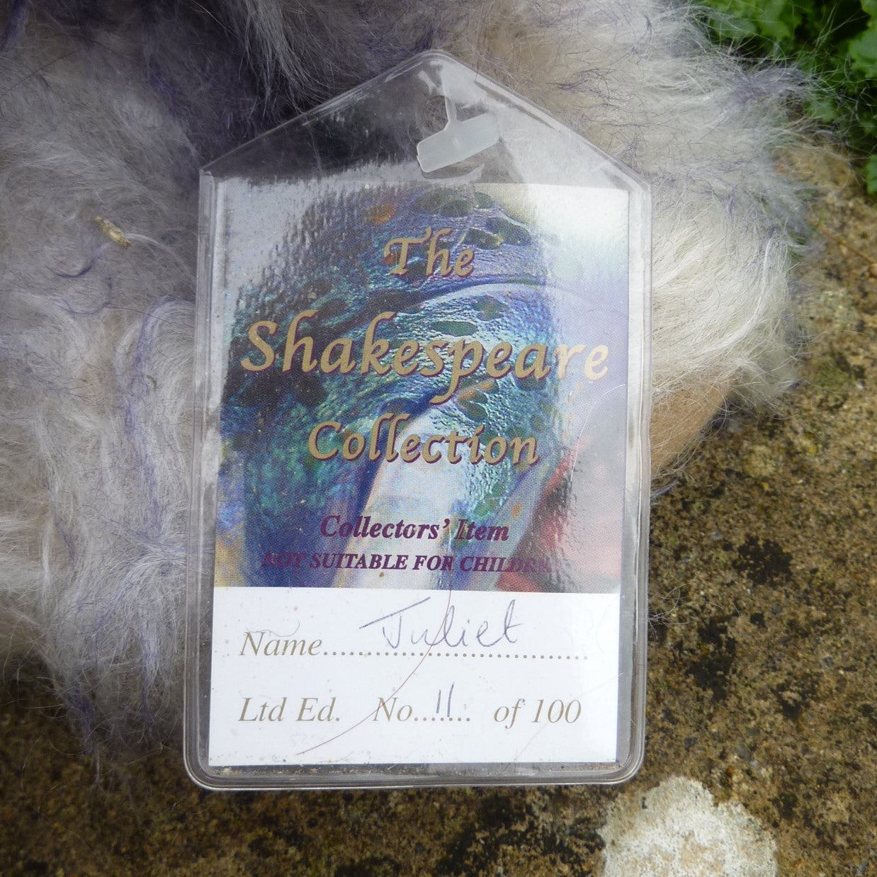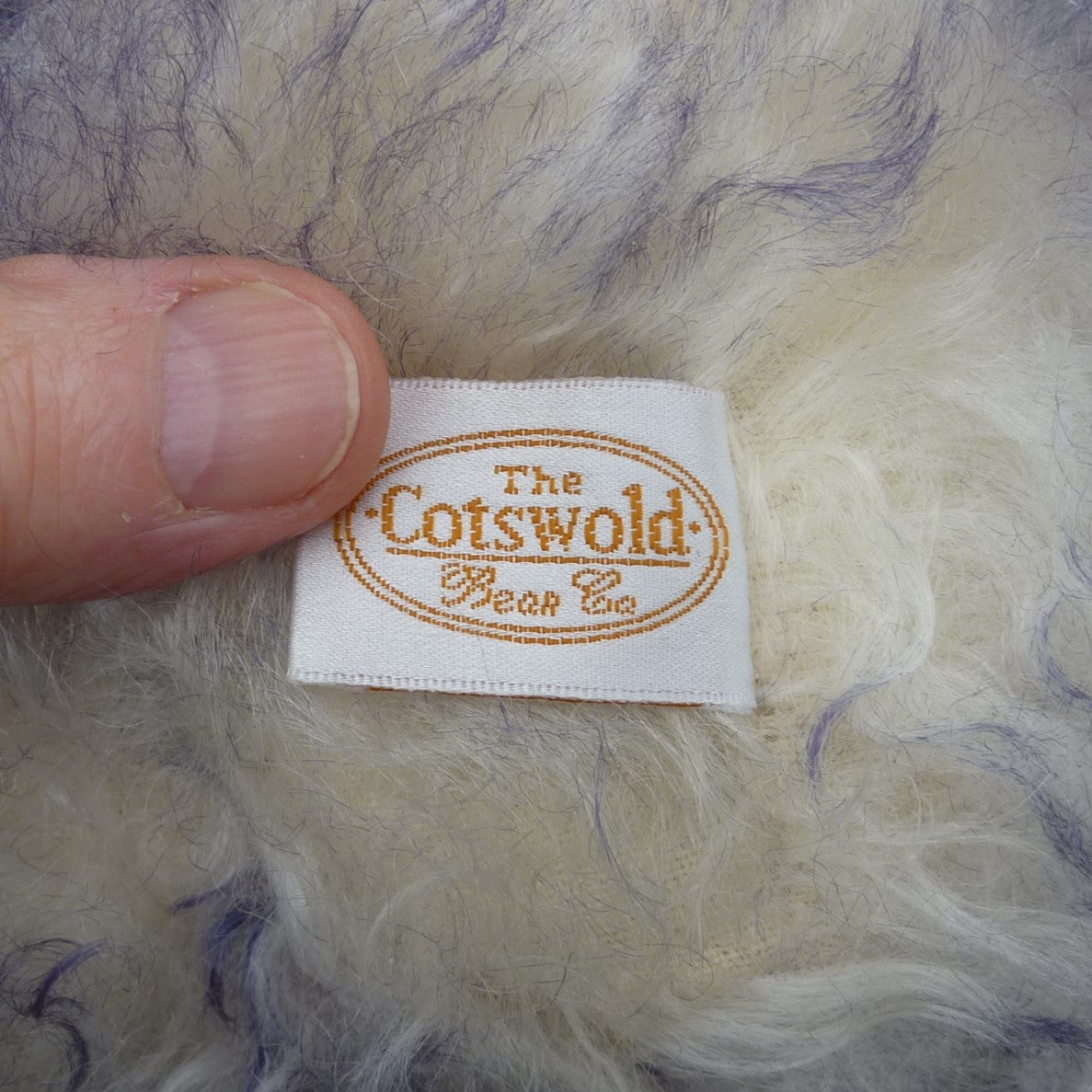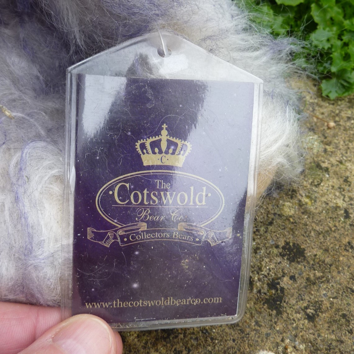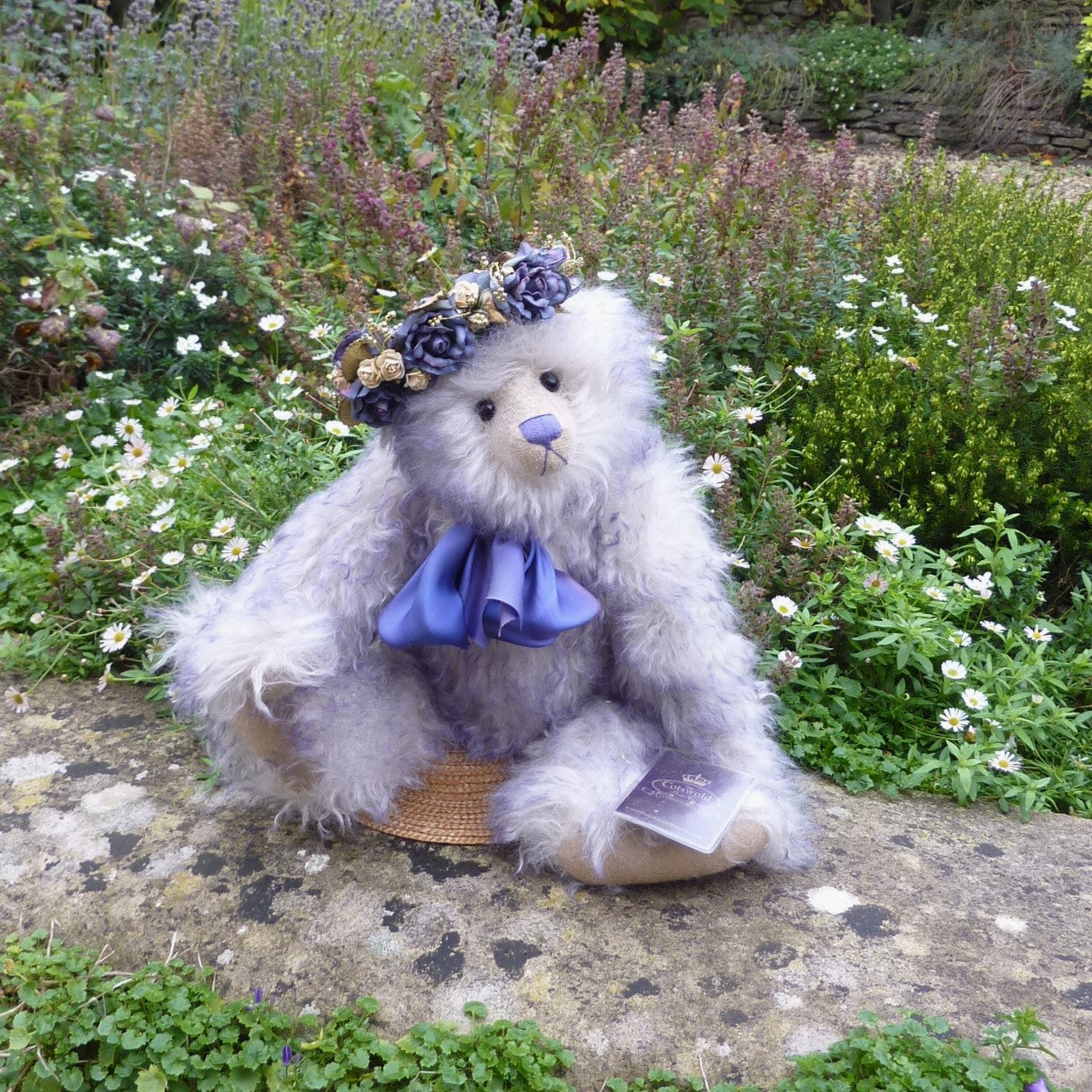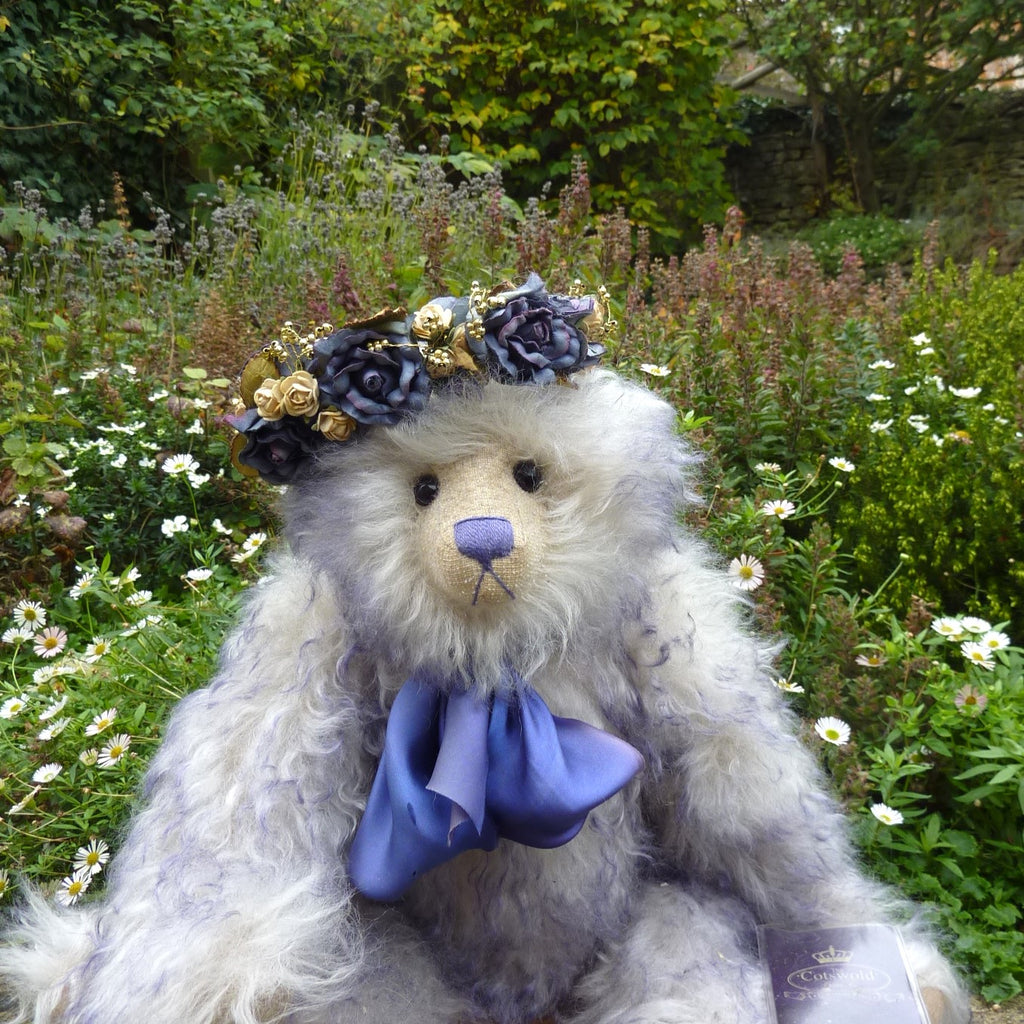 Heavily and firmly filled, this large and striking bear is made of luxurious, extra-long and wavy, lilac-tipped white mohair with shiny black glass eyes, a shaved muzzle, a lilac-stitched nose and felt paw pads. She wears a floral crown with gilt berries. Number 11 of the edition, she is in excellent condition with certificate. (If sent to an overseas customer, there with be a £65 surcharge towards the airmail cost.)