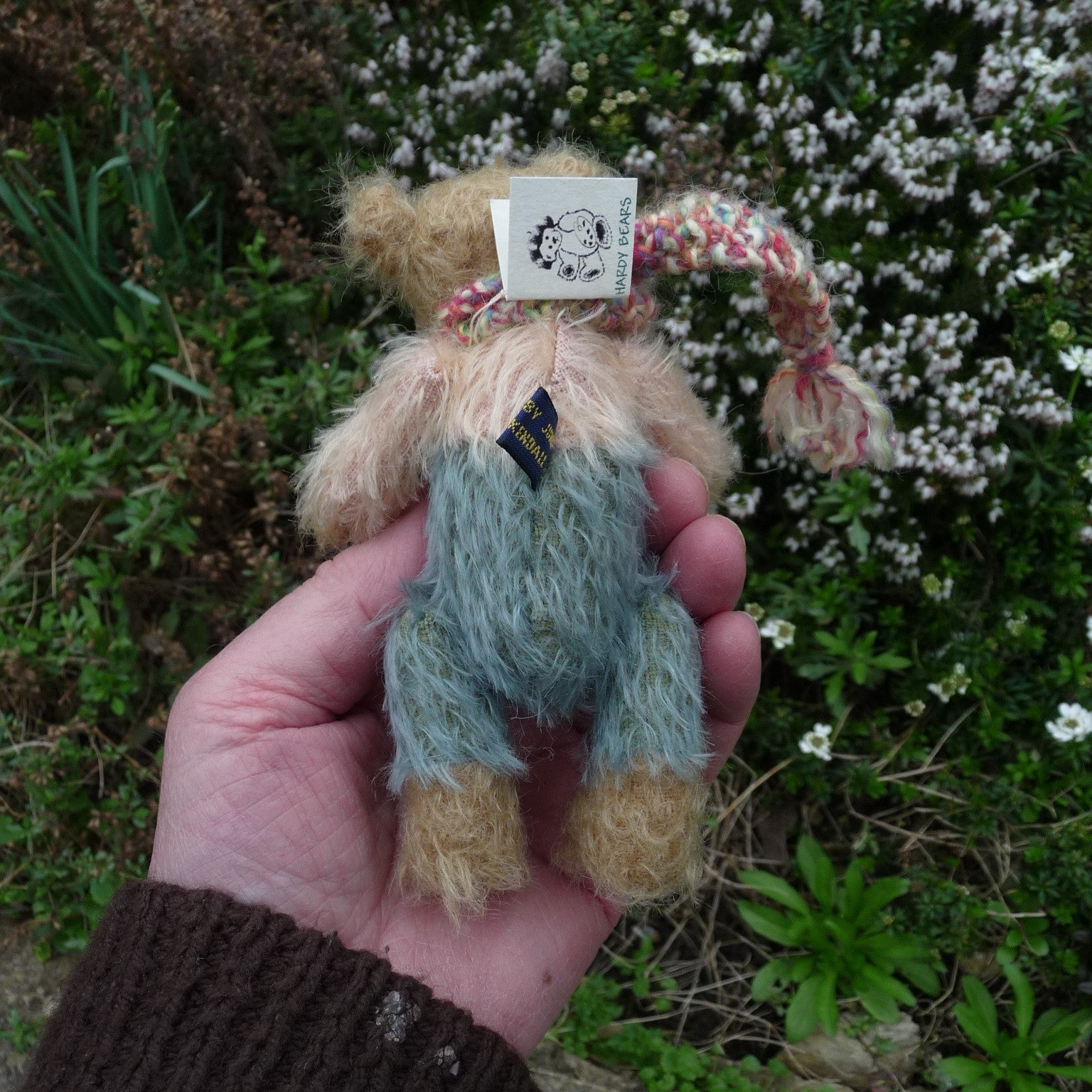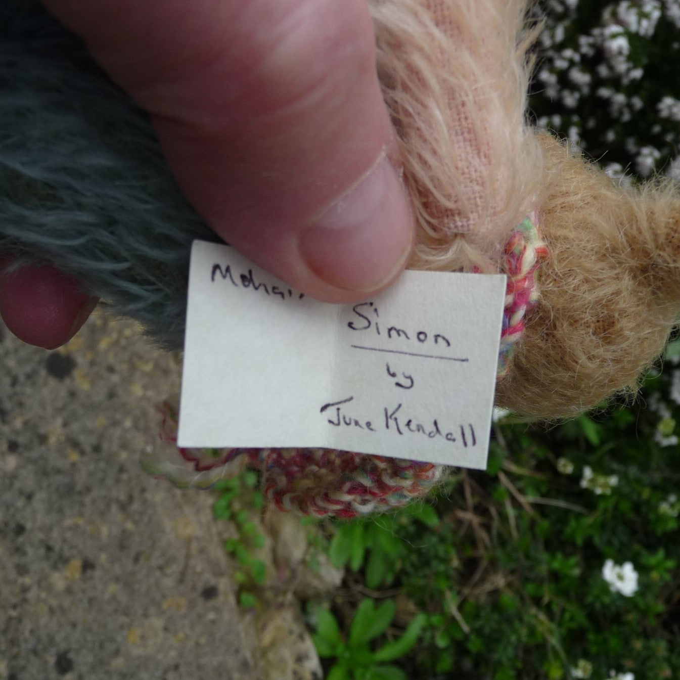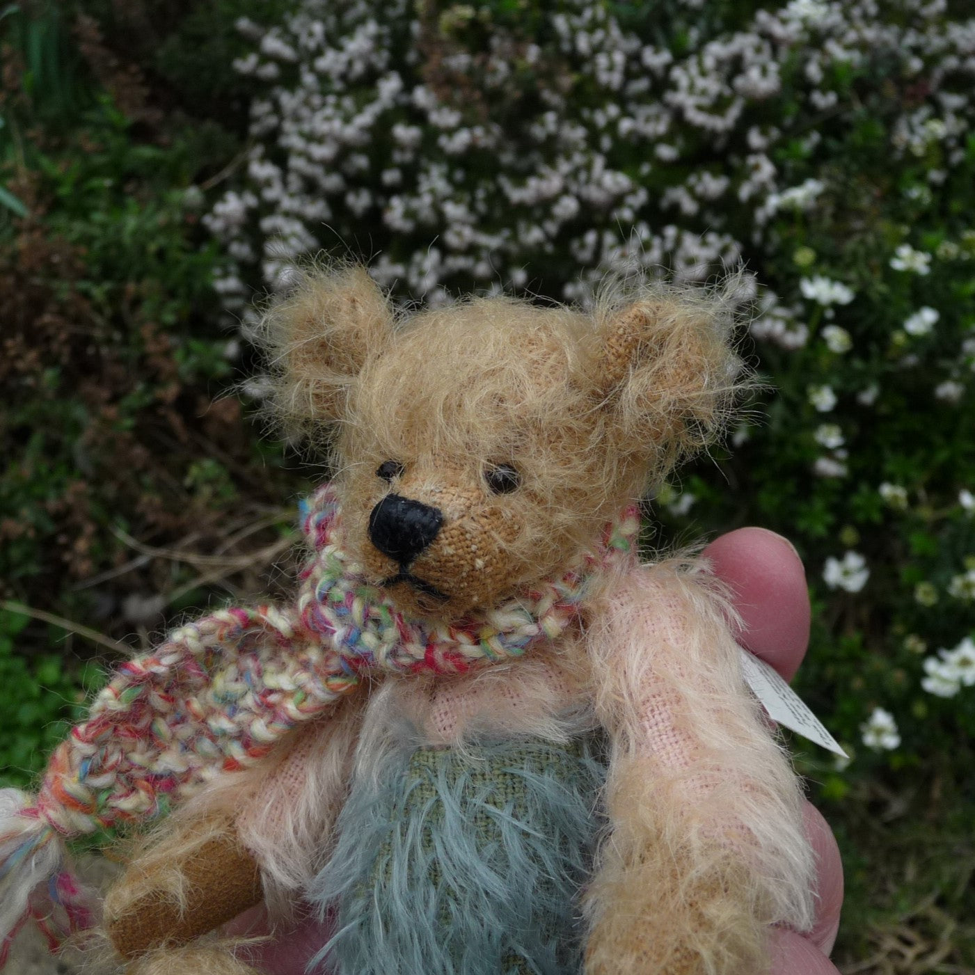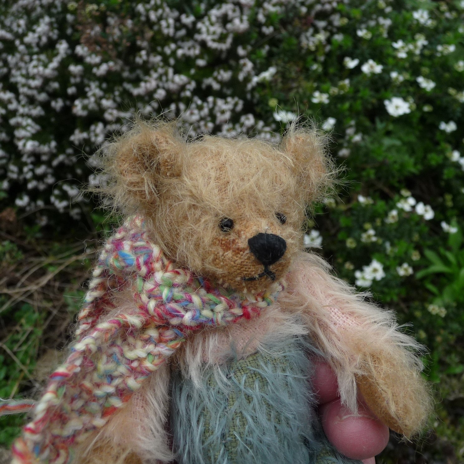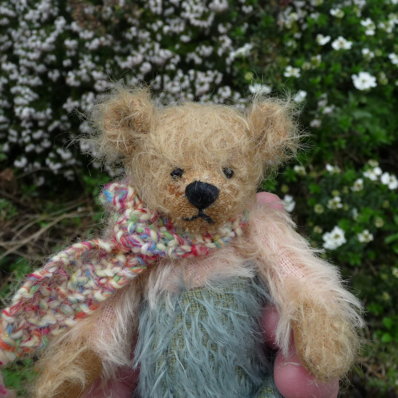 Small and different-looking, Simon is made of ultra-sparse and distressed, old gold mohair with a pink mohair upper chest and arms, and a dusky blue lower body and upper legs. He has small black onyx eyes and faux suede paws. Filled with polyfibre, with a little steel shot added for weight, he wears a hand-knitted multi-coloured scarf.