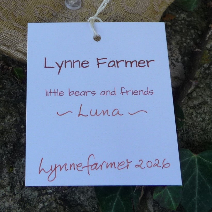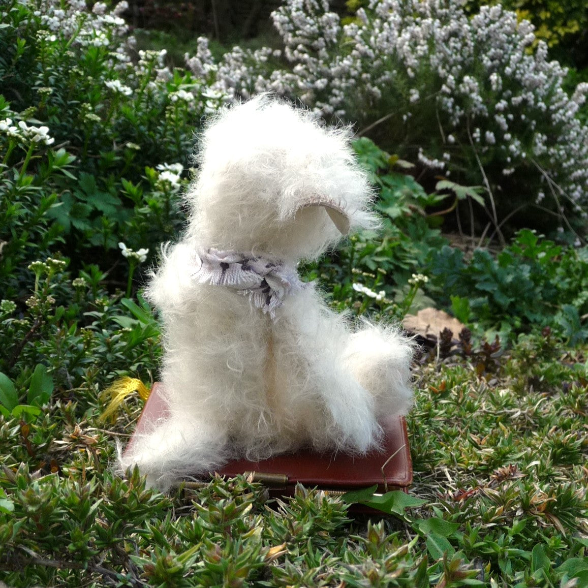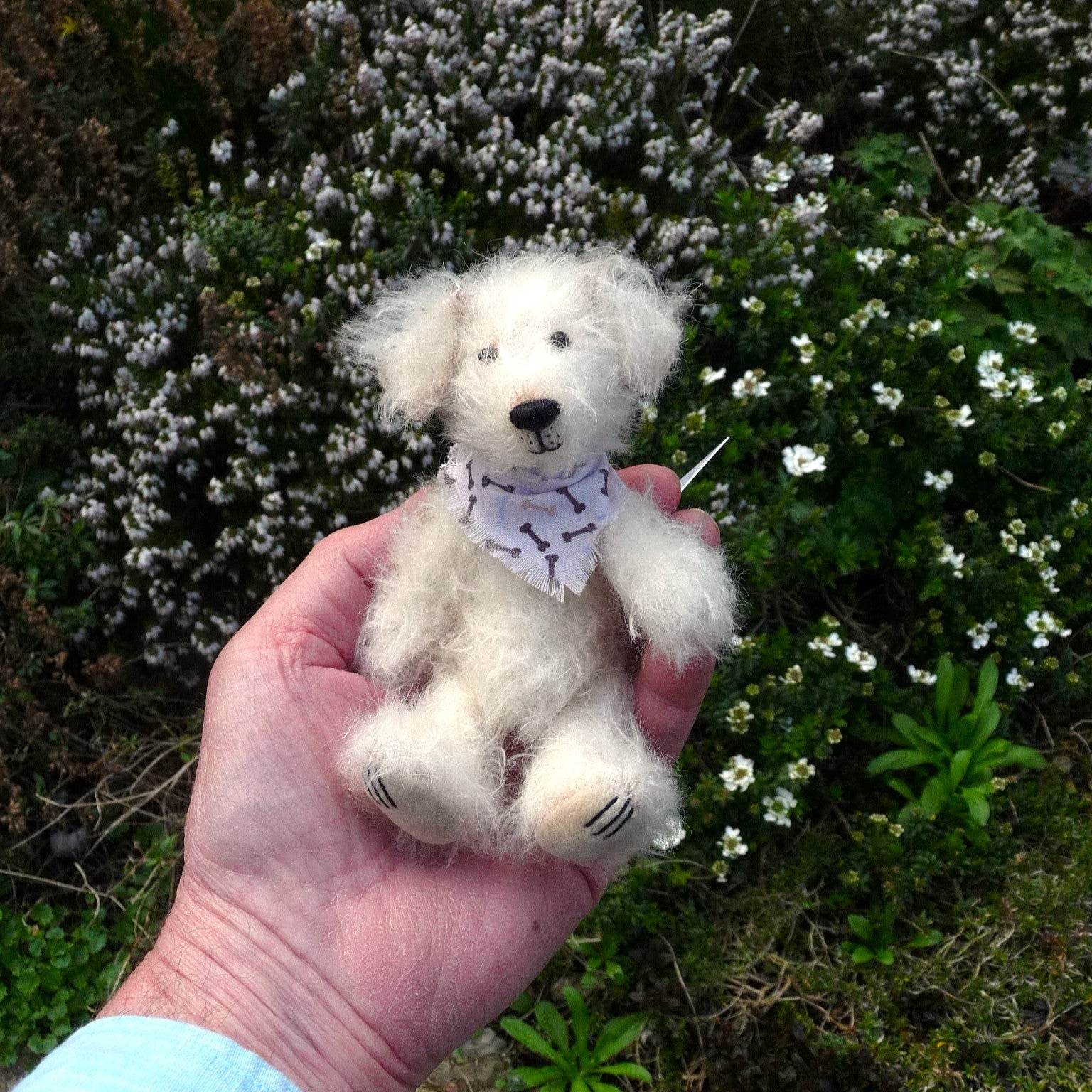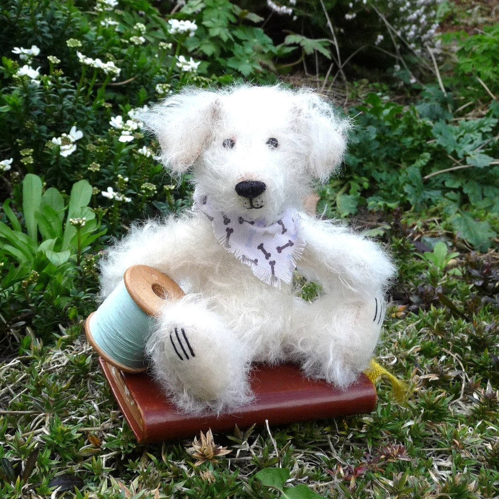 This delightful little terrier is made of ultra-sparse and distressed, white mohair with black glass eyes, fold-over ears, cashmere foot pads and a little tail. Fully jointed, Softly filled with polyfibre, and weighted with copper-plated steel beads, Luna wears a bone-printed neckerchief.