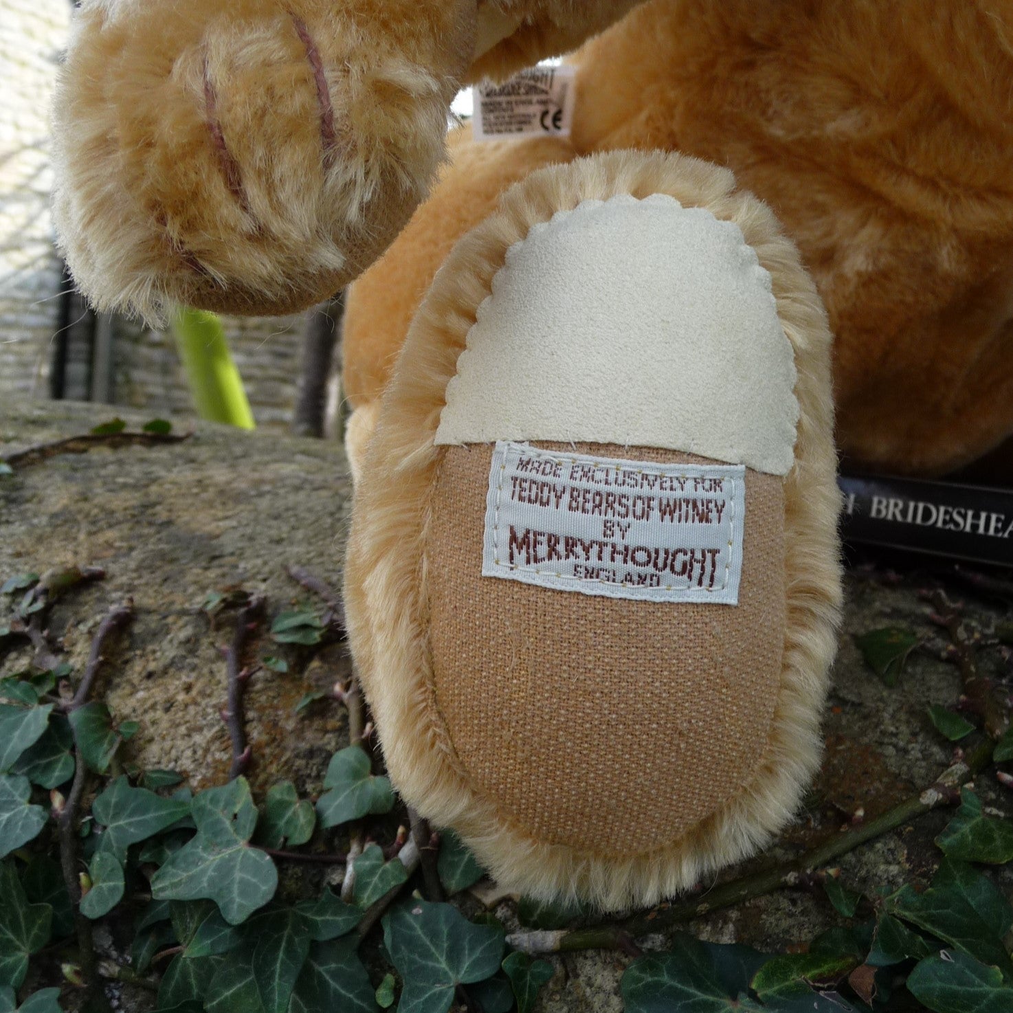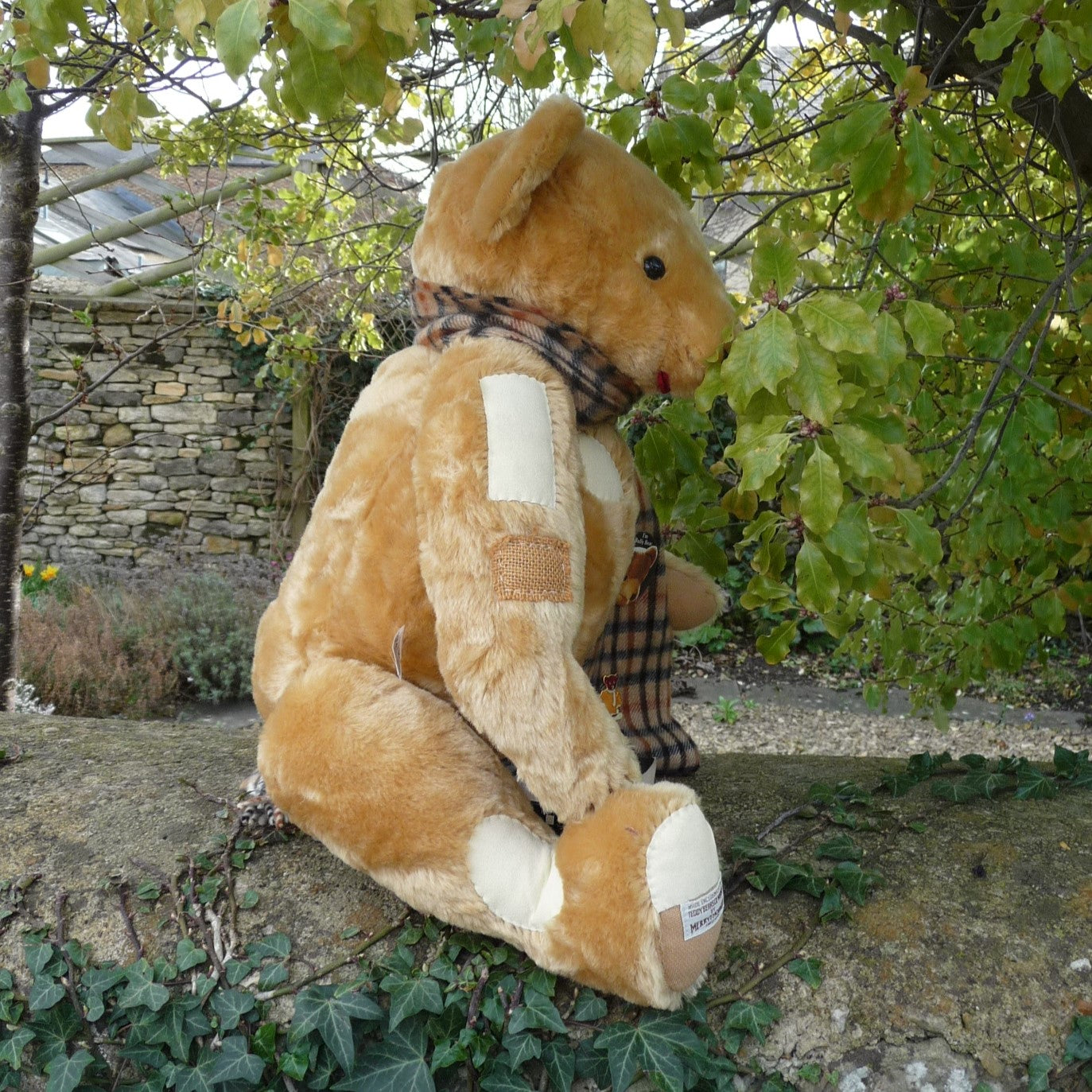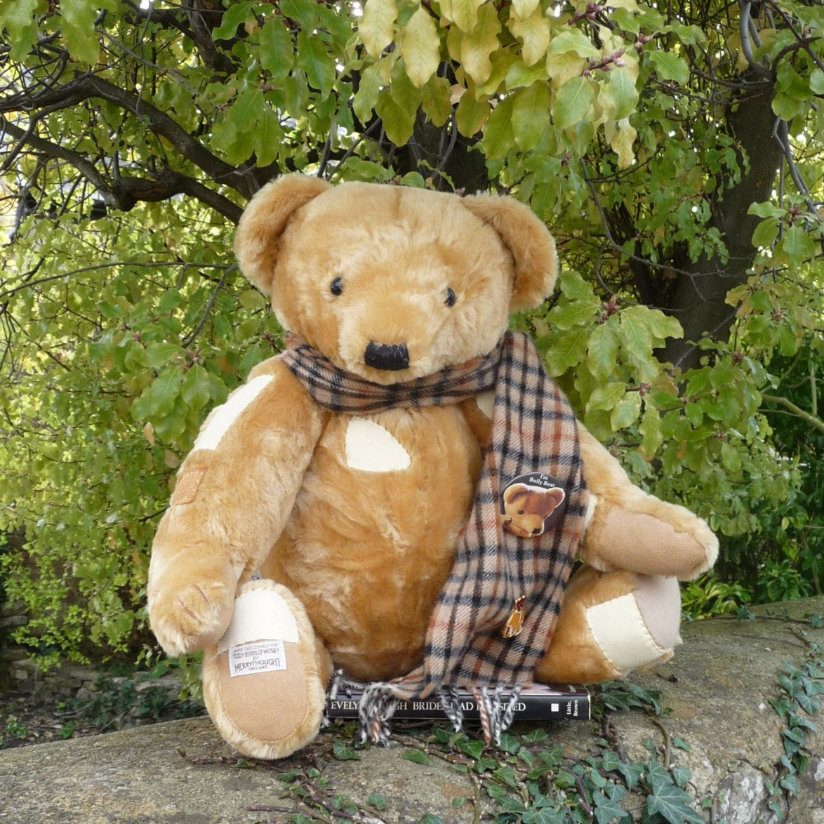 This large (actual size) Aloysius replica was made in England by Merrythought from lightly distressed, traditional gold mohair with black button eyes. Like the original, he has 16 hand-stitched chamois leather patches and, under his muzzle, a red felt mouth. His Daks scarf is decorated with a Peter Bull Bully Bear pin and an enamel Alonzo pin. Softly filled, (number 575 of the edition) is as new with certificate.