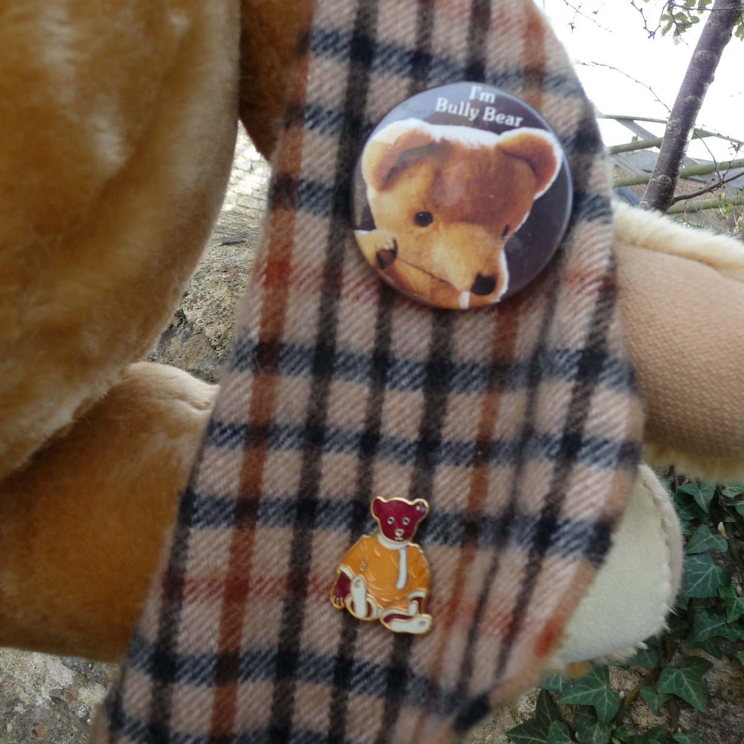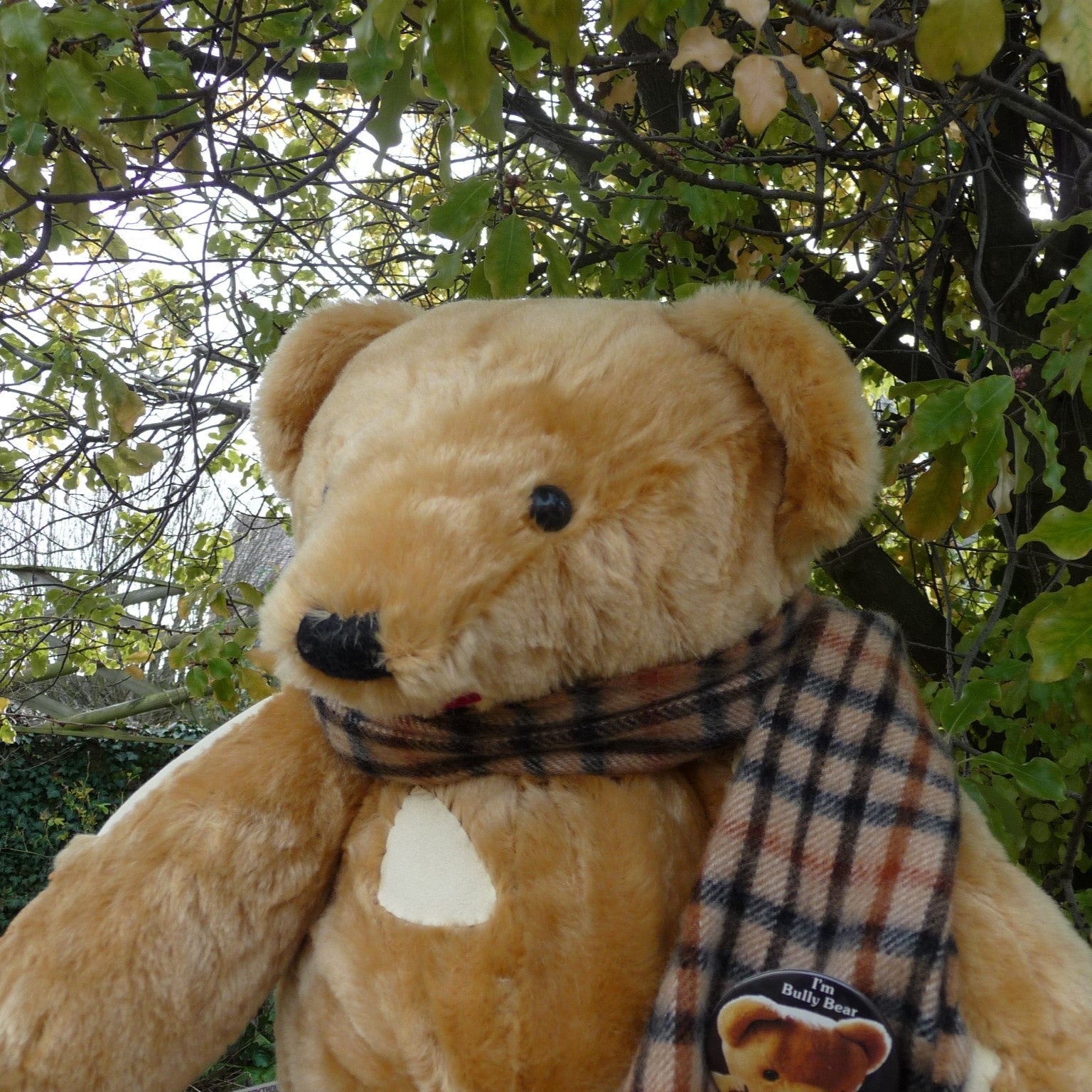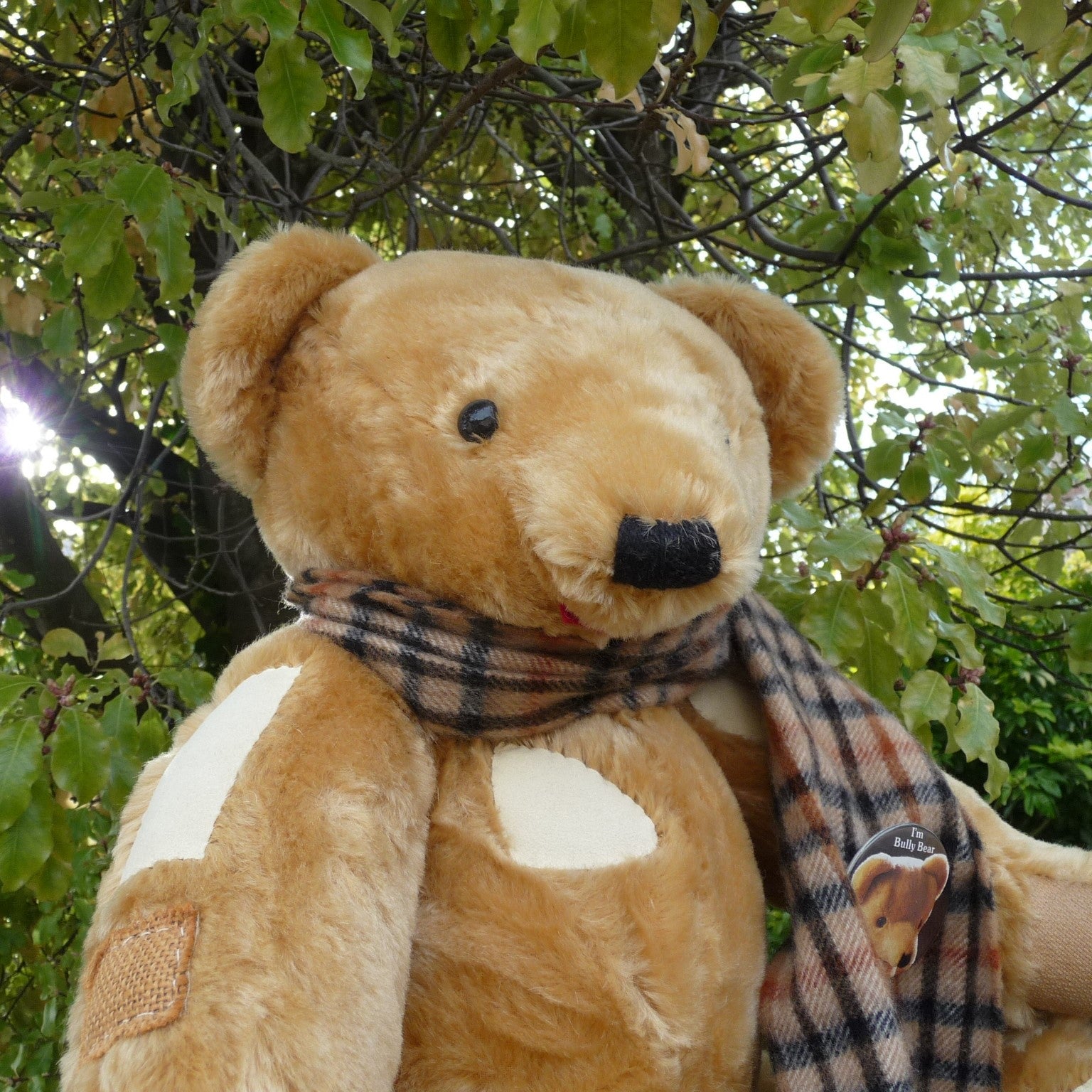 This large (actual size) Aloysius replica was made in England by Merrythought from lightly distressed, traditional gold mohair with black button eyes. Like the original, he has 16 hand-stitched chamois leather patches and, under his muzzle, a red felt mouth. His Daks scarf is decorated with a Peter Bull Bully Bear pin and an enamel Alonzo pin. Softly filled, (number 575 of the edition) is as new with certificate.