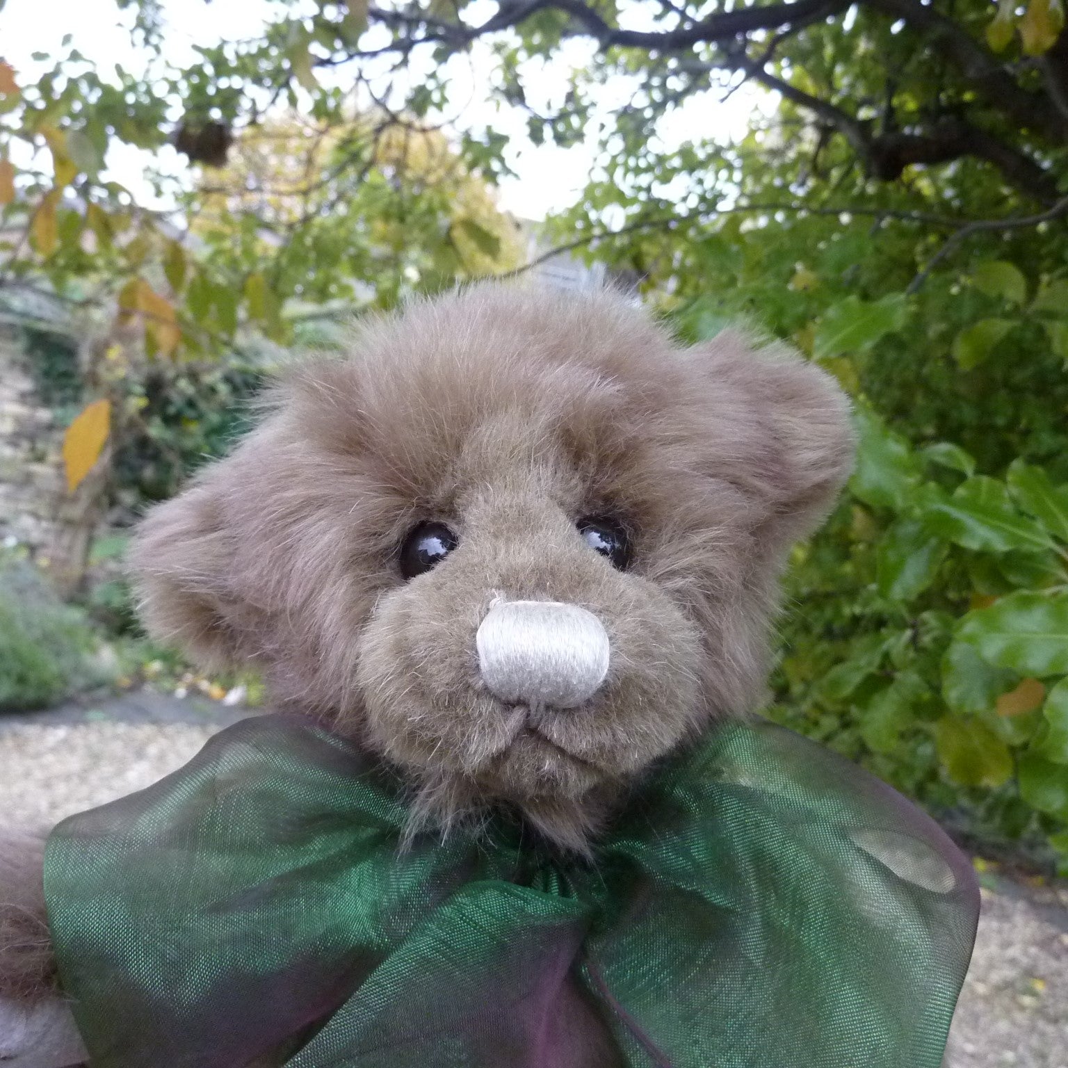 Small to medium-sized, Mr Baggins is made of very soft, long pile grey-brown plush with black safety eyes, a neatly trimmed muzzle, a silvery grey stitched nose and claw-stitched faux suede paw pads. He wears an emerald organza neck bow.