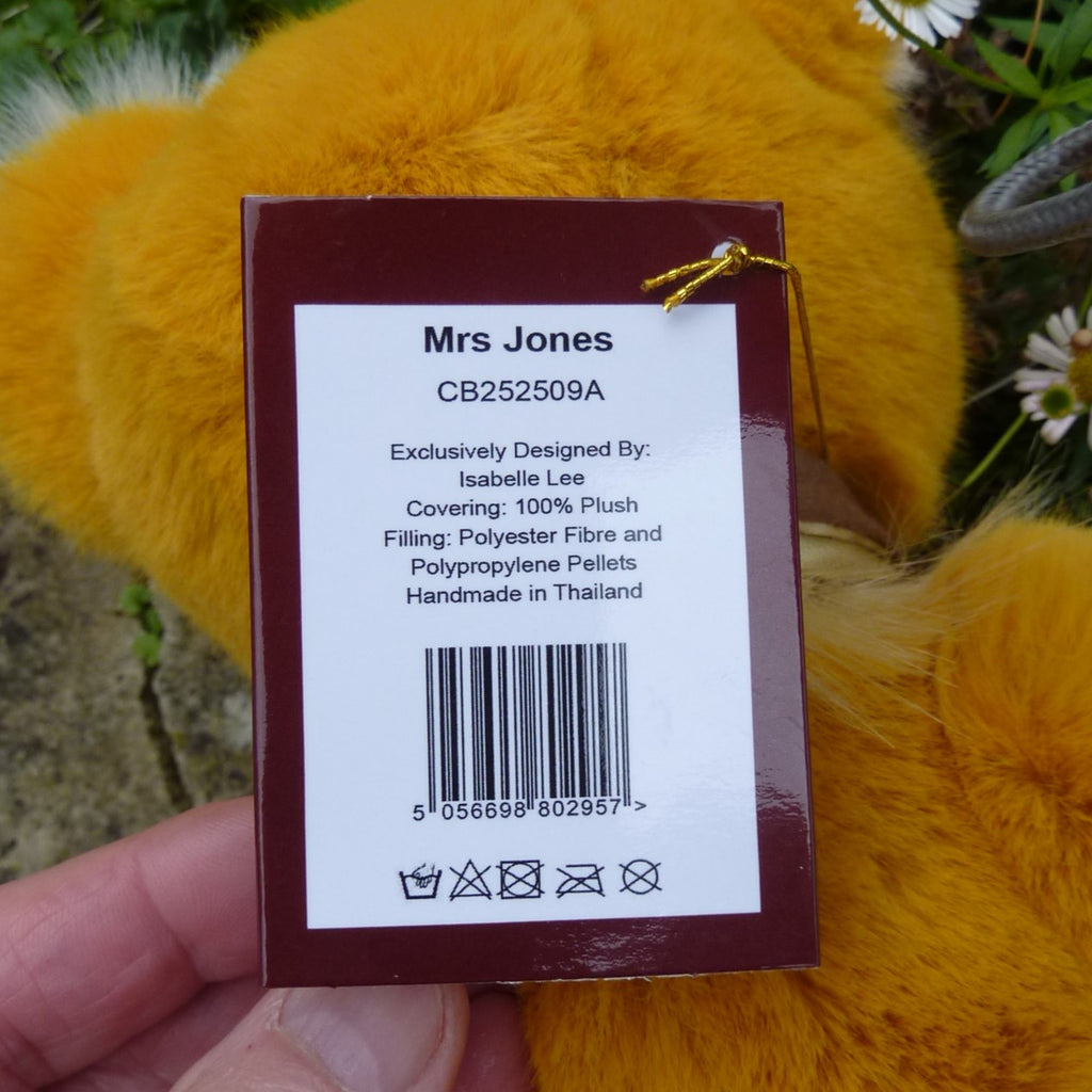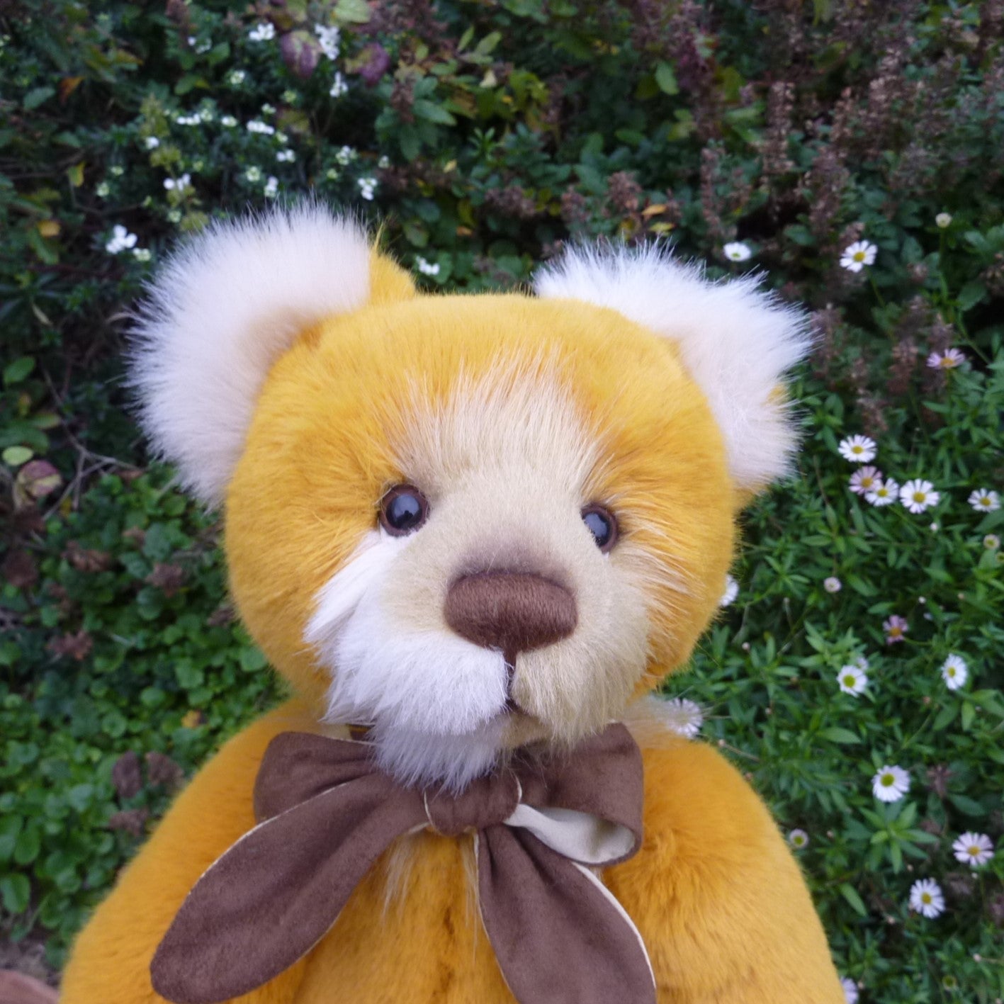 This striking and attractive, medium to large-sized bear is made of dense and ultra-soft, turmeric-coloured plush with brown and black safety eyes, off-white inner ears a pale beige and white muzzle. Fully jointed, she has bear stitch-sculpted faux suede paw pads and wears a brown ribbon neck bow.