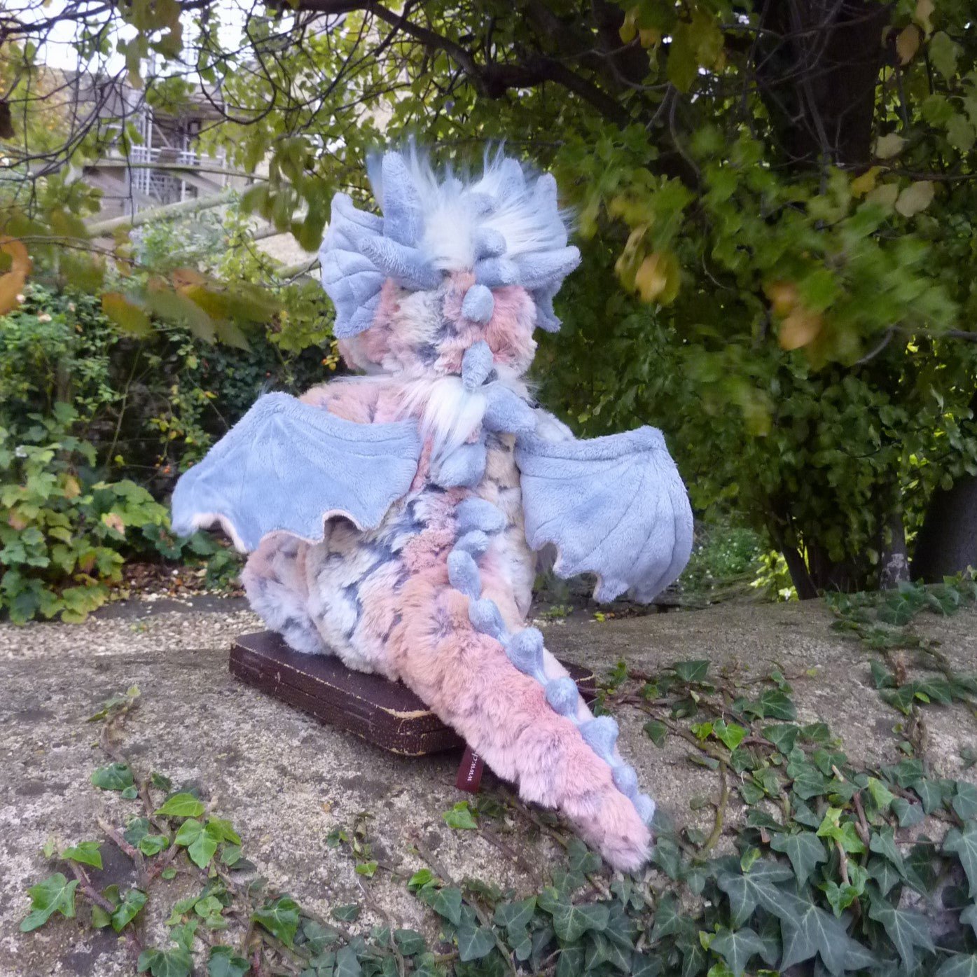 This delightful, large dragon is made of soft and highly unusual mottled pink and blue manmade plush with lidded, brown and black safety eyes. Fully jointed and finely detailed. Nova wears a blue sweet heart pendant. Quite a head turner!