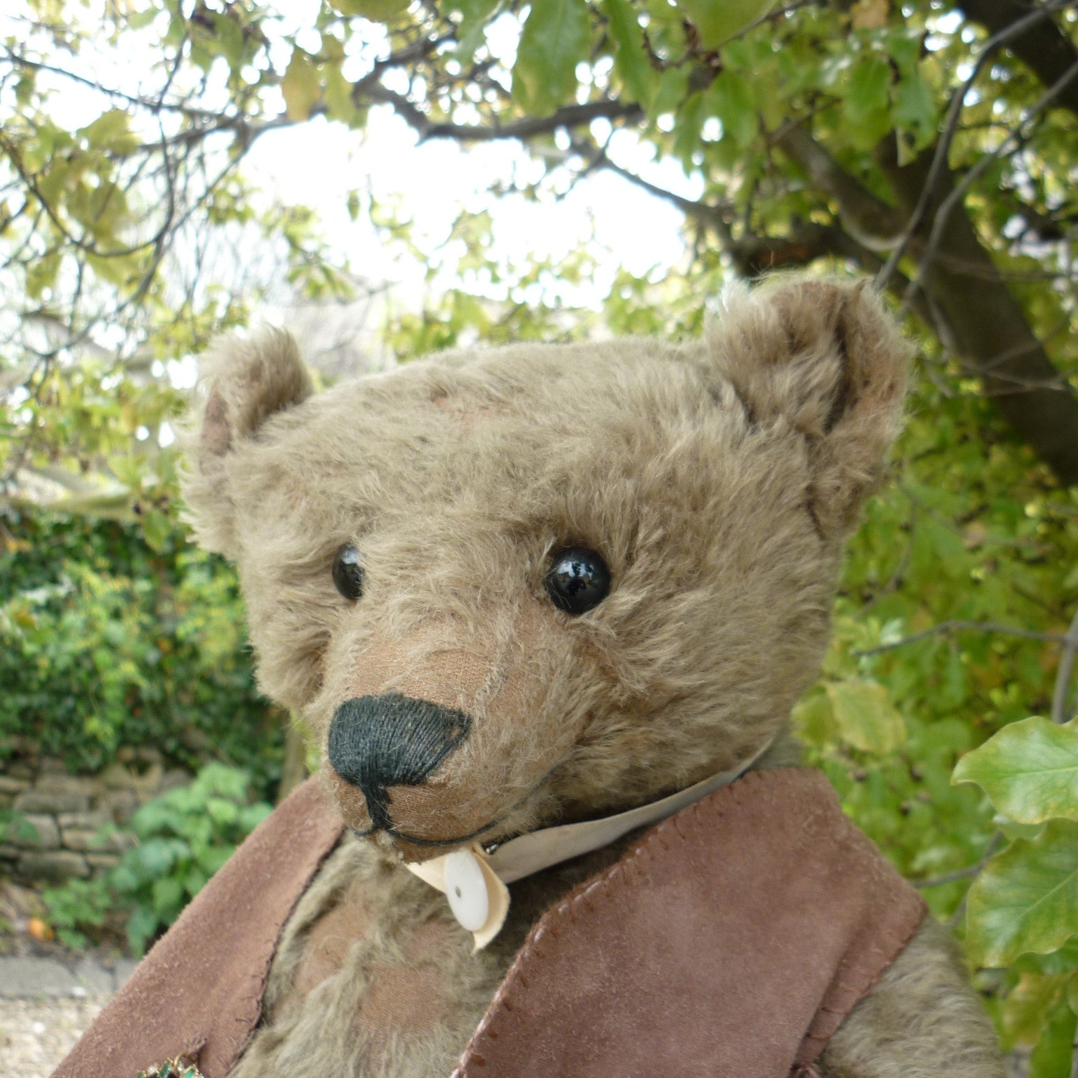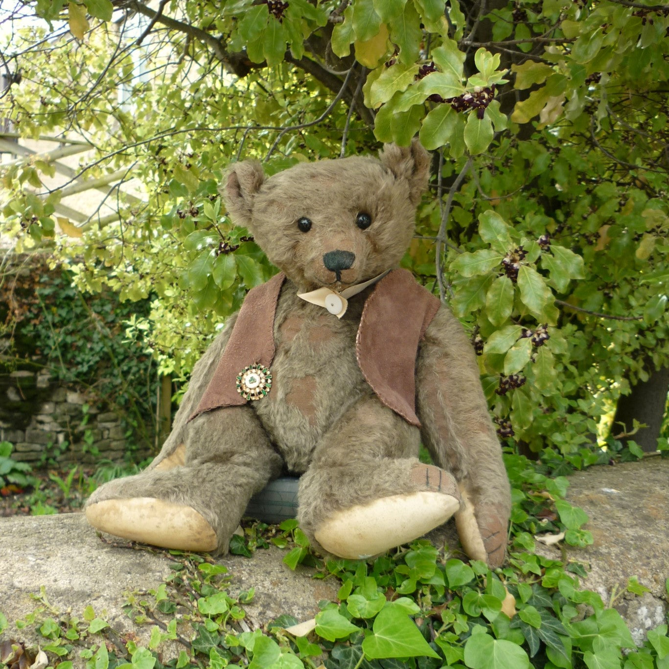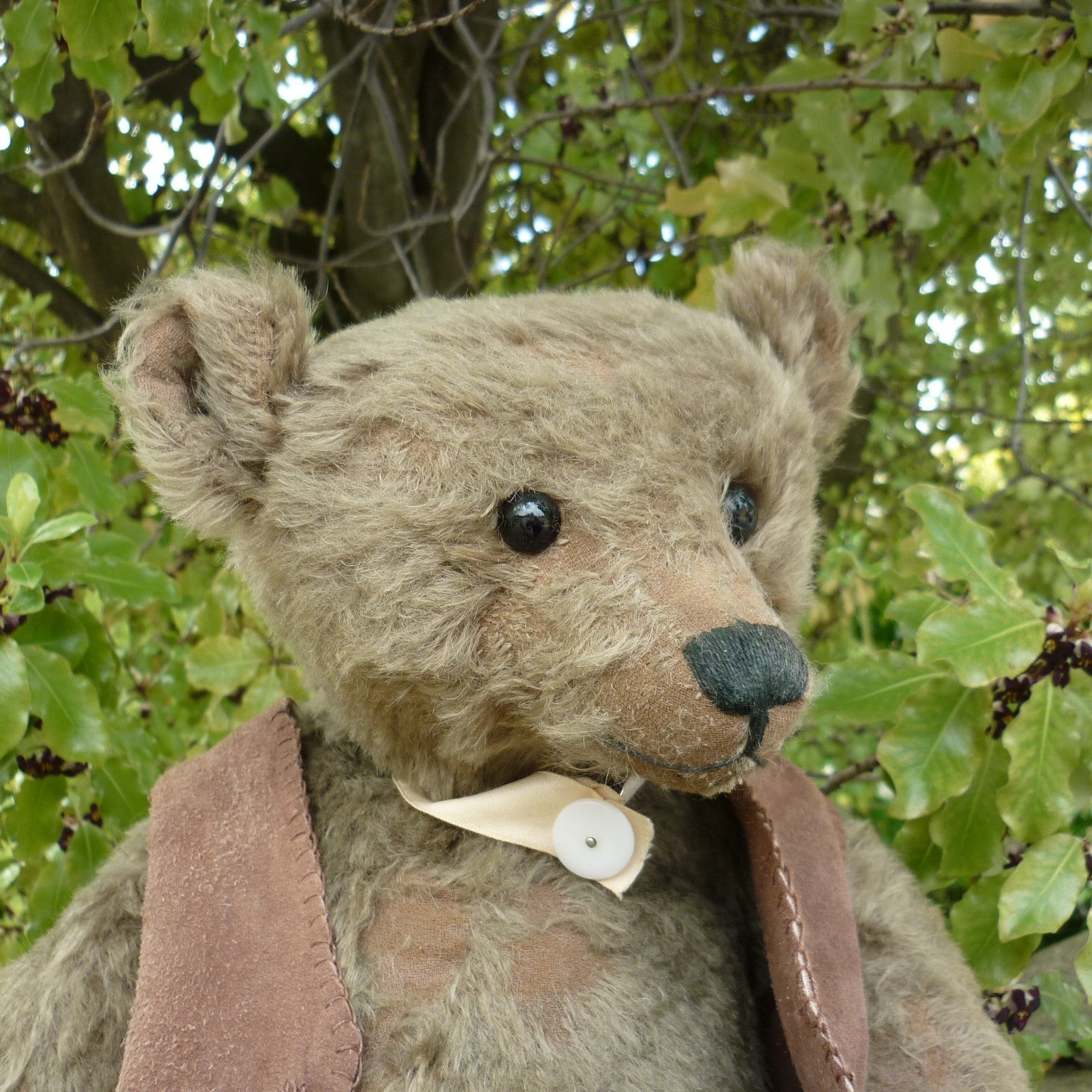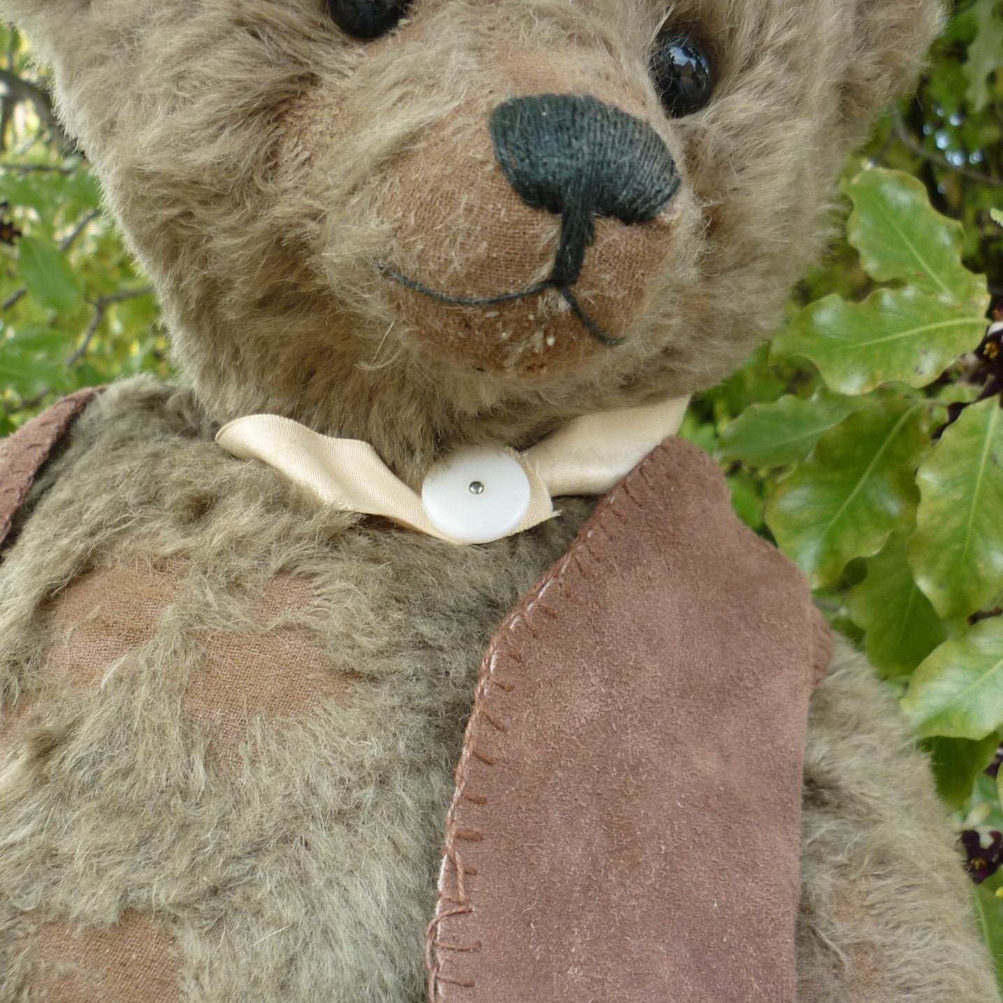 This large, vintage-looking, classic bear is made of unusual, distressed and hand-plucked, greenish brown mohair with black glass eyes, a grey and aged linen paw pads. Heavily filled with a mixture of wood shavings and mineral granules, he wears a satin ribbon collar and a faux suede waistcoat. His certificate is detached (see photo) but the bear is as new. (If bought by a collector outside the UK, there will be an GBP75 surcharge towards the high airmail cost.)