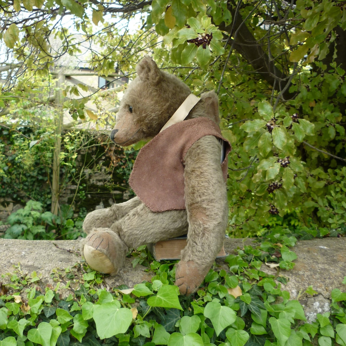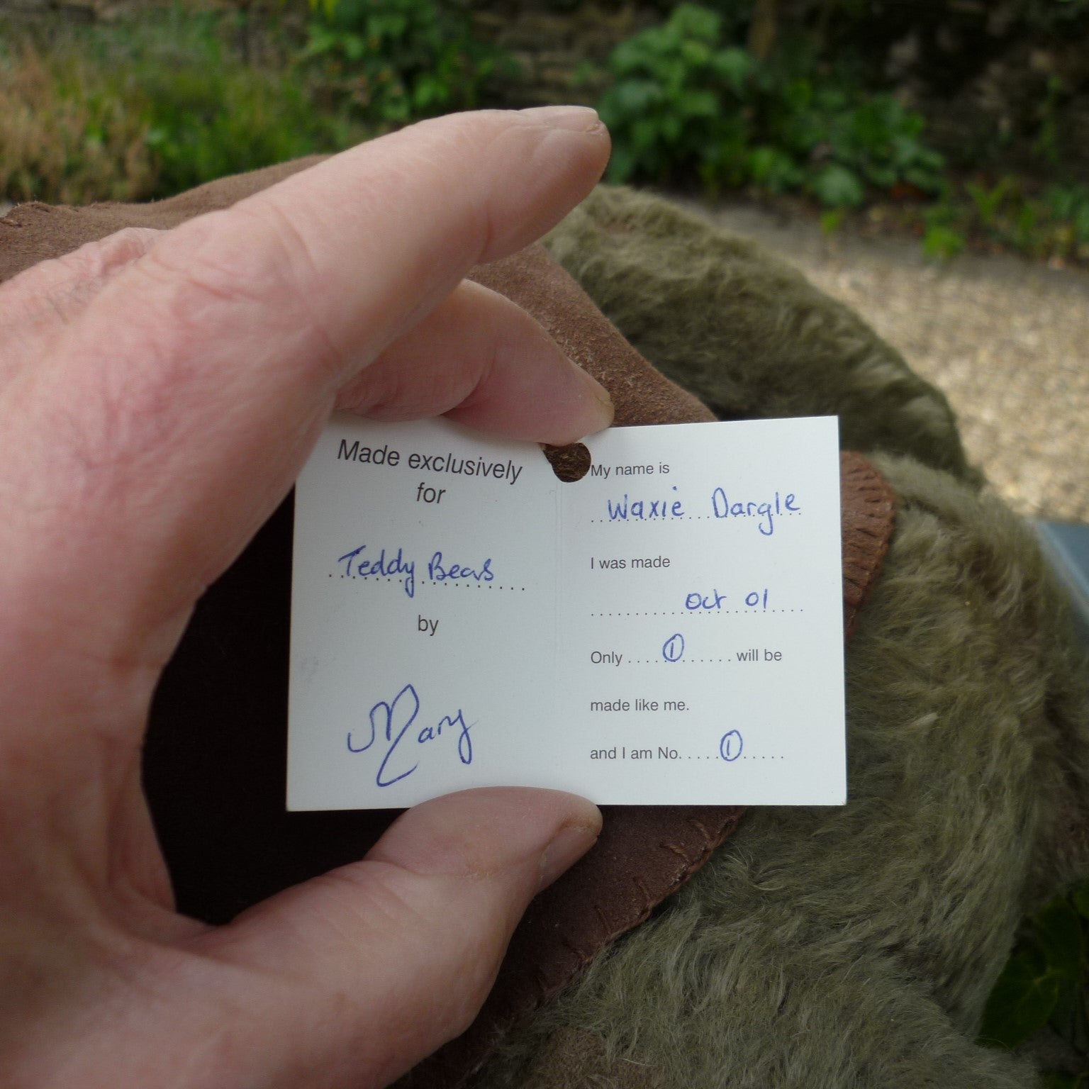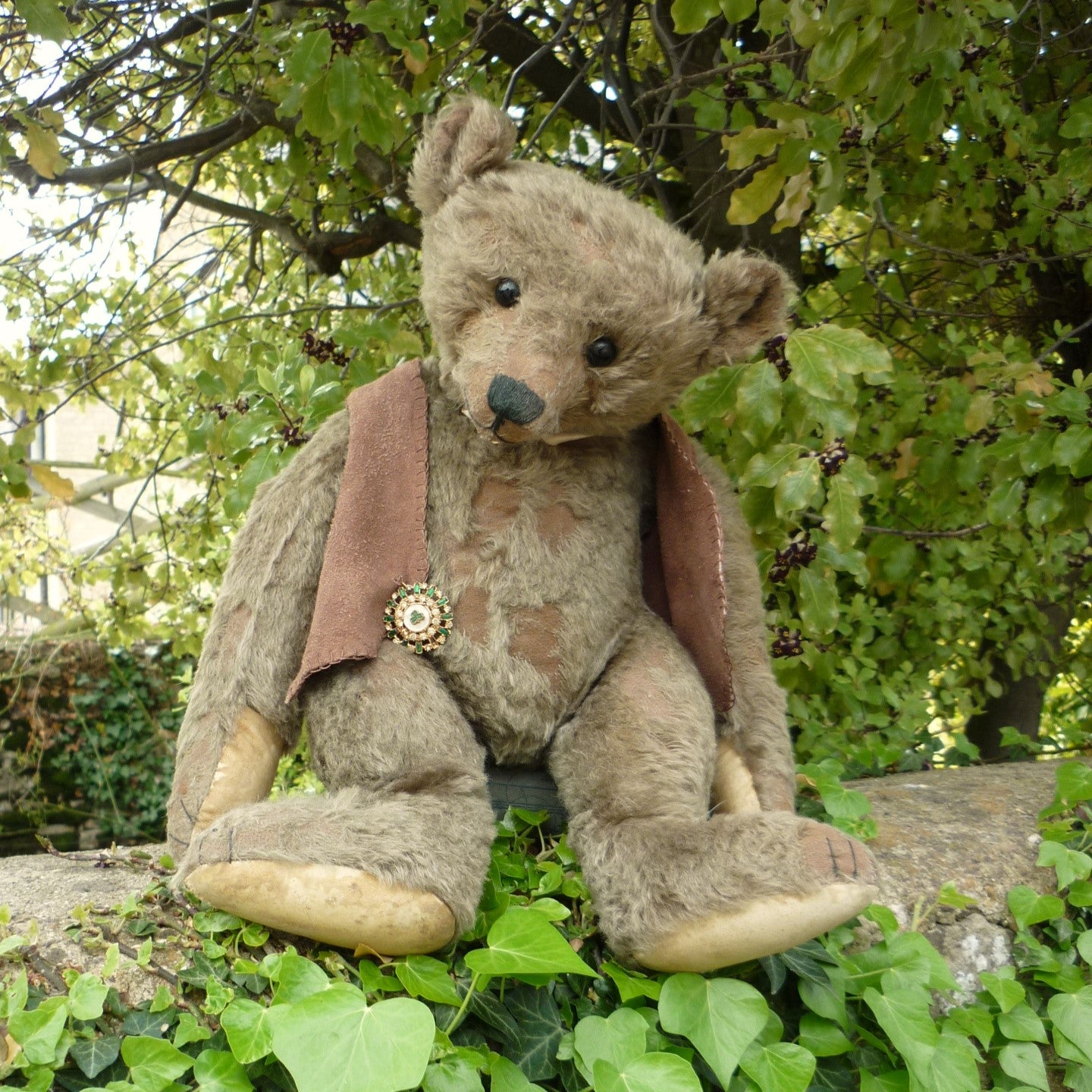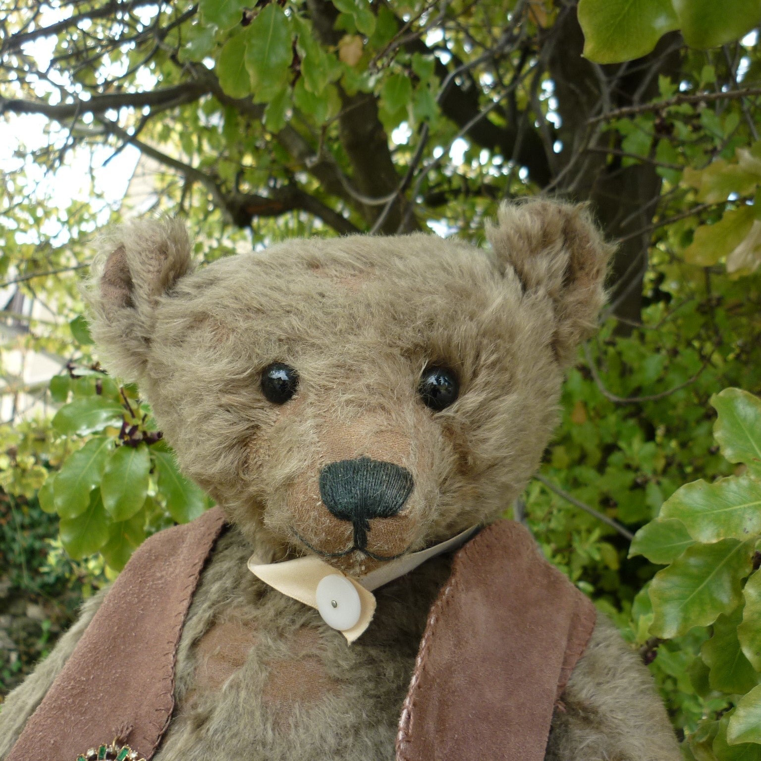 This large, vintage-looking, classic bear is made of unusual, distressed and hand-plucked, greenish brown mohair with black glass eyes, a grey and aged linen paw pads. Heavily filled with a mixture of wood shavings and mineral granules, he wears a satin ribbon collar and a faux suede waistcoat. His certificate is detached (see photo) but the bear is as new. (If bought by a collector outside the UK, there will be an GBP75 surcharge towards the high airmail cost.)