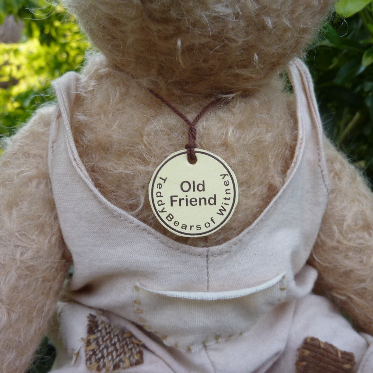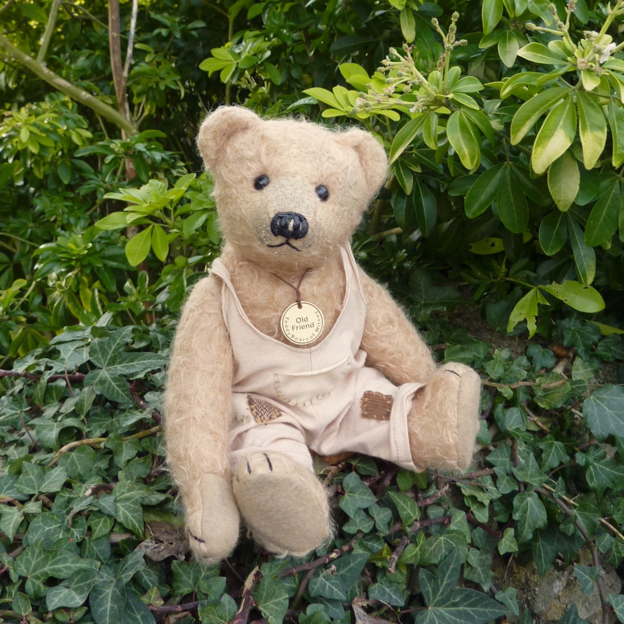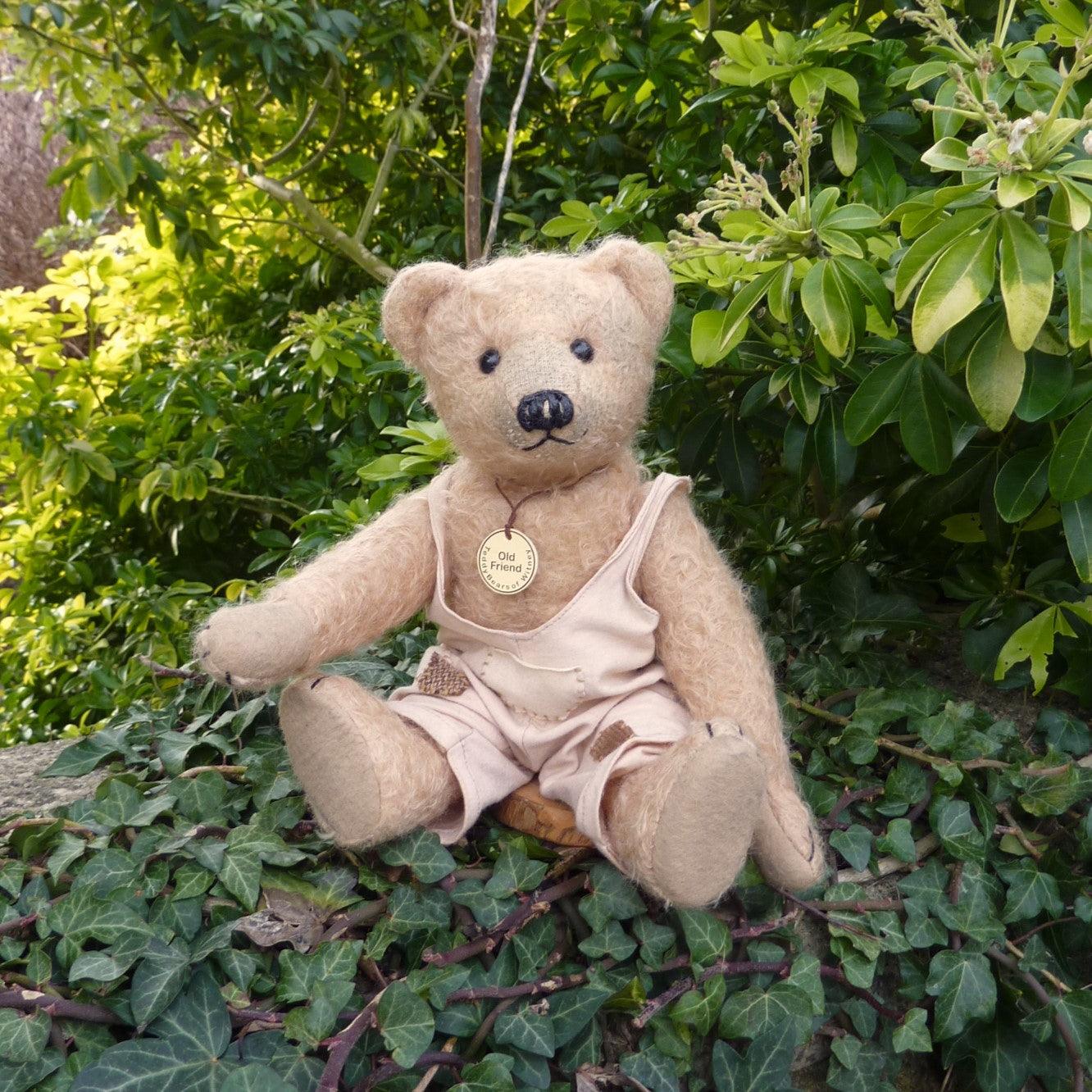 Softly filled and highly tactile, he is made of sparse, aged and distressed, pale blond mohair with black button eyes and felt paw pads. He wears baggy and aged, pale peach, jersey-knit dungarees. Old Friend comes with a certificate signed by Ian Pout. Only one available.