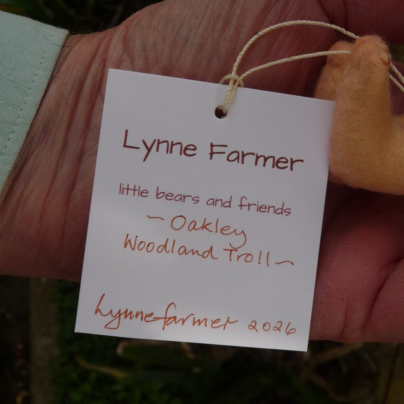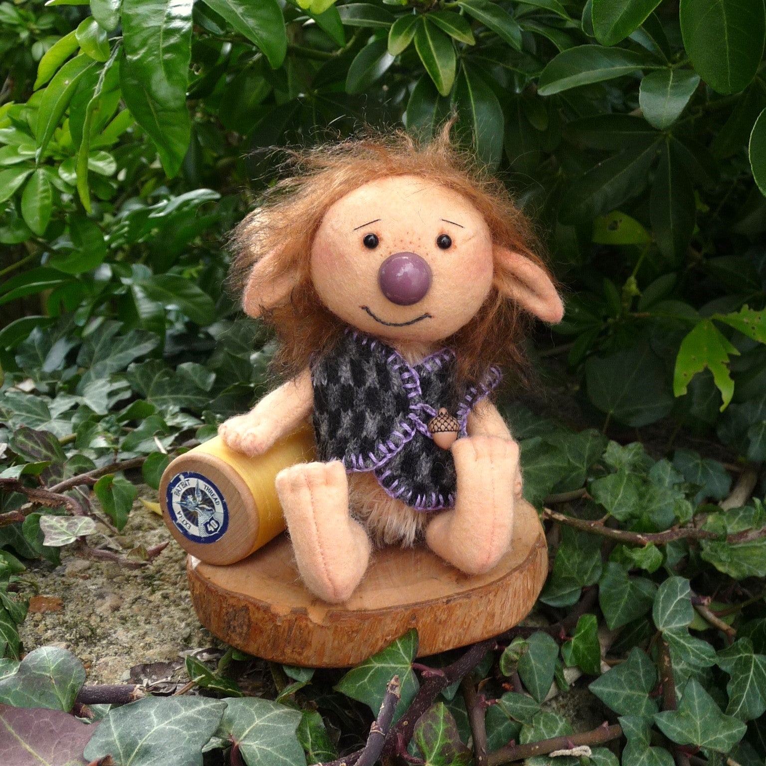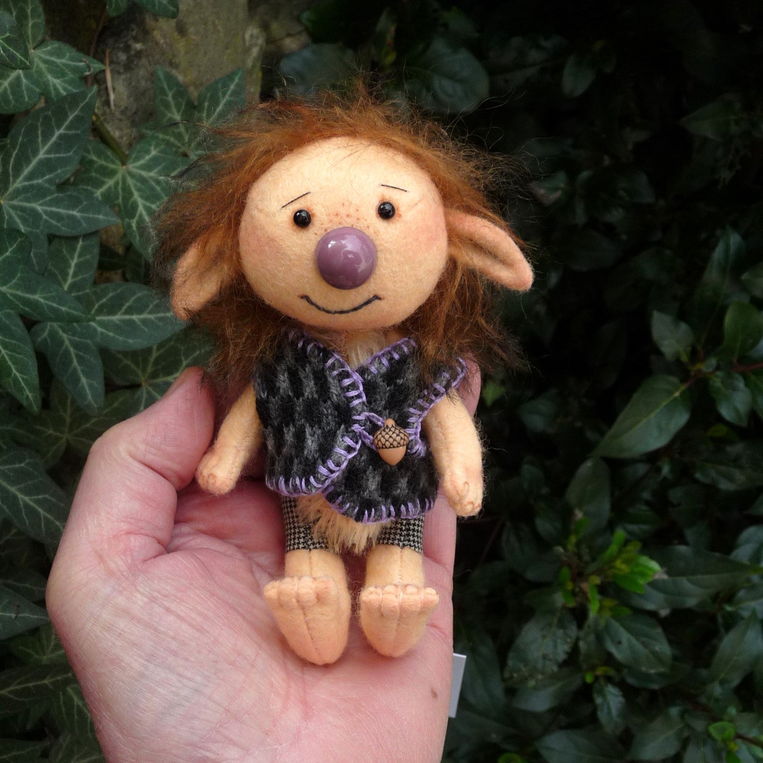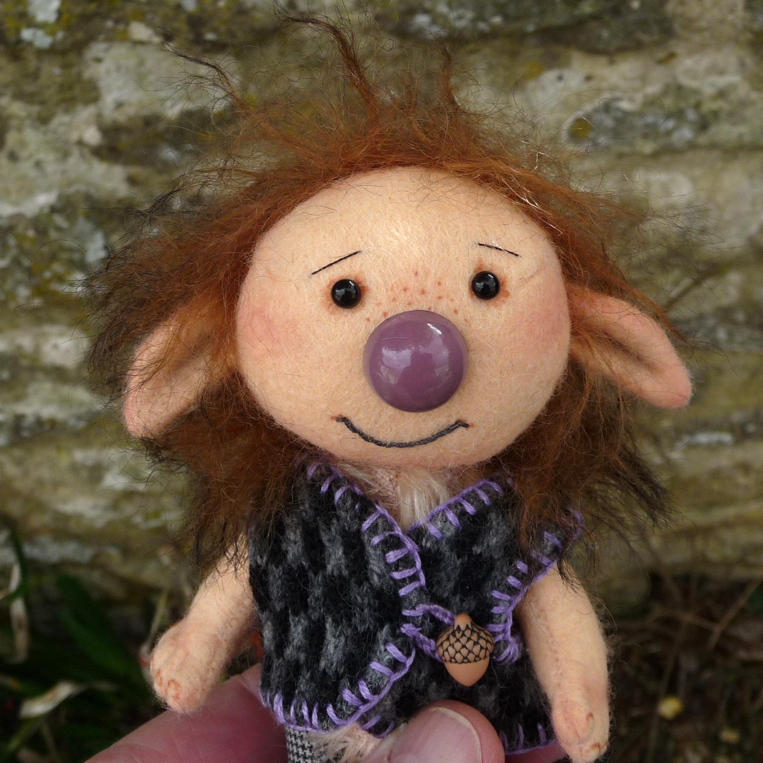 New for Lynne and, as always with her creations, fun, this delightful troll has a felt head, arms and legs, and a sparse blond mohair body. Oakley has long pile mohair hair, black glass eyes, a brown nose and realistic hands and feet. Filled with polyfibre, and weighted with steel beads, he wears a hand-knitted waistcoat, with an acorn button.