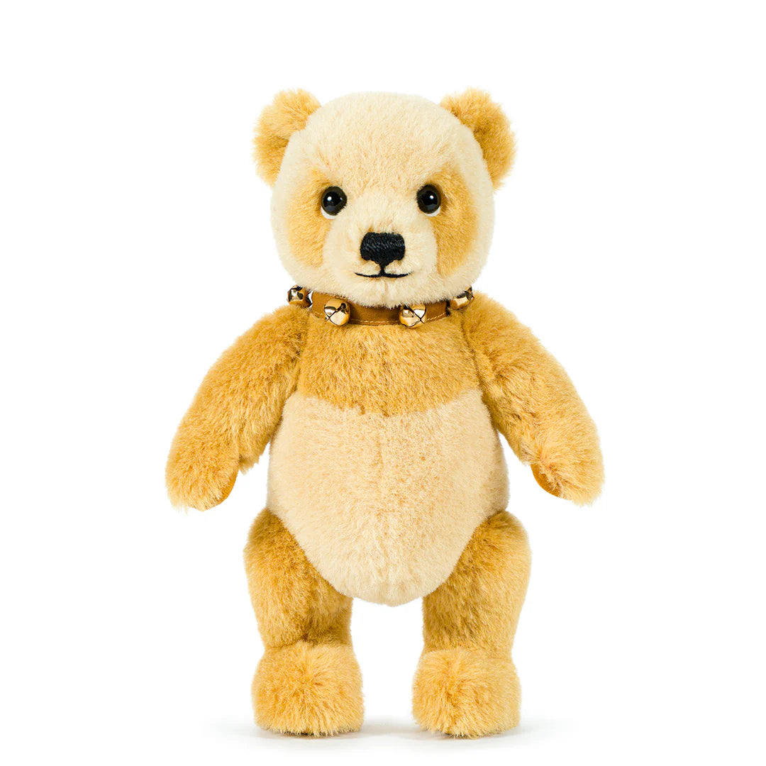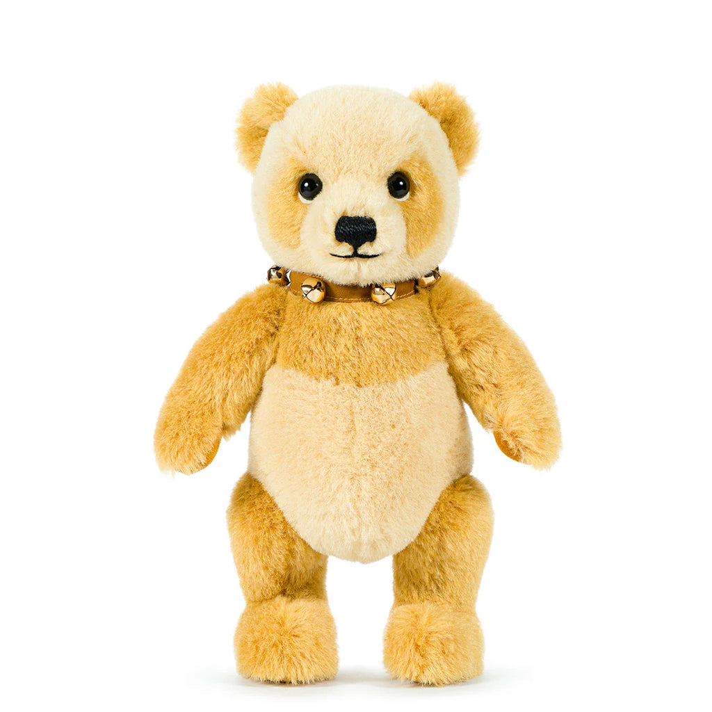 Pippin features gold cotton velvet paws and wool felt detailing around the eyes to give a particularly endearing expression. Accessorised with a chestnut-brown faux suede collar, adorned with vintage-style bells and secured with a stud closure.