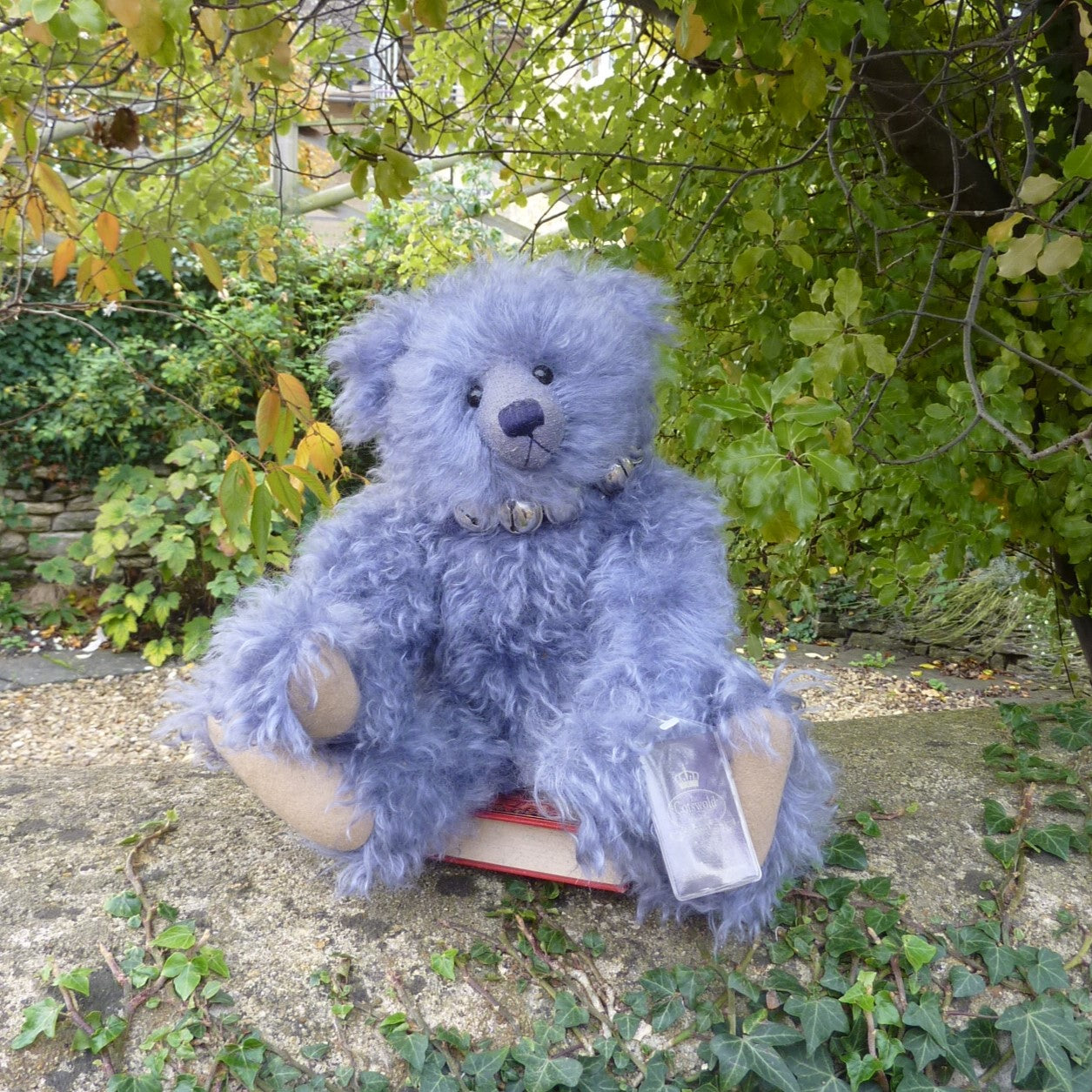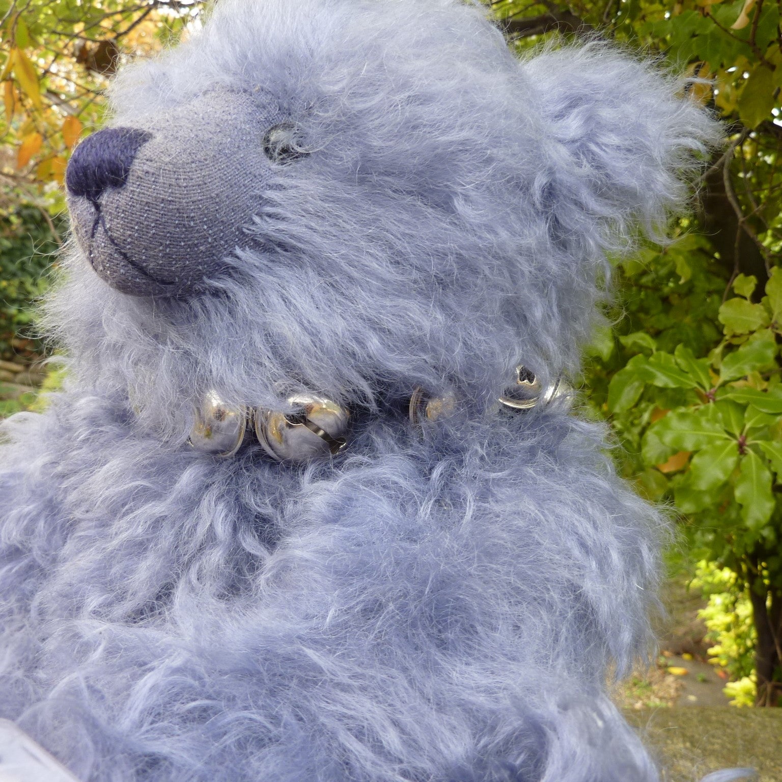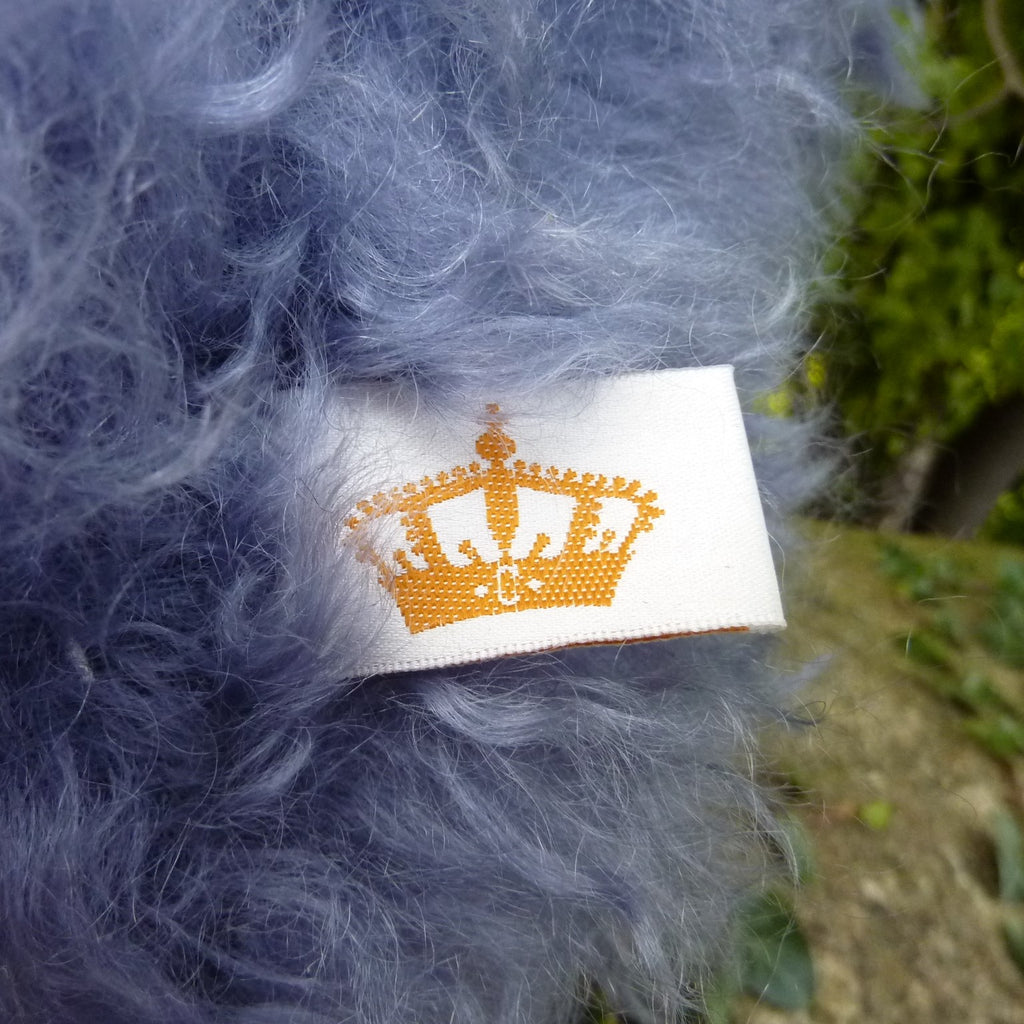 Heavily and firmly filled, this large and eye-catching bear is made of luxurious, extra-long and wavy, blue mohair with shiny black glass eyes, a shaved muzzle, a blue-stitched nose and felt paw pads. He wears a bell collar. Number 11 of the edition, he is in excellent condition with certificate. (If sent to an overseas customer, there with be a £65 surcharge towards the airmail cost.)
