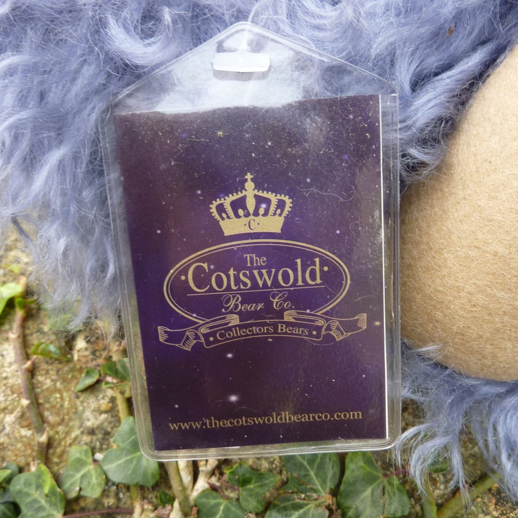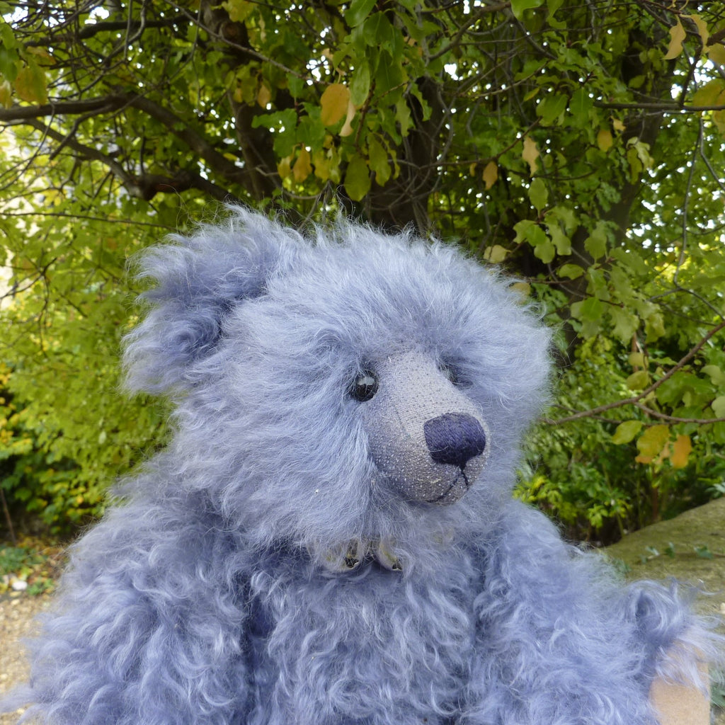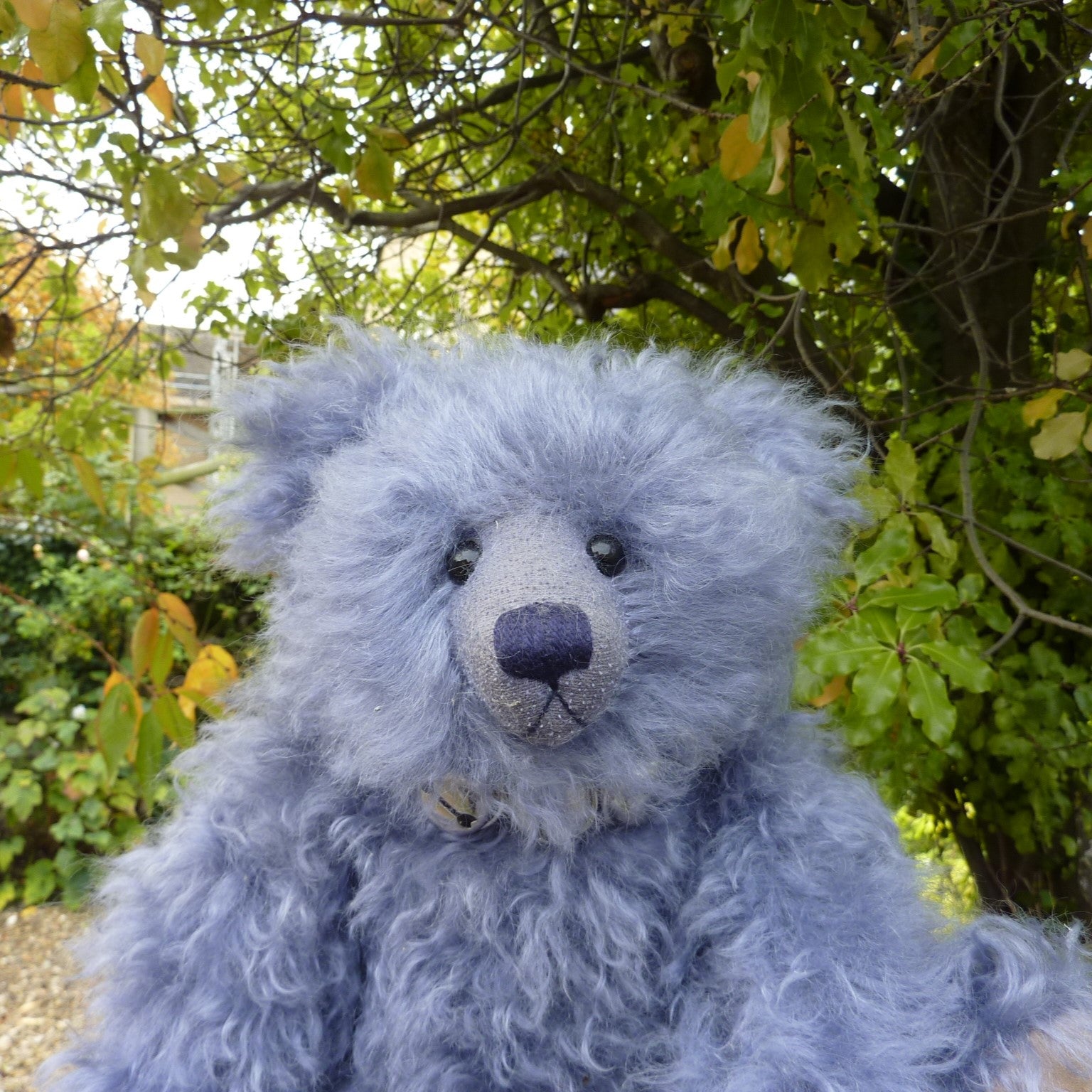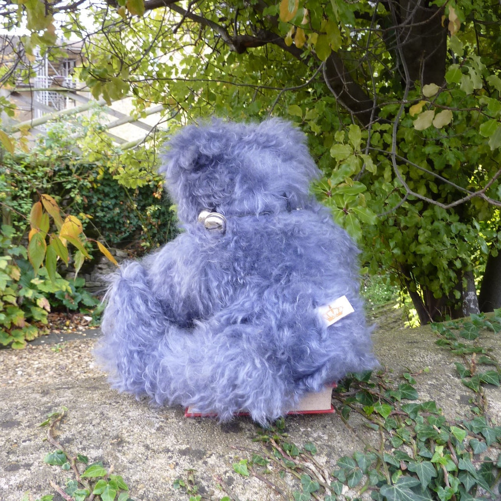 Heavily and firmly filled, this large and eye-catching bear is made of luxurious, extra-long and wavy, blue mohair with shiny black glass eyes, a shaved muzzle, a blue-stitched nose and felt paw pads. He wears a bell collar. Number 11 of the edition, he is in excellent condition with certificate. (If sent to an overseas customer, there with be a £65 surcharge towards the airmail cost.)