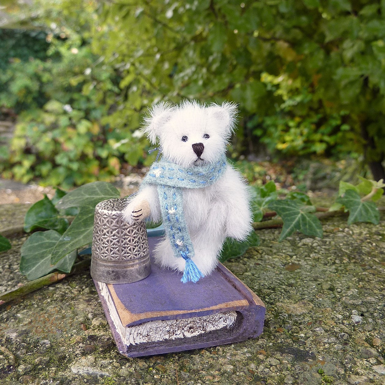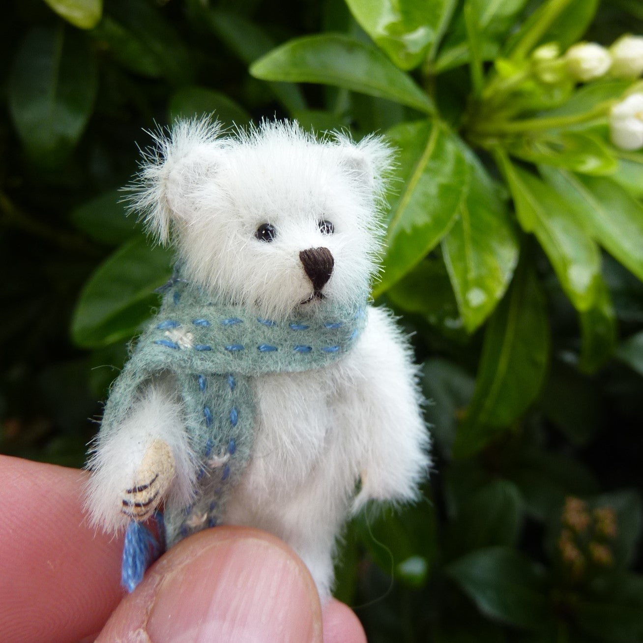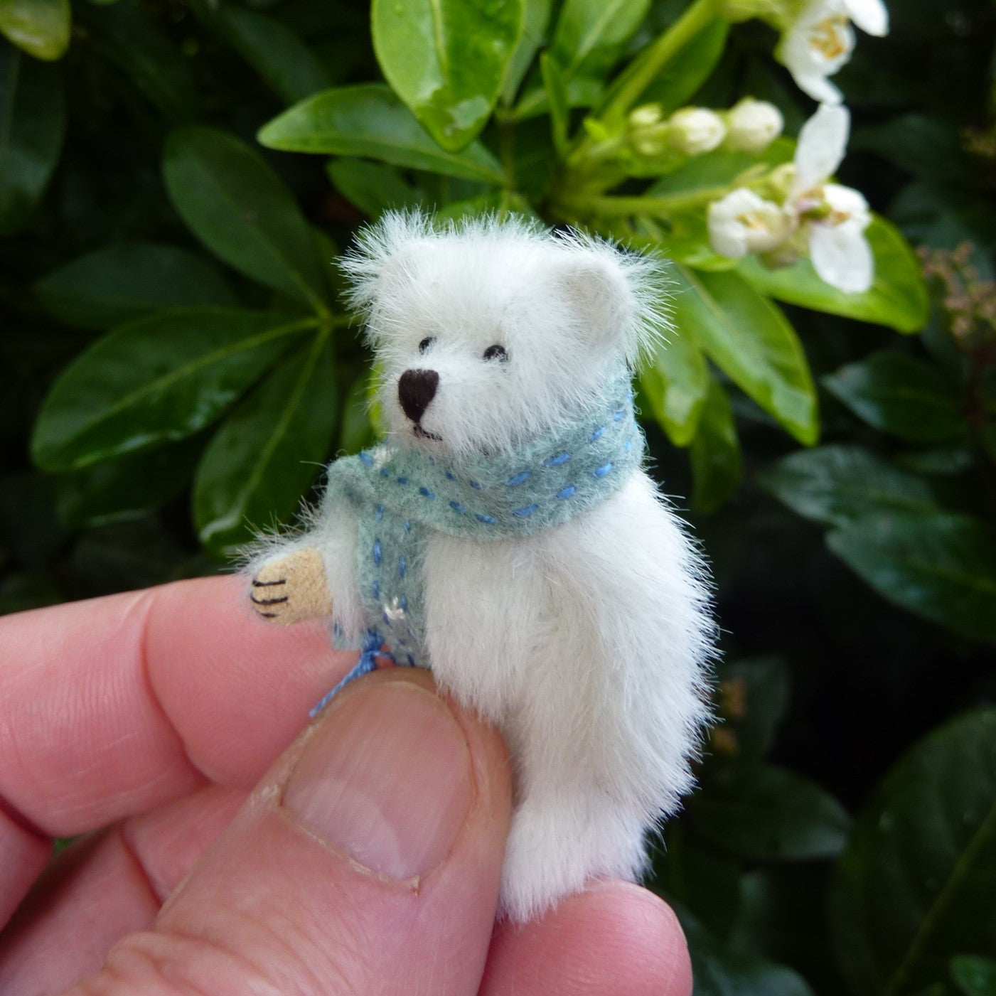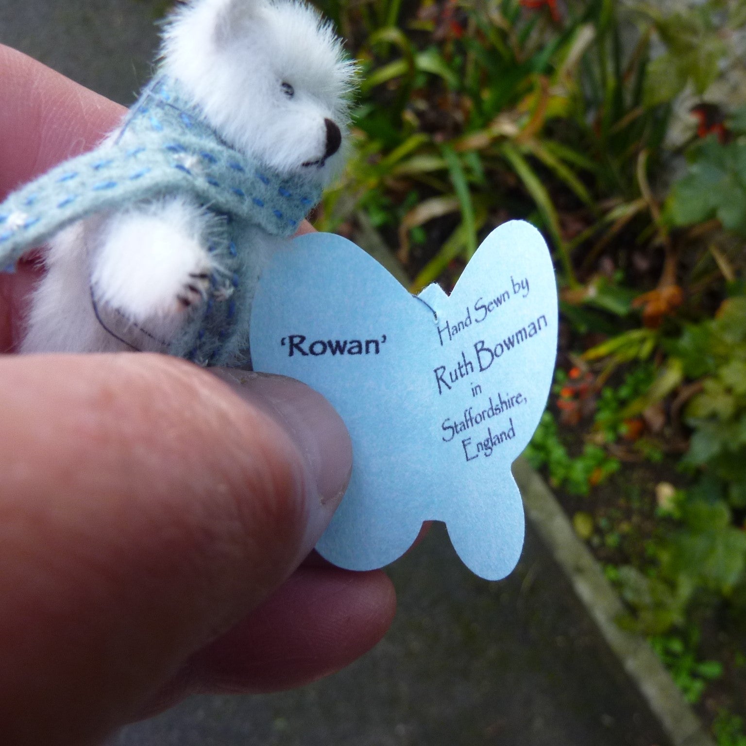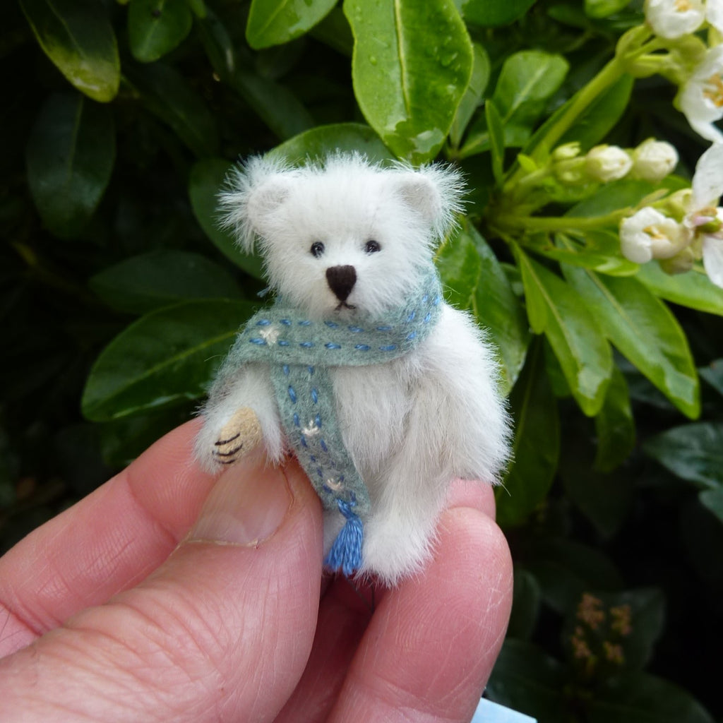 This finely sculpted, (very) miniature bear is made of long pile, white, manmade plush with onyx bead eyes and Ultrasuede paw pads. Rowan wears an antique lace collar, trimmed with a silk ribbon bow.