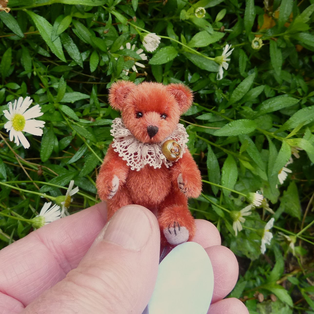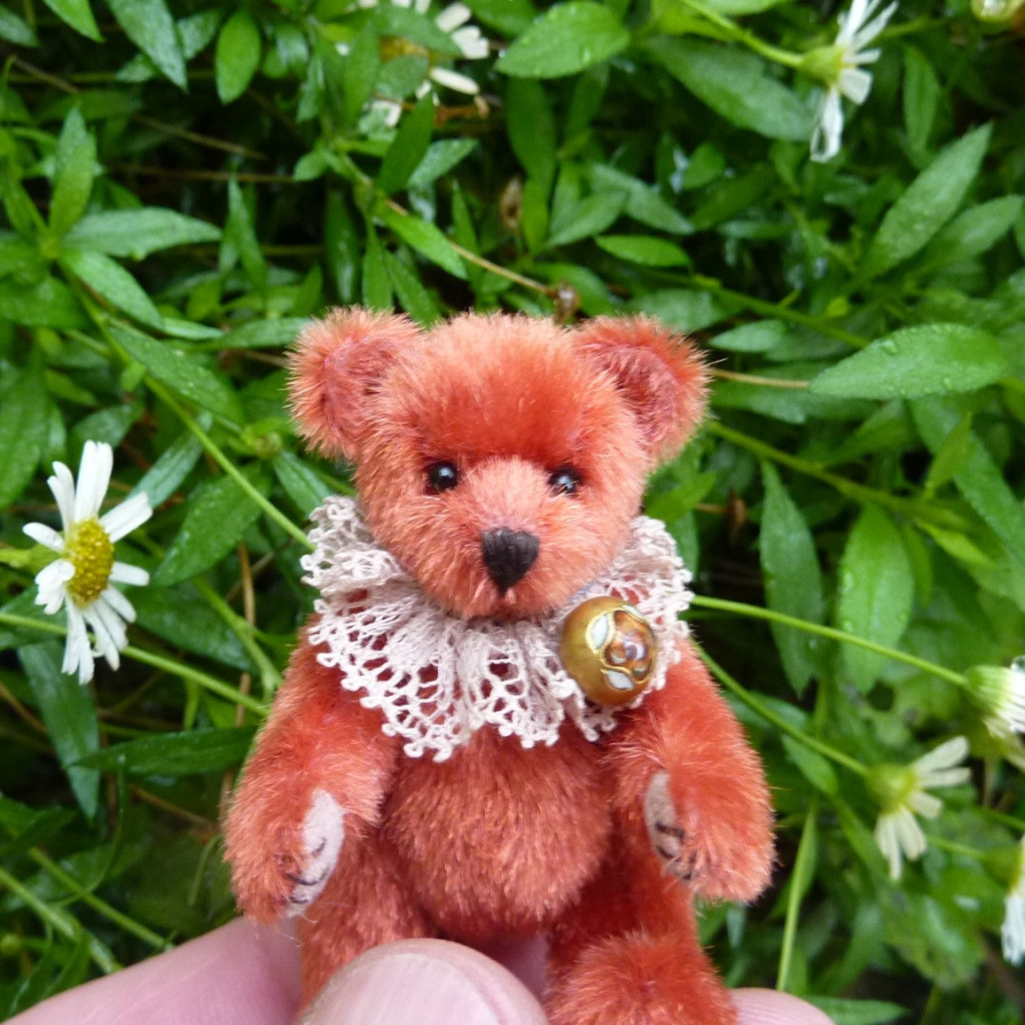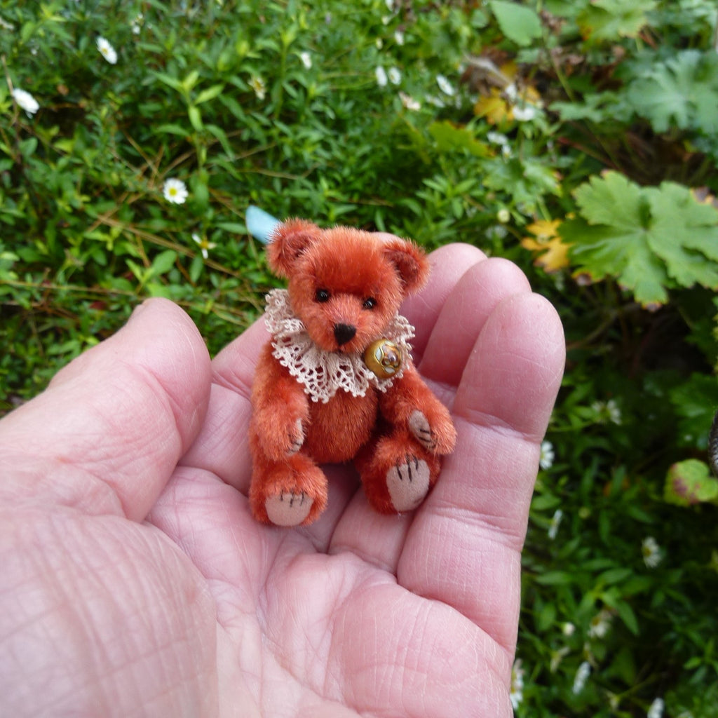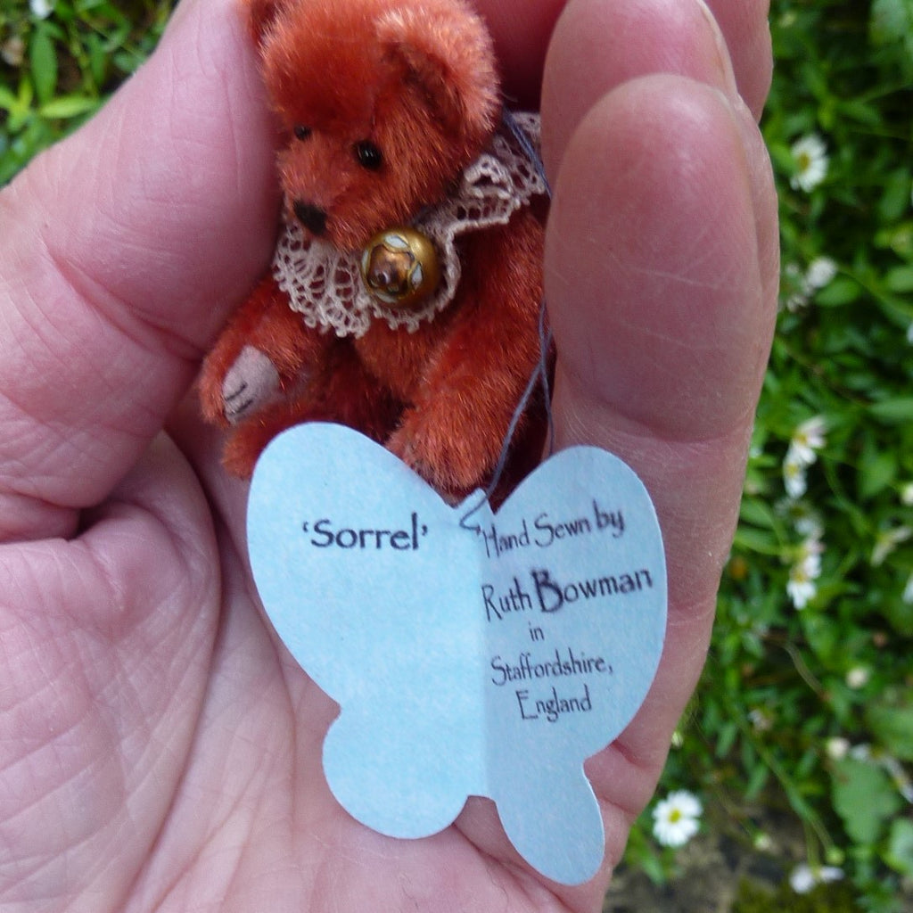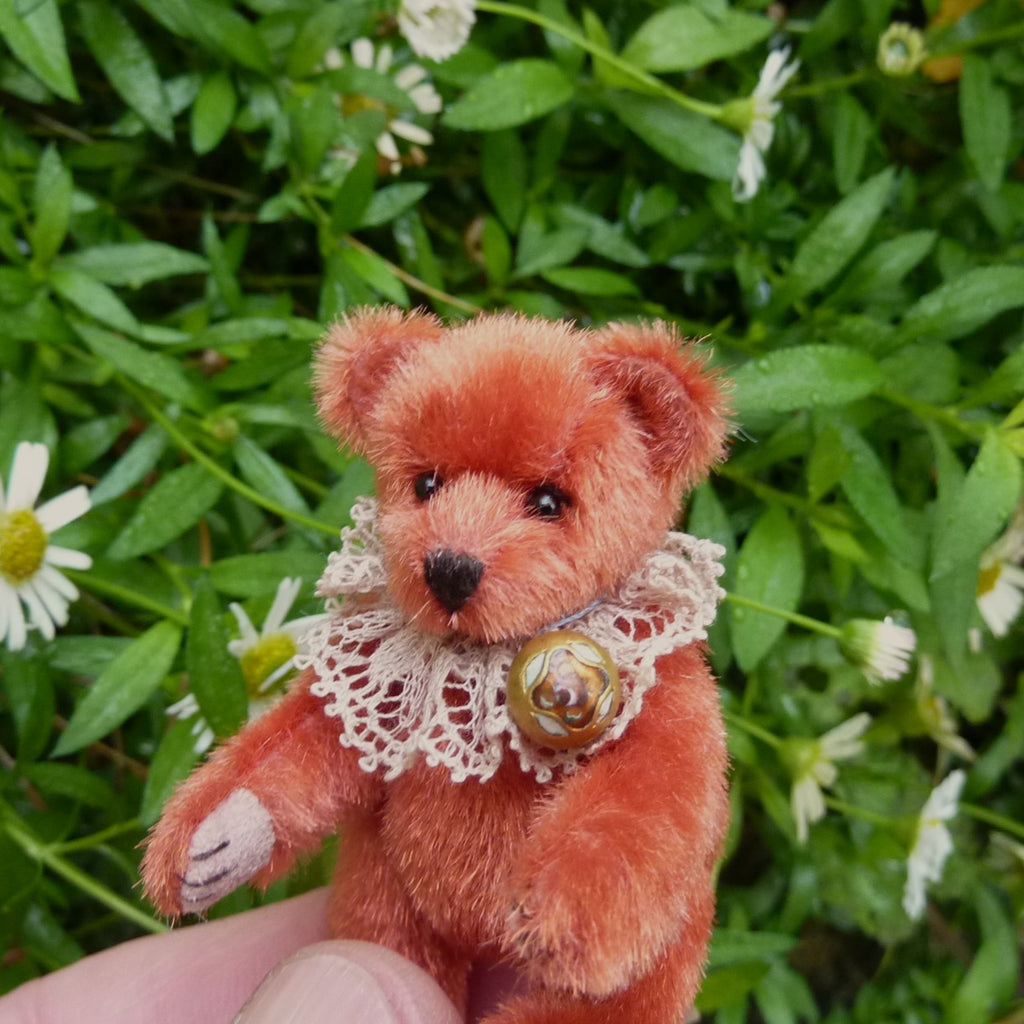 This finely detailed and very little bear is made of vintage, russet, long pile velvet with onyx bead eyes and Ultrasuede paw pads. Sorrel wears a vintage lace collar with a vintage enamelled button attached.