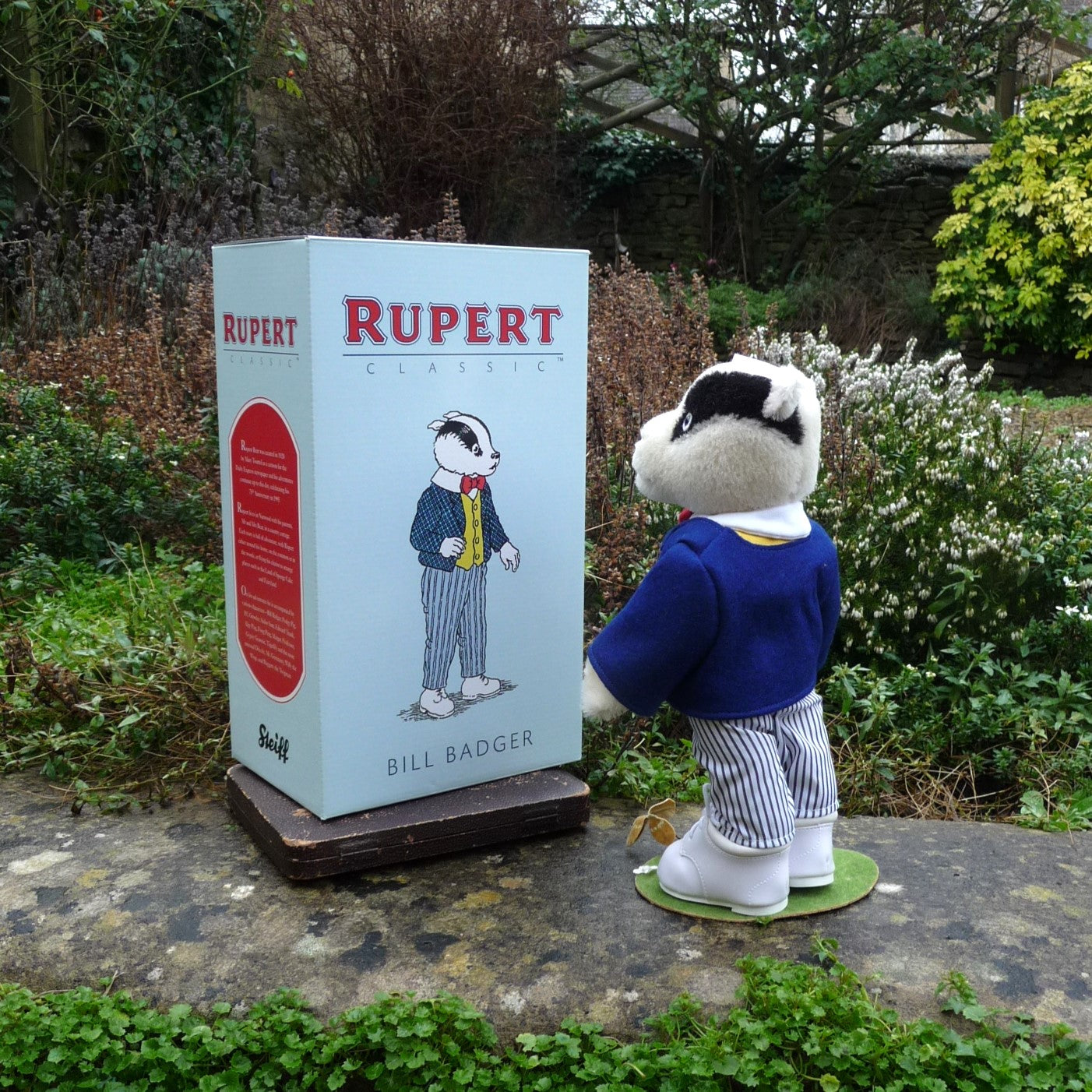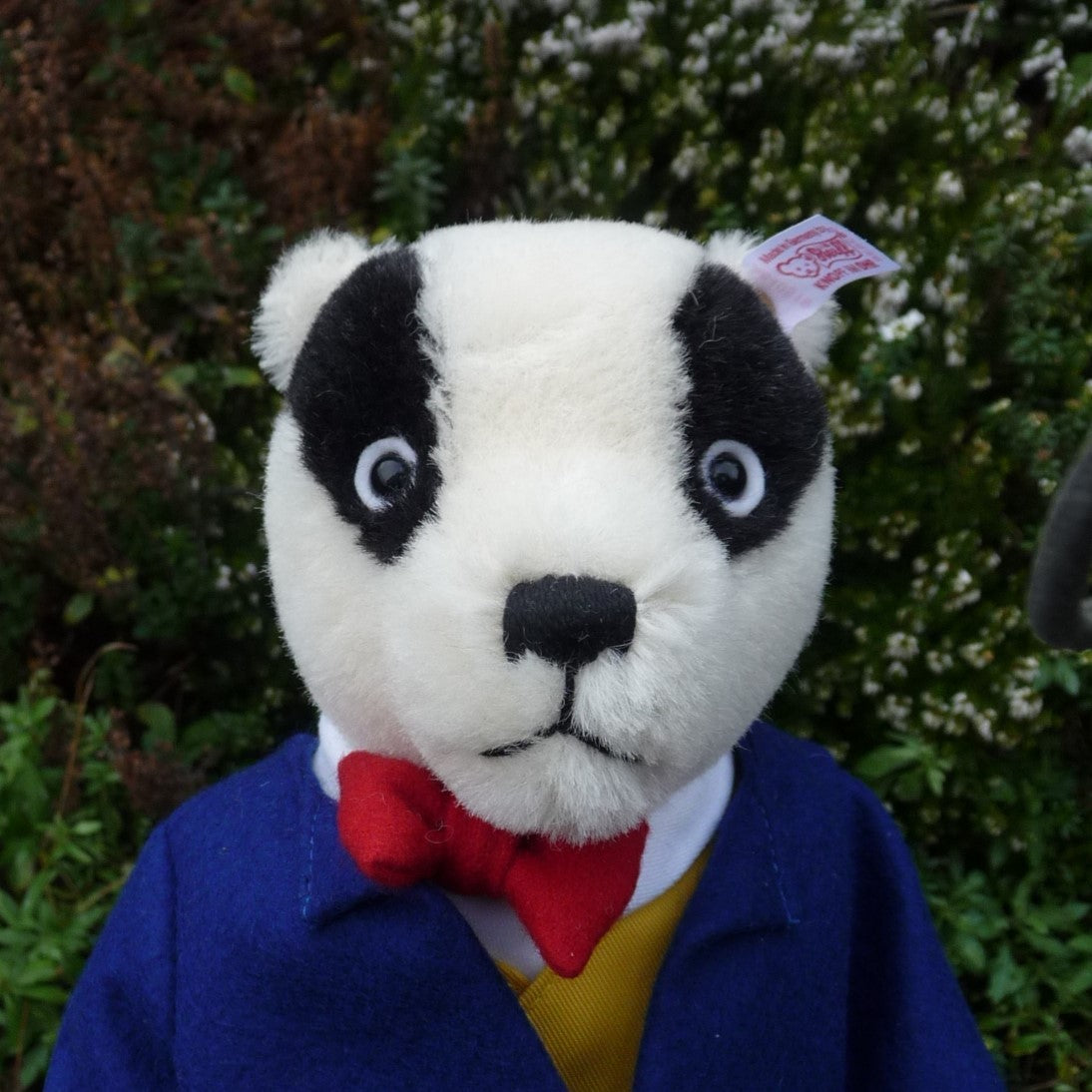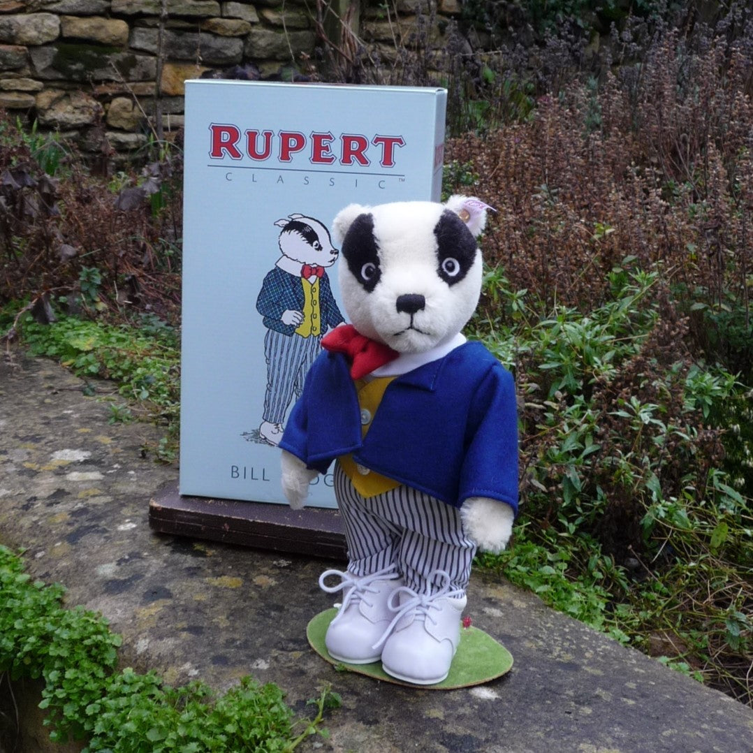 Fully jointed, Rupert’s pal is made of soft and dense, white and black alpaca with white felt patches behind his black safety eyes. He wears a white collar and felt bow tie, a (removable) cotton waistcoat, a felt jacket, striped trousers and white boots. Originally exclusive to the UK and Ireland, he (number 96 0f the edition) is as new with box and certificate.