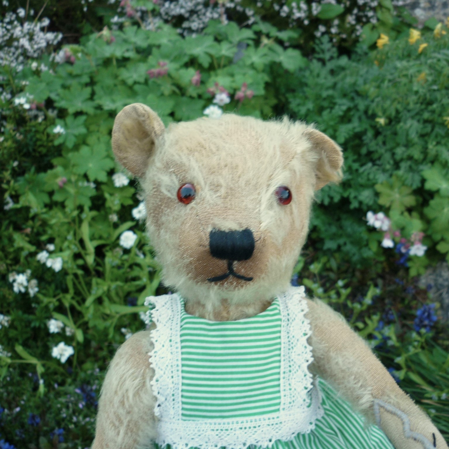 This iconic Chiltern bear is made of lightly distressed, blond mohair with amber and black glass eyes. There is general all-over wear but the bear has been well restored with all paw pads re-covered with faux suede. The dress was made for her by her previous owner.