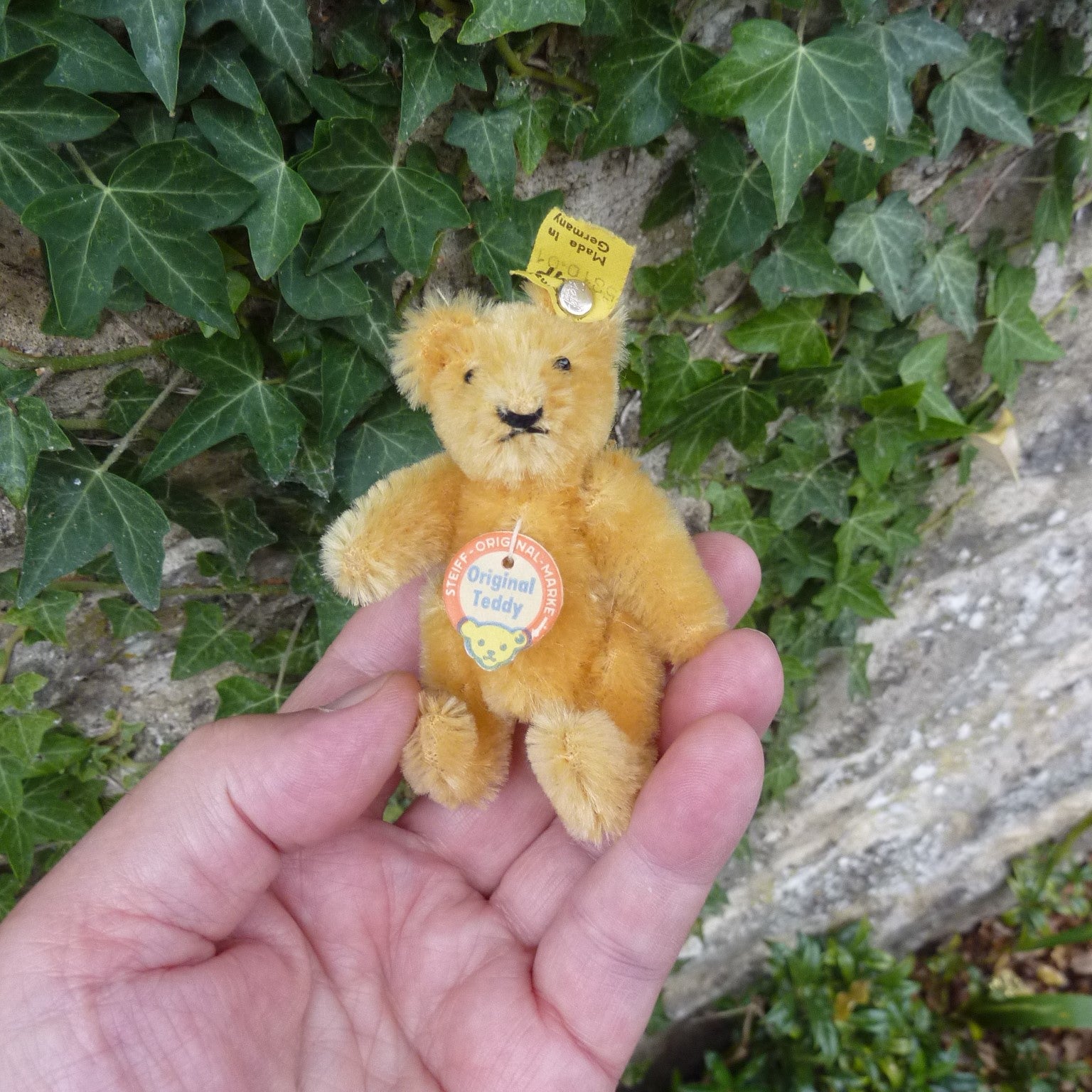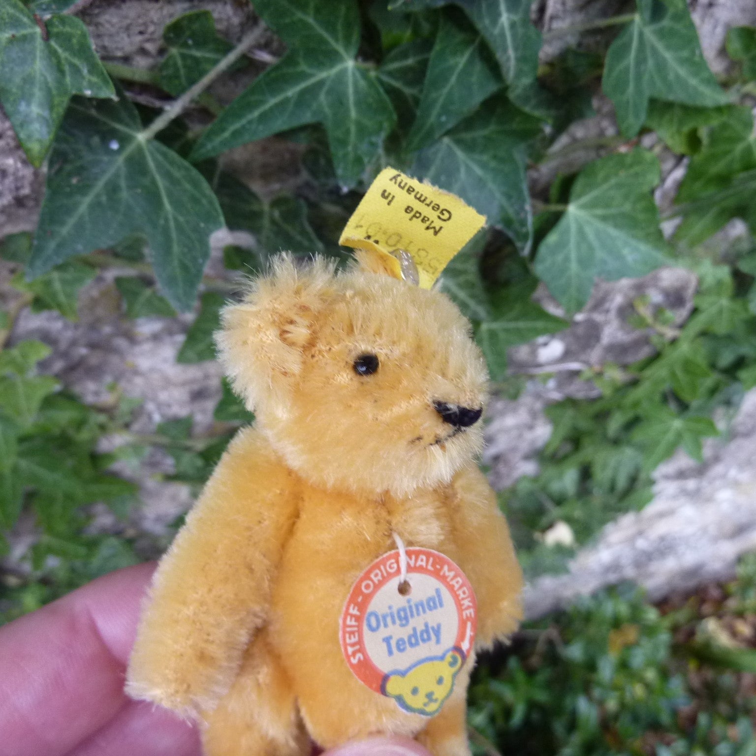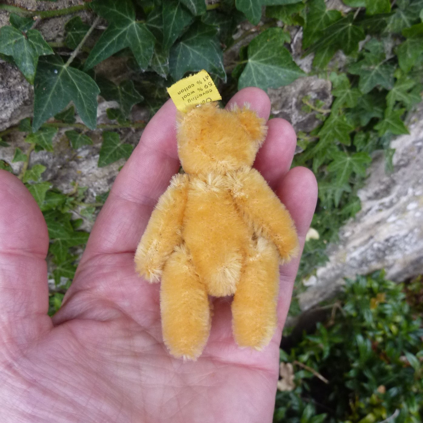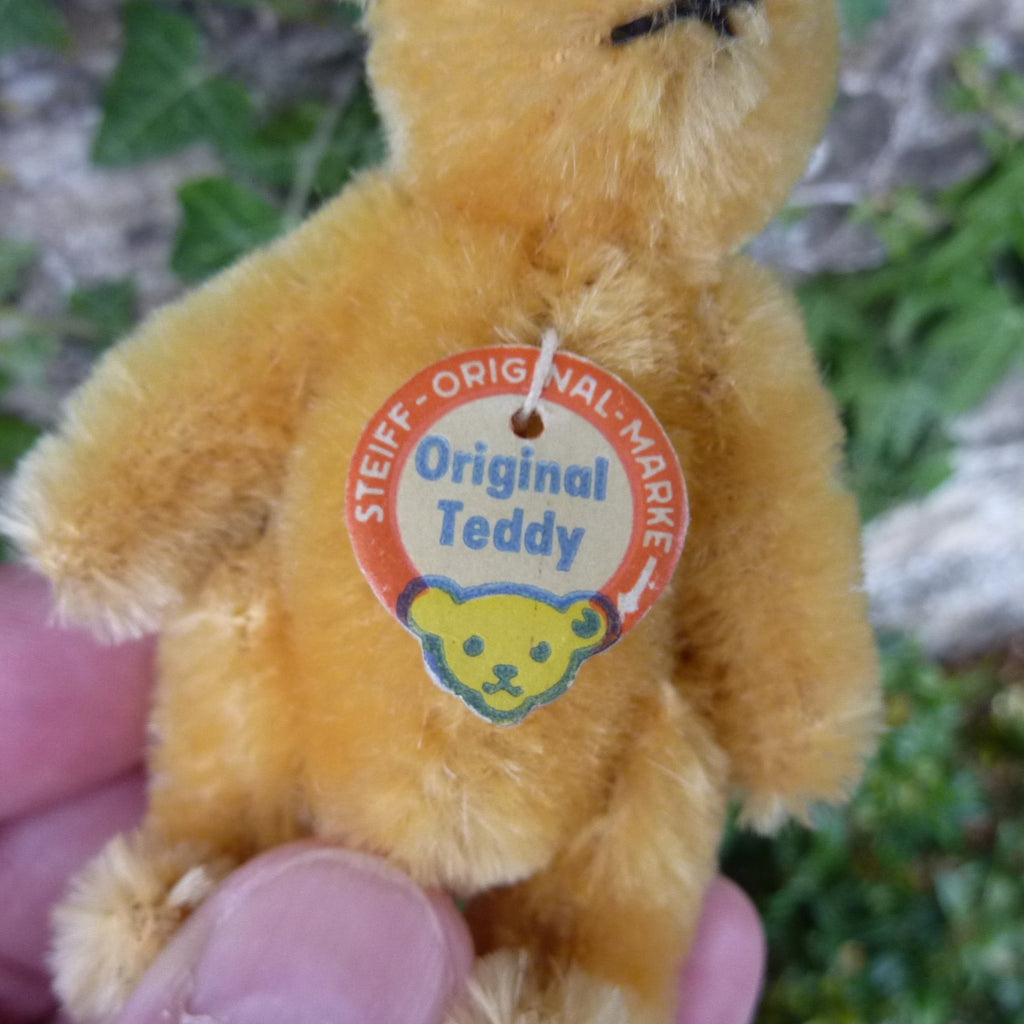 This little Original Teddy is made of dense, bright gold-blond mohair with black glass eyes. Fully jointed and traditionally filled with wood shavings, he is outstandingly good condition with button, numbered ear tag and chest tag.