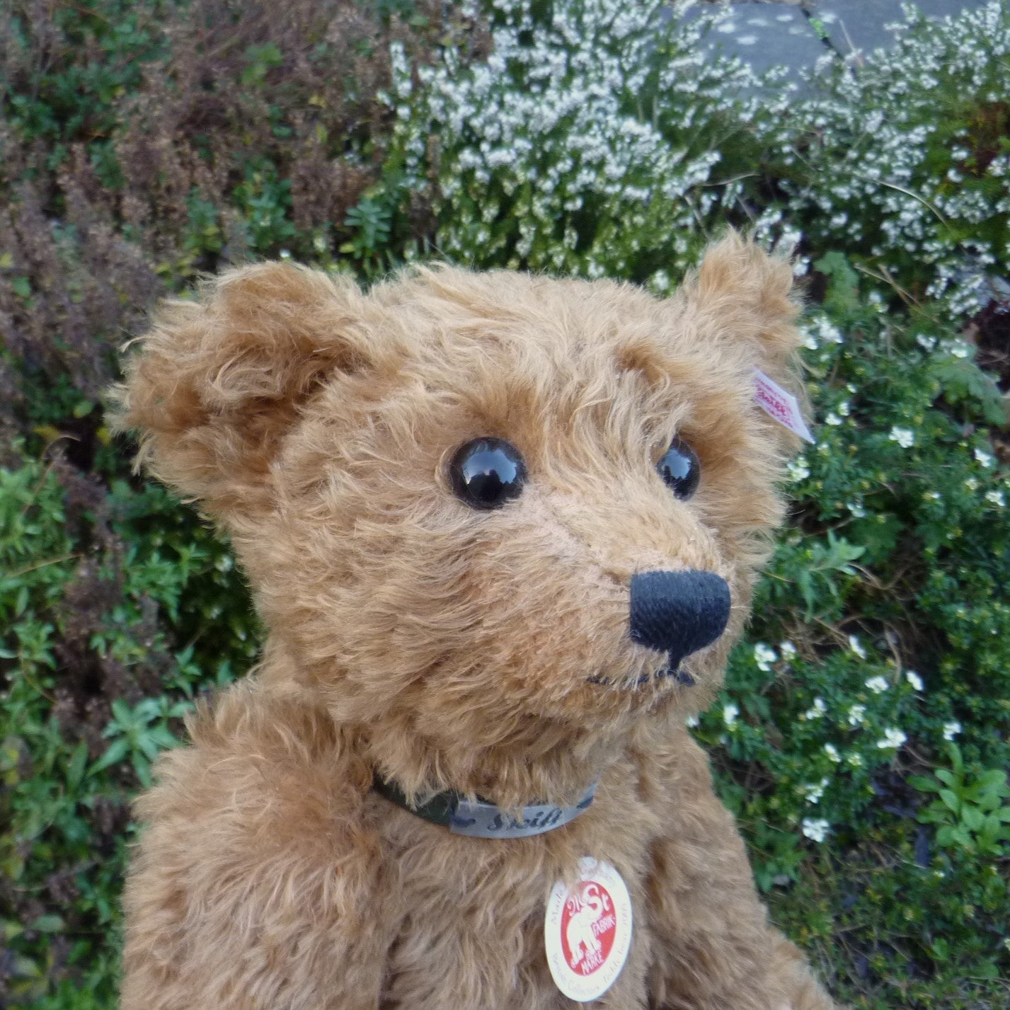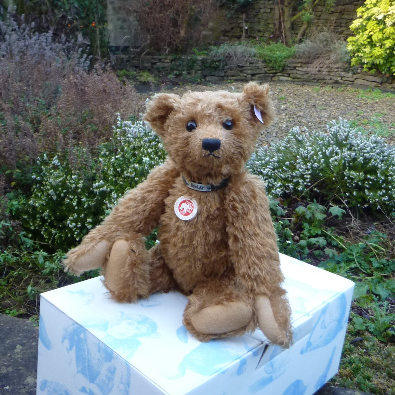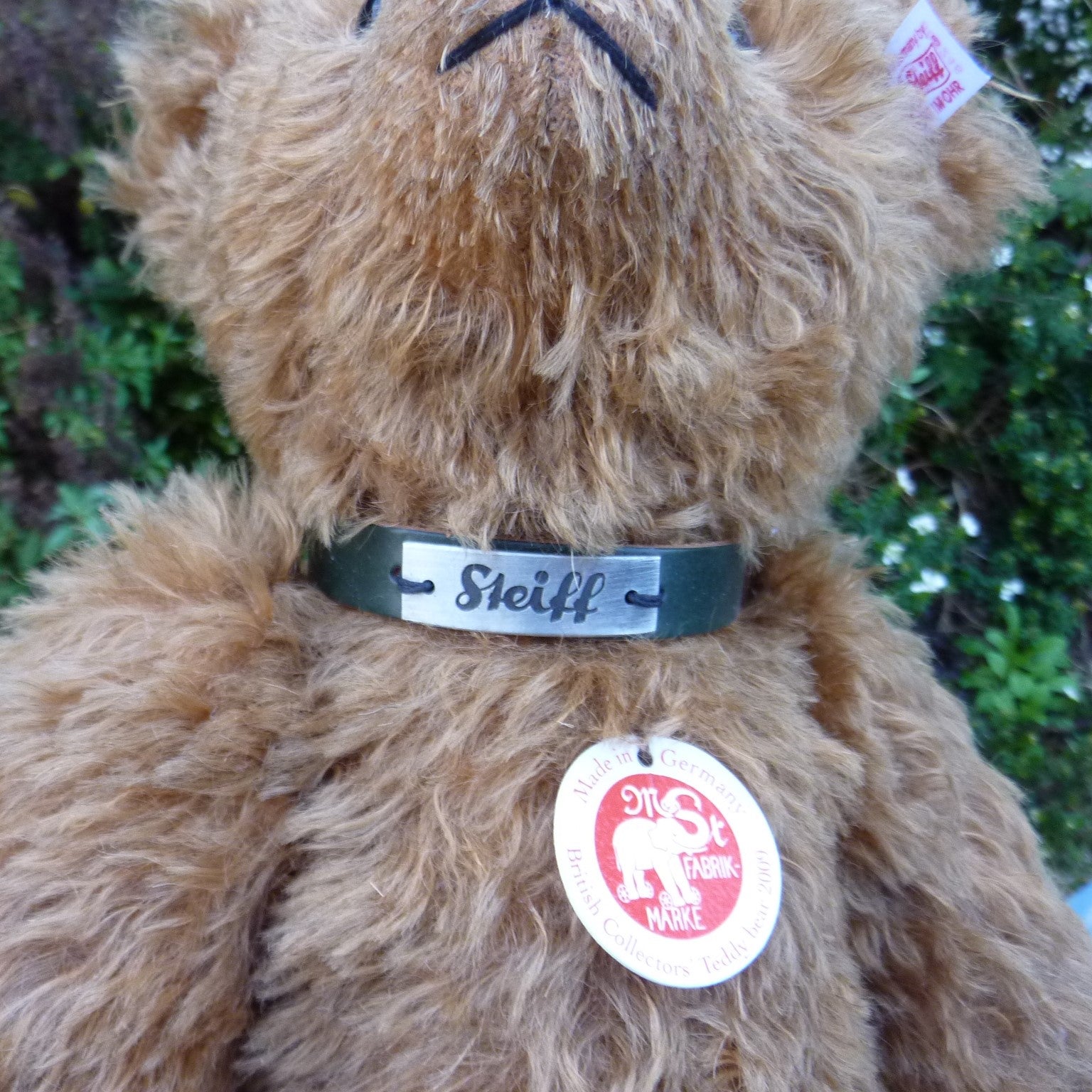 This handsome, traditional Steiff bear is made of swirly and distressed, reddish brown mohair with large black button eyes and felt paw pads. He wears a green leather collar with a Steiff plate (see photo) and growls when tipped backwards. Number 1742 of the edition, he is as new with box and certificate.