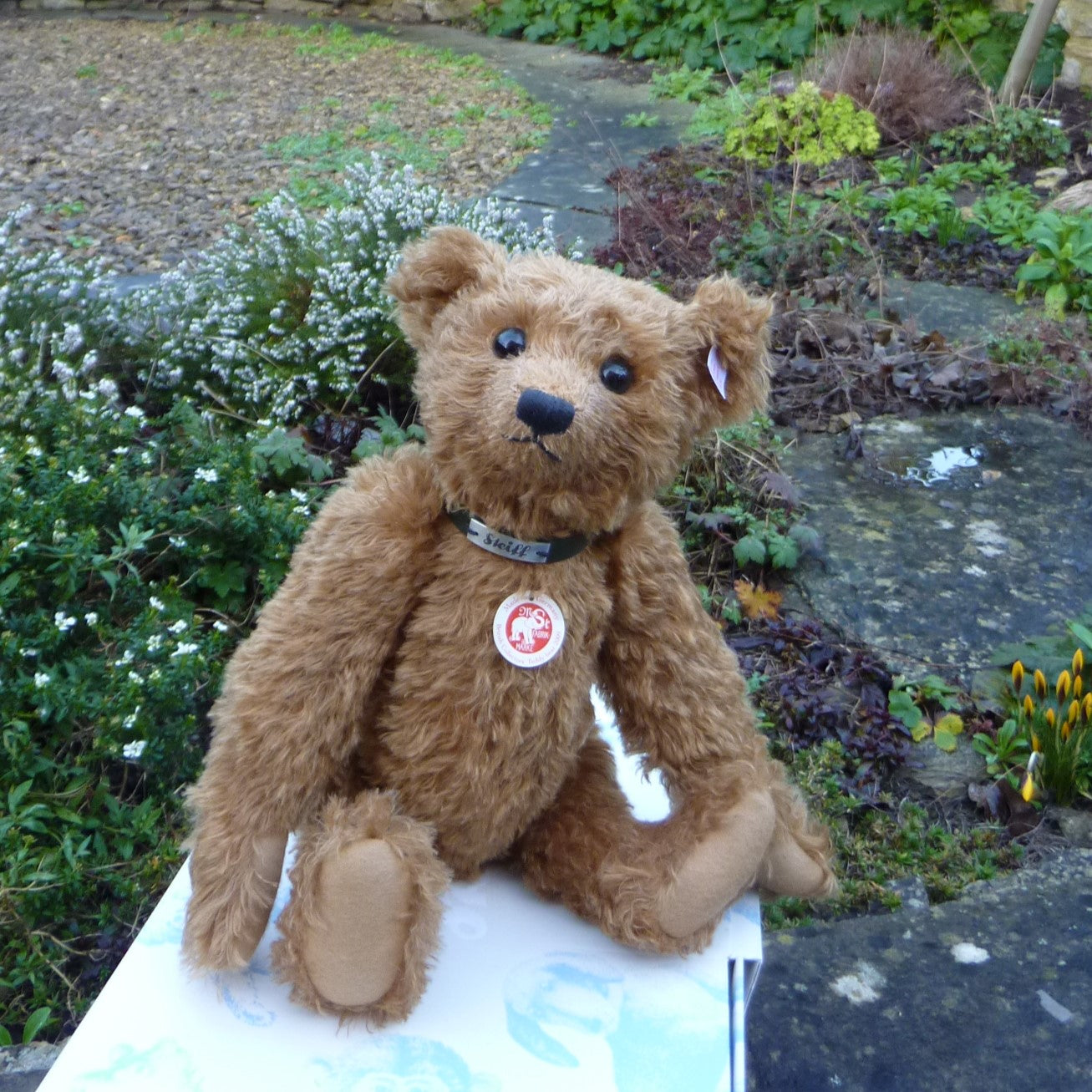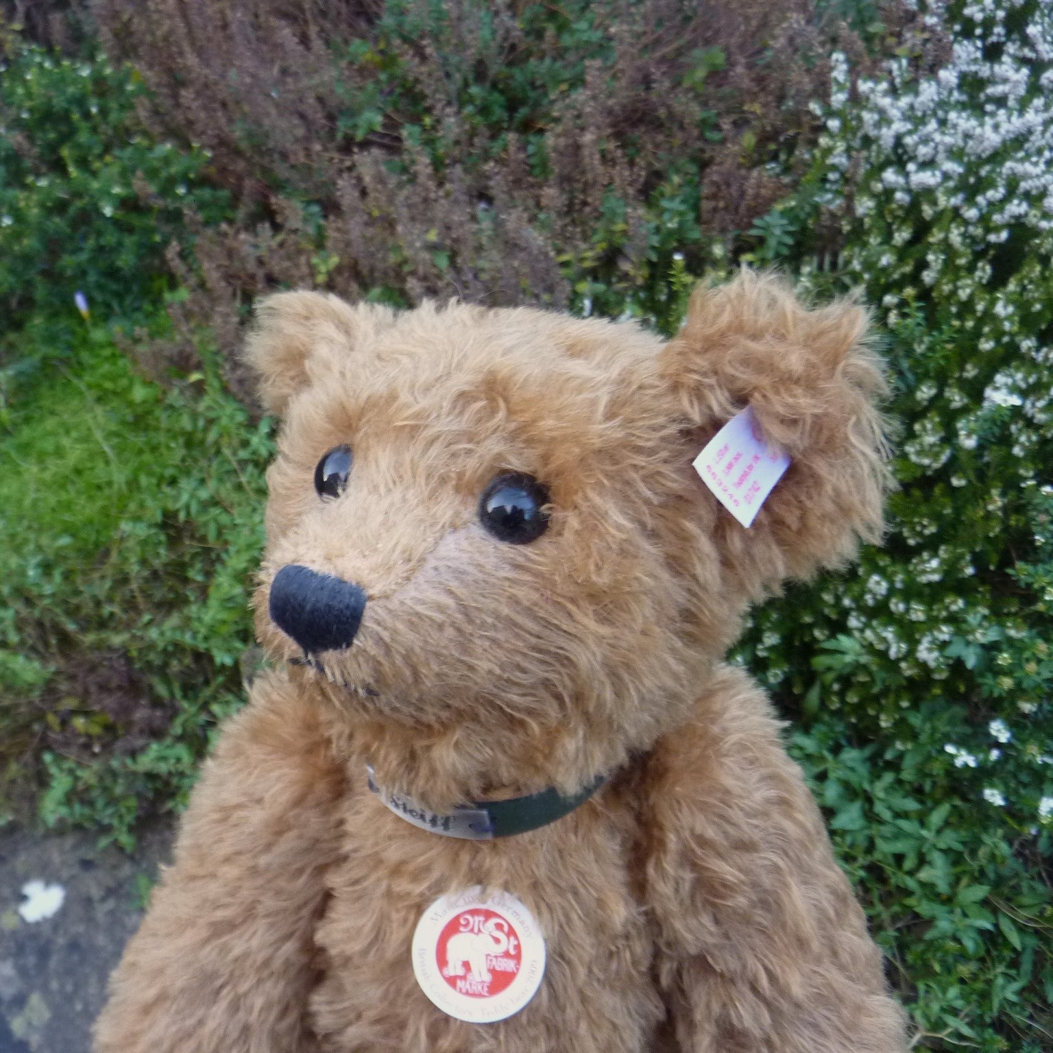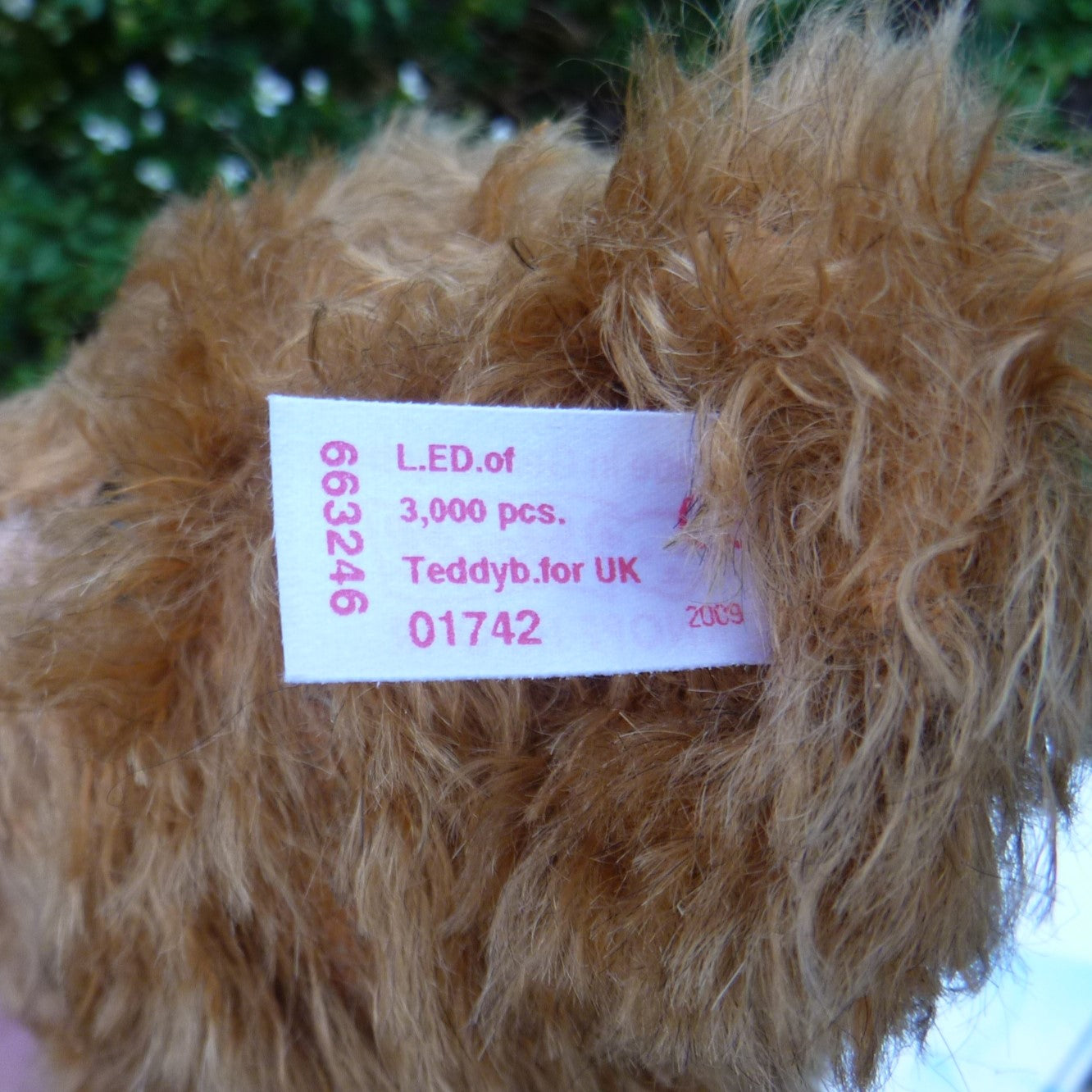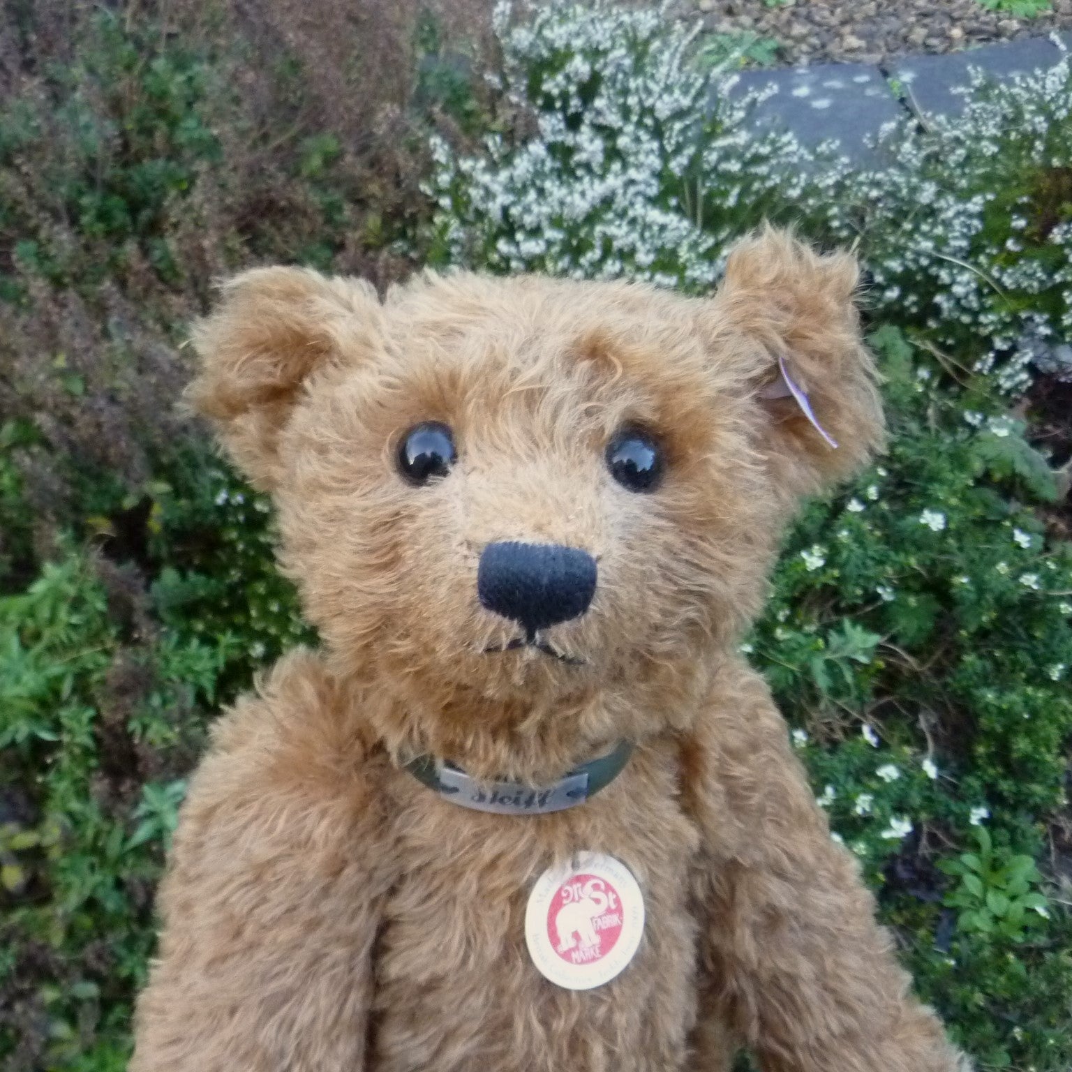 This handsome, traditional Steiff bear is made of swirly and distressed, reddish brown mohair with large black button eyes and felt paw pads. He wears a green leather collar with a Steiff plate (see photo) and growls when tipped backwards. Number 1742 of the edition, he is as new with box and certificate.