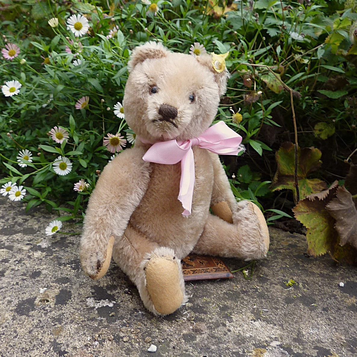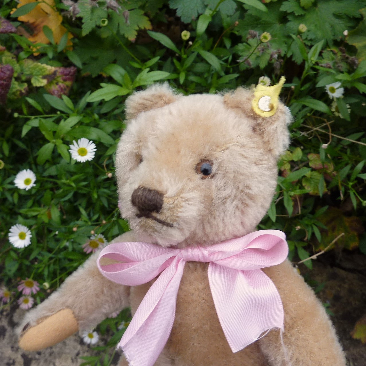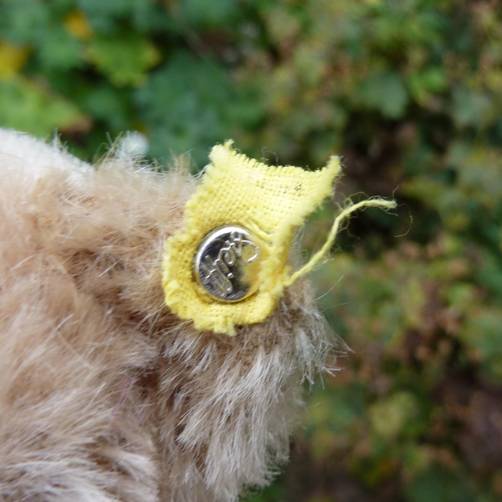 This small caramel mohair Steiff Teddy has brown and black plastic eyes and is traditionally stuffed with wood shavings. He is in excellent condition with shiny button in ear and remnant of ear tag. Nice bear.