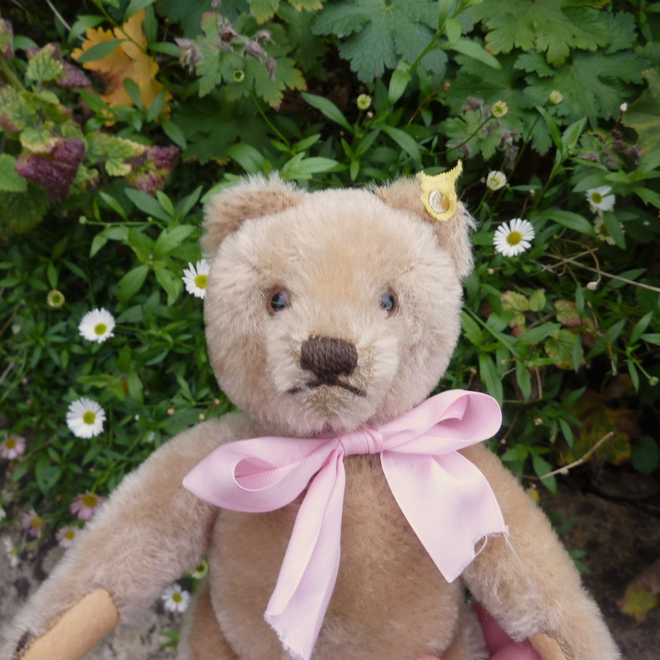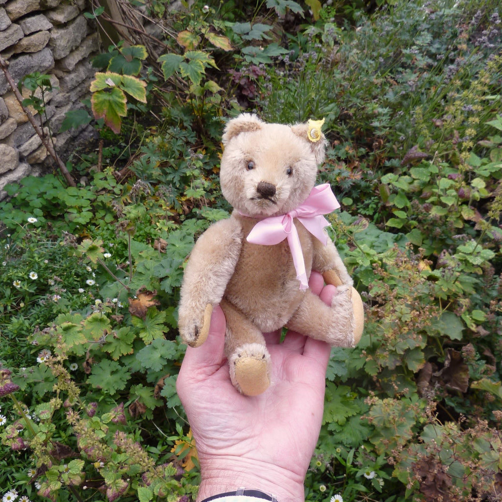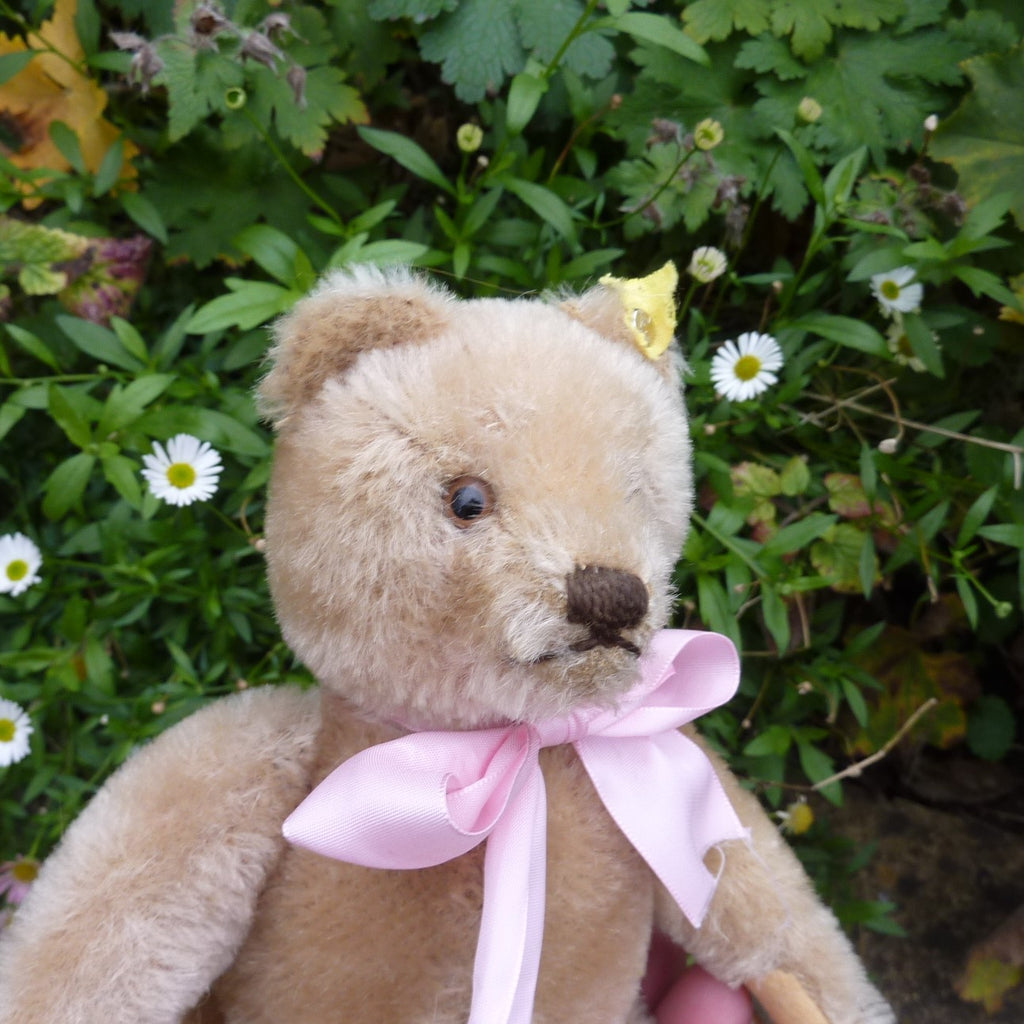 This small caramel mohair Steiff Teddy has brown and black plastic eyes and is traditionally stuffed with wood shavings. He is in excellent condition with shiny button in ear and remnant of ear tag. Nice bear.