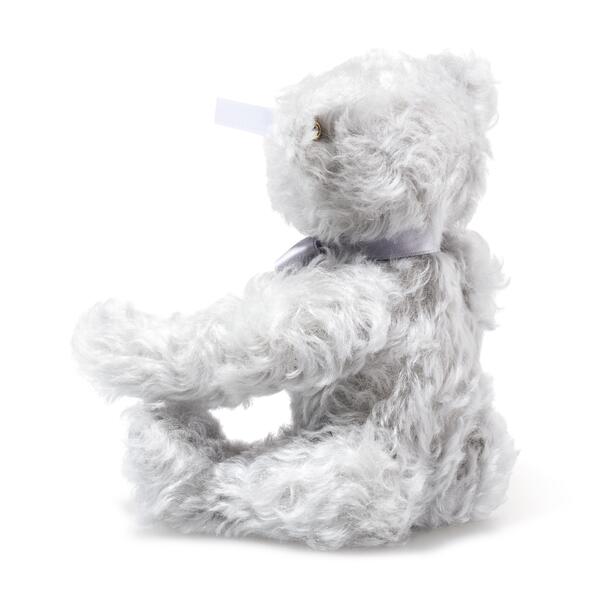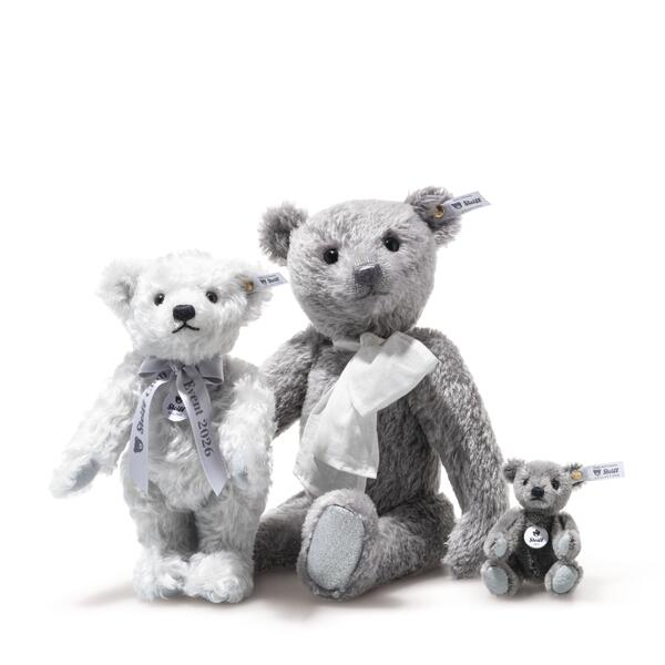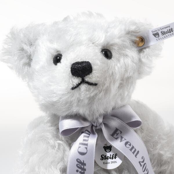 The 2026 Steiff Event Teddy bear is crafted from top quality mohair, in a soft grey tone with a delicate bluish shimmer. He is five-way jointed, and has a carefully stitched nose and mouth, lending him a gentle, affectionate expression. A pale grey satin bow with a subtle print completes the elegant look.