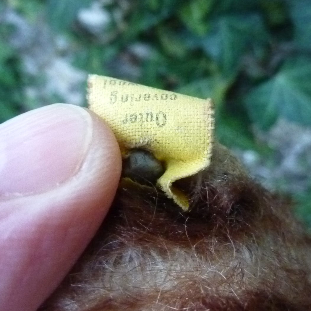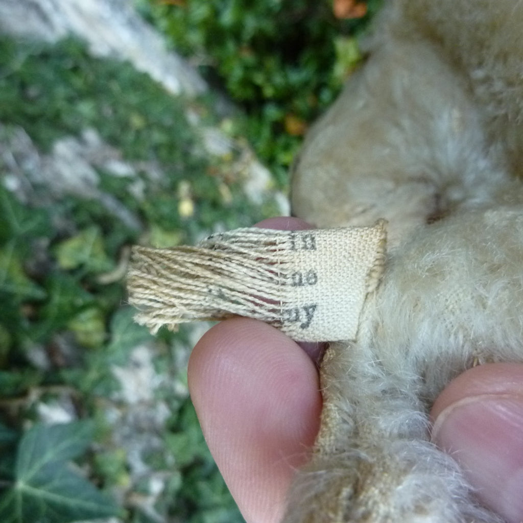 A little play-worn but charming, this Molly is made of off-white and brown-tipped mohair with large brown and black glass eyes. With button, ear tag, (worn) US Zone label and very sweet face. Stand not included.
