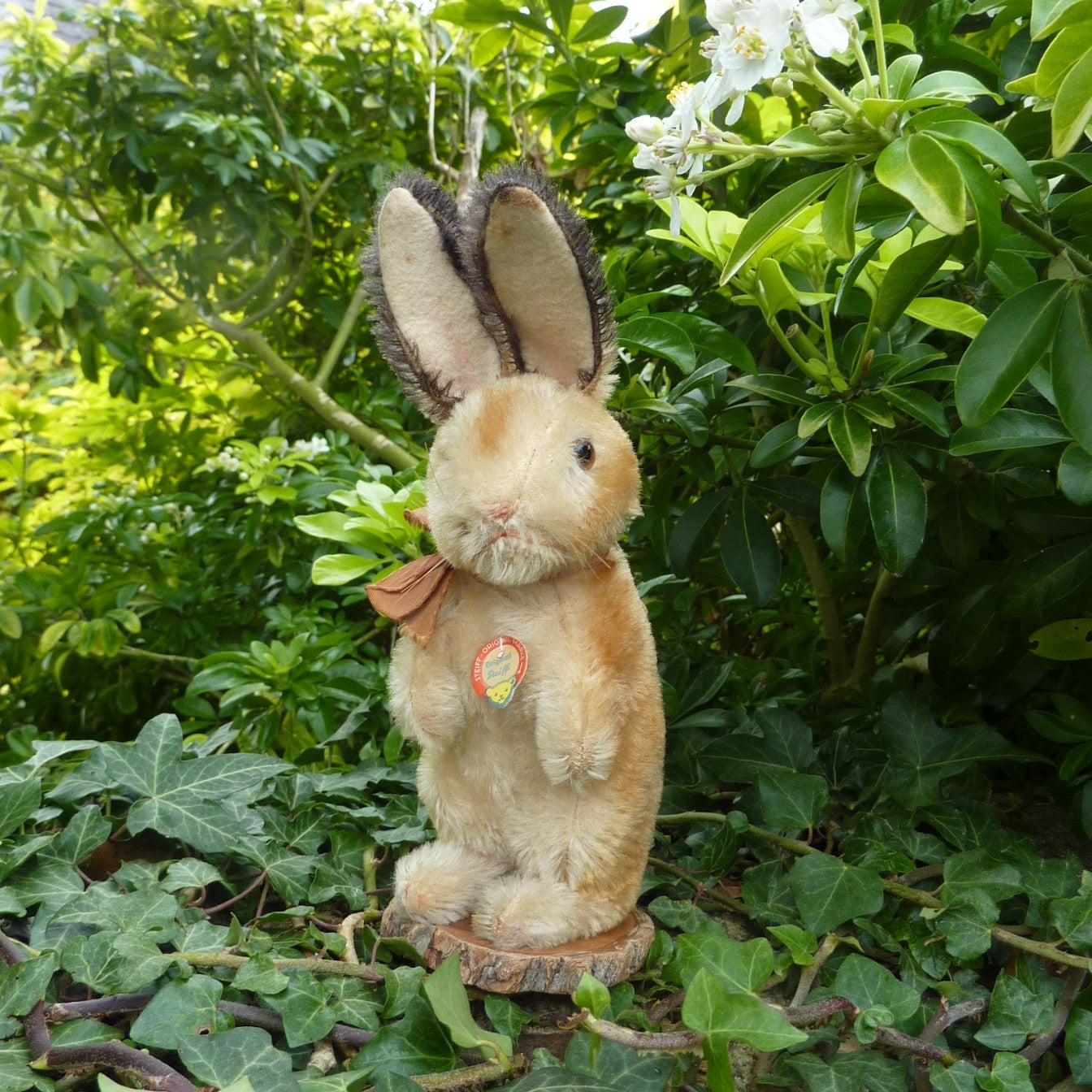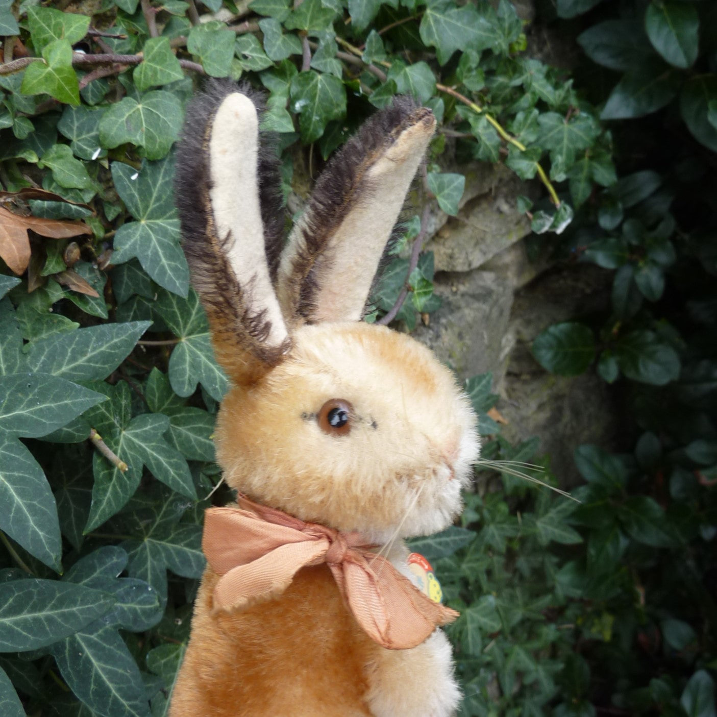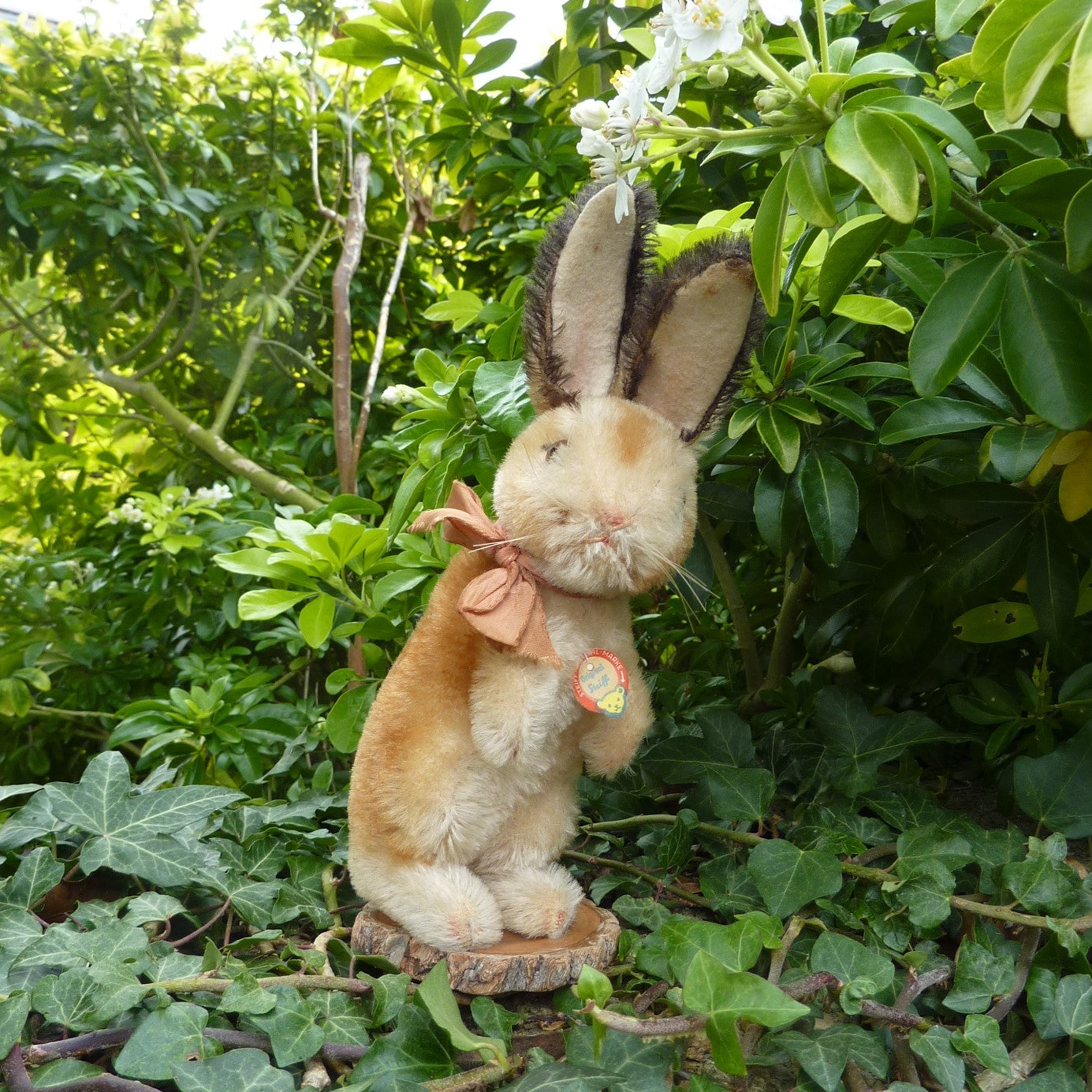 Made of warm white mohair with delicately airbrushed reddish brown and charcoal airbrushed markings, this lovely standing rabbit has brown and black glass eyes, felt inner ears and white whiskers. Jointed at the neck and traditionally filled with wood shavings, he has no button but is in very good condition with, chest tag and original ribbon, Good colouring and a sweet face.