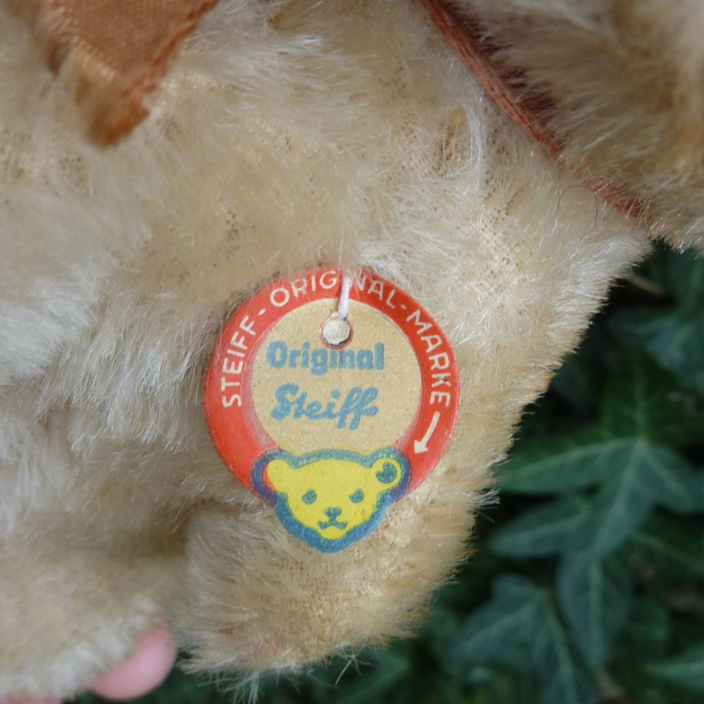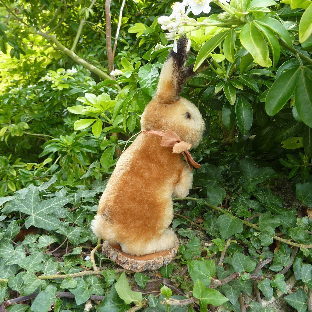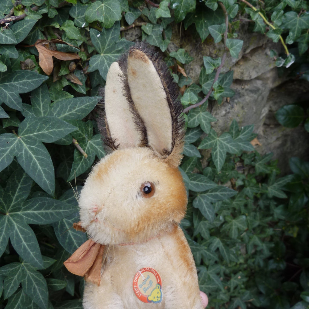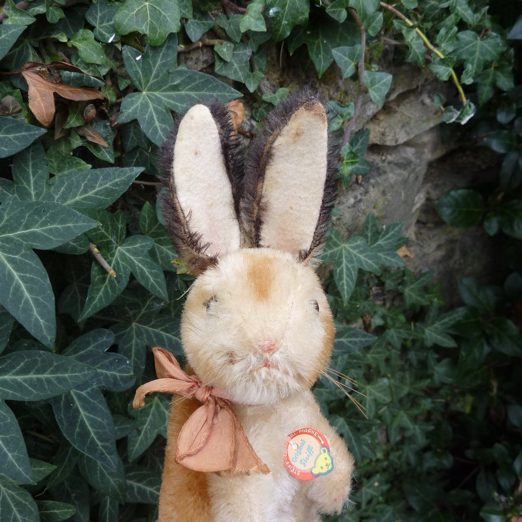 Made of warm white mohair with delicately airbrushed reddish brown and charcoal airbrushed markings, this lovely standing rabbit has brown and black glass eyes, felt inner ears and white whiskers. Jointed at the neck and traditionally filled with wood shavings, he has no button but is in very good condition with, chest tag and original ribbon, Good colouring and a sweet face.